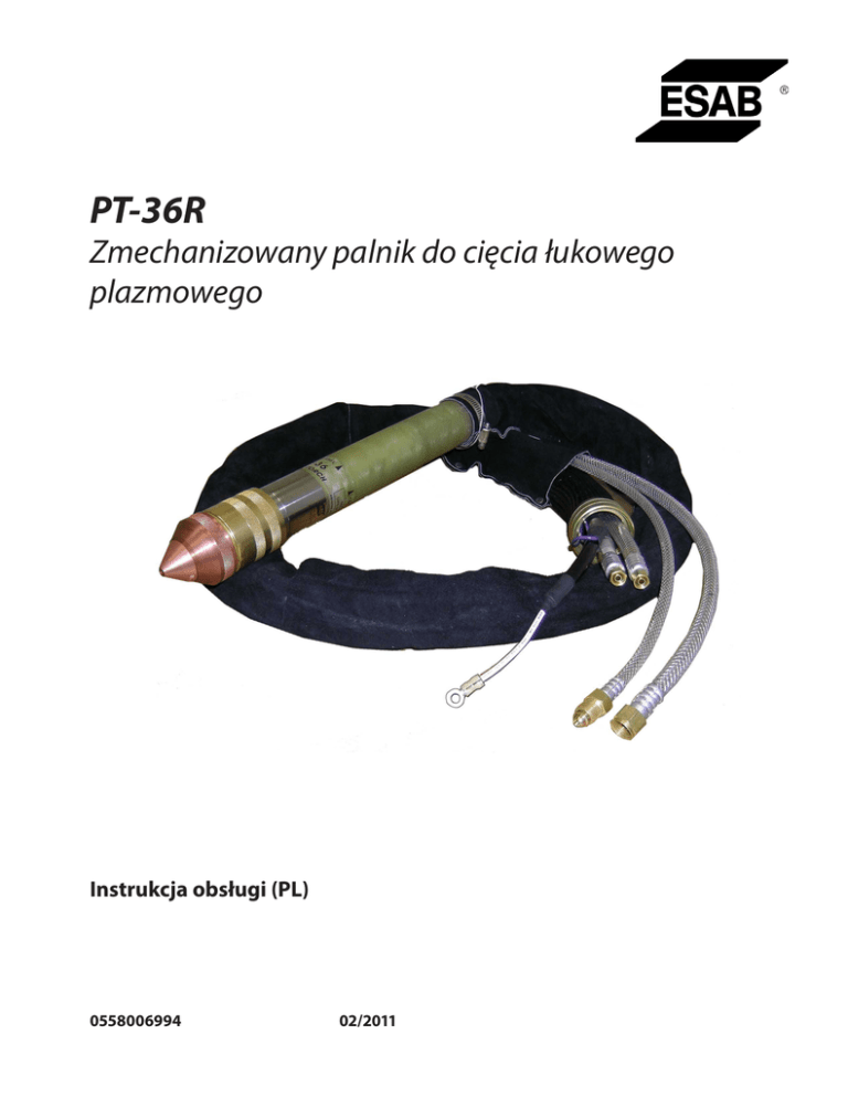 PT-36R Zmechanizowany palnik do cięcia łukowego plazmowego Instrukcja obsługi (PL) 0558006994 02/2011 Należy się upewnić, że operator otrzyma poniższe informacje. Można otrzymać dodatkowe kopie od dostawcy. przestroga Niniejsze INSTRUKCJE są przeznaczone dla doświadczonych operatorów. W przypadku niepełnego obeznania z zasadami działania oraz z praktykami bezpieczeństwa związanymi ze spawaniem łukowym oraz dotyczącymi sprzętu służącego do cięcia, wskazane jest przeczytanie naszej broszury „Środki oraz praktyki bezpieczeństwa podczas łukowego spawania, cięcia oraz żłobienia”, formularz 52-529. Osobom niewykwalifikowanym NIE zezwala się na instalowanie, obsługiwanie ani dokonywanie konserwacji niniejszego sprzętu. NIE wolno rozpoczynać instalacji lub pracy ze sprzętem bez uprzedniego przeczytania oraz całkowitego zrozumienia niniejszych instrukcji. W przypadku niecałkowitego zrozumienia niniejszych instrukcji, należy skontaktować się z dostawcą w celu uzyskania dalszych informacji. Przed rozpoczęciem instalacji lub pracy ze sprzętem należy zapoznać się ze Środkami ostrożności. ODPOWIEDZIALNOŚĆ UŻYTKOWNIKA Sprzęt ten będzie funkcjonował zgodnie z opisem zawartym w niniejszej instrukcji obsługi oraz zgodnie z dołączonymi etykietkami i/lub wkładkami jeśli instalacja, praca, konserwacja oraz naprawy przeprowadzane będą zgodnie z dostarczonymi instrukcjami. Sprzęt musi być okresowo sprawdzany. Nie należy używać sprzętu działającego wadliwie lub niewłaściwie konserwowanego. Części zepsute, brakujące, zużyte, odkształcone lub zanieczyszczone muszą być niezwłocznie wymienione. Producent zaleca wystosowanie telefonicznej lub pisemnej prośby o poradę do autoryzowanego dystrybutora, od którego został zakupiony sprzęt, czy naprawa lub wymiana części jest konieczna. Nie należy przerabiać całego sprzętu ani żadnej z jego części składowych bez uprzedniego pisemnego zezwolenia producenta. Użytkownik ponosi wyłączną odpowiedzialność za jakiekolwiek usterki spowodowane niewłaściwym użytkowaniem, wadliwą konserwacją, uszkodzeniem, niewłaściwą naprawą lub przeróbkami nie przeprowadzonymi przez producenta lub przez osoby przez niego wyznaczone. NALEŻY PRZECZYTAĆ ORAZ ZROZUMIEĆ INSTRUKCJĘ OBSŁUGI PRZED INSTALOWANIEM LUB PRACĄ. CHROŃ SIEBIE I INNYCH! 2 spis treści Rozdział / Tytuł Strona 1.0 Środki ostrożności . . . . . . . . . . . . . . . . . . . . . . . . . . . . . . . . . . . . . . . . . . . . . . . . . . . . . . . . . . . . . . . . . . . . . . . . . . . . . . . . . . . . 5 2.0 Opis . . . . . . . . . . . . . . . . . . . . . . . . . . . . . . . . . . . . . . . . . . . . . . . . . . . . . . . . . . . . . . . . . . . . . . . . . . . . . . . . . . . . . . . . . . . . . . . . . . 7 2.1 Informacje ogólne . . . . . . . . . . . . . . . . . . . . . . . . . . . . . . . . . . . . . . . . . . . . . . . . . . . . . . . . . . . . . . . . . . . . . . . . . . . . . . 7 2.2 Zakres . . . . . . . . . . . . . . . . . . . . . . . . . . . . . . . . . . . . . . . . . . . . . . . . . . . . . . . . . . . . . . . . . . . . . . . . . . . . . . . . . . . . . . . . . . 7 2.3 Dostępne opcje pakietu . . . . . . . . . . . . . . . . . . . . . . . . . . . . . . . . . . . . . . . . . . . . . . . . . . . . . . . . . . . . . . . . . . . . . . . . . 7 2.4 Akcesoria opcjonalne: . . . . . . . . . . . . . . . . . . . . . . . . . . . . . . . . . . . . . . . . . . . . . . . . . . . . . . . . . . . . . . . . . . . . . . . . . . . 7 2.5 Specyfikacja techniczna PT-36 . . . . . . . . . . . . . . . . . . . . . . . . . . . . . . . . . . . . . . . . . . . . . . . . . . . . . . . . . . . . . . . . . . 11 3.0 Instalacja . . . . . . . . . . . . . . . . . . . . . . . . . . . . . . . . . . . . . . . . . . . . . . . . . . . . . . . . . . . . . . . . . . . . . . . . . . . . . . . . . . . . . . . . . . . . 13 3.1 Podłączenie palnika do systemu plazmowego . . . . . . . . . . . . . . . . . . . . . . . . . . . . . . . . . . . . . . . . . . . . . . . . . . . 13 3.2 Mocowanie palnika na maszynie . . . . . . . . . . . . . . . . . . . . . . . . . . . . . . . . . . . . . . . . . . . . . . . . . . . . . . . . . . . . . . . . 15 4.0 Obsługa . . . . . . . . . . . . . . . . . . . . . . . . . . . . . . . . . . . . . . . . . . . . . . . . . . . . . . . . . . . . . . . . . . . . . . . . . . . . . . . . . . . . . . . . . . . . . 17 4.1 Ustawianie . . . . . . . . . . . . . . . . . . . . . . . . . . . . . . . . . . . . . . . . . . . . . . . . . . . . . . . . . . . . . . . . . . . . . . . . . . . . . . . . . . . . . 19 4.2 Jakość cięcia . . . . . . . . . . . . . . . . . . . . . . . . . . . . . . . . . . . . . . . . . . . . . . . . . . . . . . . . . . . . . . . . . . . . . . . . . . . . . . . . . . . 19 4.3 Przejścia robocze palnika . . . . . . . . . . . . . . . . . . . . . . . . . . . . . . . . . . . . . . . . . . . . . . . . . . . . . . . . . . . . . . . . . . . . . . . 24 5.0 Konserwacja . . . . . . . . . . . . . . . . . . . . . . . . . . . . . . . . . . . . . . . . . . . . . . . . . . . . . . . . . . . . . . . . . . . . . . . . . . . . . . . . . . . . . . . . . 25 5.1 Wstęp . . . . . . . . . . . . . . . . . . . . . . . . . . . . . . . . . . . . . . . . . . . . . . . . . . . . . . . . . . . . . . . . . . . . . . . . . . . . . . . . . . . . . . . . . 25 5.2 Demontaż przedniej części palnika . . . . . . . . . . . . . . . . . . . . . . . . . . . . . . . . . . . . . . . . . . . . . . . . . . . . . . . . . . . . . 26 5.3 Demontaż przedniej części palnika (dla grubych płyt produkcyjnych) . . . . . . . . . . . . . . . . . . . . . . . . . . . . 29 5.4 Montaż przedniej części palnika . . . . . . . . . . . . . . . . . . . . . . . . . . . . . . . . . . . . . . . . . . . . . . . . . . . . . . . . . . . . . . . . 32 5.5 Montaż przedniej części palnika (dla grubych płyt produkcyjnych) . . . . . . . . . . . . . . . . . . . . . . . . . . . . . . . 3
