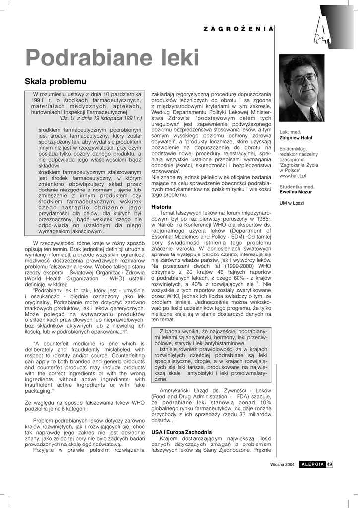 Z A G R O ¯ E N I A Podrabiane leki Skala problemu W rozumieniu ustawy z dnia 10 paŸdziernika 199 1 r. o œrod kac h far mac eut ycz nyc h, materia³ach medycznych, aptekach, hurtowniach i Inspekcji Farmaceutycznej (Dz. U. z dnia 19 listopada 1991 r.) · œrodkiem farmaceutycznym podrobionym jest œrodek farmaceutyczny, który zosta³ sporz¹-dzony tak, aby wyda³ siê produktem innym ni¿ jest w rzeczywistoœci, przy czym posiada tylko pozory danego produktu, a nie odpowiada jego w³aœciwoœciom b¹dŸ sk³adowi, · œrodkiem farmaceutycznym sfa³szowanym jest œrodek farmaceutyczny, w którym zmieniono obowi¹zuj¹cy sk³ad przez dodanie niezgodne z normami, ujêcie lub zmieszanie z innym produktem czy œrodkiem farmaceutycznym, wskutek czego nast¹pi³o obni¿enie jego przydatnoœci dla celów, dla których by³ przeznaczony, b¹dŸ wskutek czego nie odpo-wiada on ustalonym dla niego wymaganiom jakoœciowym . W rzeczywistoœci ró¿ne kraje w ró¿ny sposób opisuj¹ ten termin. Brak jednolitej definicji utrudnia wymianê informacji, a przede wszystkim ogranicza mo¿liwoœæ dostrze¿enia prawdziwych rozmiarów problemu fa³szowania leków. Wobec takiego stanu rzeczy eksperci Œwiatowej Organizacji Zdrowia (World Health Organization - WHO) ustalili definicjê, w której: "Podrabiany lek to taki, który jest - umyœlnie i oszukañczo - b³êdnie oznaczony jako lek oryginalny. Podrabianie mo¿e dotyczyæ zarówno markowych produktów, jak i leków generycznych. Mo¿e polegaæ na wytwarzaniu produktów o sk³adnikach prawid³owych lub nieprawid³owych, bez sk³adników aktywnych lub z niewielk¹ ich iloœci¹, lub w podrobionych opakowaniach". “A counterfeit medicine is one which is deliberately and fraudulently mislabeled with respect to identity and/or source. Counterfeiting can apply to both branded and generic products and counterfeit products may include products with the correct ingredients or with the wrong ingredients, without active ingredients, with insufficient active ingredients or with fake packaging.” Ze wzglêdu na sposób fa³szowania leków WHO podzieli³a je na 6 kategorii: Problem podrabianych leków dotyczy zarówno krajów rozwiniêtych, jak i rozwijaj¹cych siê, choæ tak naprawdê jego zakres nie jest dok³adnie znany, jako ¿e do tej pory nie by³o ¿adnych badañ prowadzonych na skalê ogólnoœwiatow¹. Prz yjê te w pra wie pol ski m roz wi¹ zan ia zak³adaj¹ rygorystyczn¹ procedurê dopuszczania produktów leczniczych do obrotu i s¹ zgodne z miêdzynarodowymi kryteriami w tym zakresie. Wed³ug Departamentu Polityki Lekowej Ministerstwa Zdrowia: "podstawowym celem tych uregulowañ jest zapewnienie podwy¿szonego poziomu bezpieczeñstwa stosowania leków, a tym samym wysokiego poziomu ochrony zdrowia obywateli", a "produkty lecznicze, które uzyskaj¹ pozwolenie na dopuszczenie do obrotu na podstawie nowej procedury rejestracyjnej, spe³niaj¹ wszystkie ustalone przepisami wymagania odnoœnie jakoœci, skutecznoœci i bezpieczeñstwa stosowania". Nie znane s¹ jednak jakiekolwiek oficjalne badania maj¹ce na celu sprawdzenie obecnoœci podrabianych medykamentów na polskim rynku i wielkoœci tego problemu. Historia Temat fa³szywych leków na forum miêdzynarodowym by³ po raz pierwszy poruszony w 1985r. w Nairobi na Konferencji WHO dla ekspertów ds. racjonalnego u¿ycia leków (Department of Essential Medicines and Policy - EDM). Od tamtej pory œwiadomoœæ istnienia tego problemu znacznie wzros³a. W doniesieniach œwiatowych sprawa ta wystêpuje bardzo czêsto, interesuj¹ siê ni¹ zarówno w³adze pañstw, jak i wytwórcy leków. Na przestrzeni dwóch lat (1999-2000) WHO otrzyma³o z 20 krajów 46 tajnych raportów o podrabianych lekach, z czego 60% - z krajów rozwiniêtych, a 40% z rozwijaj¹cych siê 2. Nie wszystkie z tych raportów zosta³y zweryfikowane przez WHO, jednak ich liczba œwiadczy o tym, ze problem istnieje. Jednoczeœnie mo¿na wnioskowaæ po iloœci uczestników tego programu, ¿e tylko nieliczne kraje s¹ w stanie dostarczyæ danych na ten temat. Lek. med. Zbigniew Ha³at Epidemiolog, redaktor naczelny czasopisma "Zagro¿enia ¯ycia w Polsce" www.halat.pl Studentka med. Ewelina Mazur UM w £odzi Z badañ wynika, ¿e najczêœciej podrabianymi lekami s¹ antybiotyki, hormony, leki przeciwbólowe, sterydy i leki antyhistaminowe. Istnieje równie¿ prawid³owoœæ, ¿e w krajach rozwiniêtych czêœciej podrabiane s¹ leki specjalistyczne, drogie, a w krajach rozwijaj¹cych siê leki tañsze, produkowane na najwiêksz¹ skalê antybiotyki i leki przeciwmalaryczne. Amerykañski Urz¹d ds. ¯ywnoœci i Leków (Food and Drug Administration - FDA) szacuje, ¿e podrabiane leki stanowi¹ ponad 10% globalnego rynku farmaceutyków, co daje roczne przychody z ich sprzeda¿y rzêdu 32 miliardów dolarów . USA i Europa Zachodnia Kraj em dost arcz aj¹c ym najw iêks z¹ iloœ æ danyc h doty cz¹cy ch zma gañ z p roblem em fa³szywych leków s¹ Stany Zjednoczone. Prê¿nie Wiosna 2004 A L E R G I A 49 Z A G R O ¯ E N I A dzia³aj¹ca i bardzo restrykcyjna FDA publikuje bardzo liczne raporty o podrabianych, nielicencjonowanych lub nielegalnie importowa-nych lekach. Komisarz FDA, Mark B. McClellan czêsto podejmuje dzia³ania maj¹ce na celu wymianê informacji i udoskonalenie siatki organizacji chroni¹cych amerykañskich obywateli przed zalewem fa³szywych leków. Liczba œledztw w sprawie fa³szowania leków prowadzonych przez FDA w latach 90-tych wynosi³a œrednio 5 rocznie. Pocz¹tek XXI wieku przyniós³ kilkukrotny wzrost, z 22 sprawami w 2002r.. W rzeczywistoœci McClellan ocenia prawdopodobieñstwo nabycia podrobionego leku w aptece na nie wiêcej ni¿ 1%, jednak¿e przestrzega przed innymi ni¿ apteczne formami zaopatrywania siê w medykamenty. Przyczyn nasilenia problemu upatruje siê w szybkim rozwoju niekontrolowanej sprzeda¿y farmaceutyków przez internet. Kolorowe witryny zachêcaj¹ do kupowania du¿o tañszych œrodk