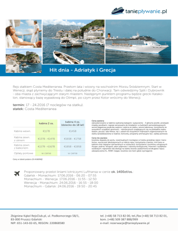 Hit dnia - Adriatyk i Grecja Rejs statkiem Costa Mediterranea. Przełom lata i wiosny na wschodnim Morzu Śródziemnym. Start w Wenecji, skąd płyniemy do Triestu i dalej na południe do Chorwacji. Tam odwiedzimy Split i Dubrownik - oba miasta z zachwycającym starym miastem. Następnym punktem programu będzie grecki Katakolon, stanowący bazę wypadową do Olimpii, po czym przez Kotor wrócimy do Wenecji. termin: 17 - 24.2016 (7 noclegów na statku). statek: Costa Mediterranea kabina 2 os. kabina 4 os. (dziecko do 18 lat) Kabina wewn. €1178 €1458 Kabina zewn. z oknem €1378 - €1478 €1658 - €1758 Kabina zewn. z balkonem €1578 - €1678 €1858 - €1958 w cenie w cenie Opłaty portowe Cena zawiera: zakwaterowanie w kabinie wybranej kategorii; wyżywienie - 3 główne posiłki, przekąski między posiłkami; napoje serwowane do śniadania i w bufetach samoobsługowych; serwis bagażowy podczas wejścia i zejścia ze statku; serwis kabinowy; korzystanie ze wszystkich urządzeń sportowo - rekreacyjnych znajdujących się na pokładzie statku (basen, jacuzzi, sala fitness, itp.); udział we wszystkich imprezach organizowanych na statku (przedstawienia w teatrze, koncerty, programy animacyjne itp.), opłaty portowe. Cena nie zawiera: kosztów dojazdu do portu; ewentualnych noclegów w hotelu przed/po rejsie i transferów; wycieczek fakultatywnych w trakcie rejsu; korzystania z barów, mini baru w kabinie oraz napojów zamawianych w restauracji; korzystania z punktów usługowych (fryzjer, pralnia, fotograf, salon piękności i odnowy biologicznej, internet) i wydatków osobistych; napiwków dla obsługi na statku (kwota uzależniona od długości rejsu); ubezpieczenia KL, NNW i bagaż, kosztów wiz (tam gdzie wymagane). Ceny w tabeli podano ZA KABINĘ! Proponowany przelot liniami lotniczymi Lufthansa w cenie ok. 1400zł/os.: Gdańsk - Monachium: 17.06.2016 - 06:20 - 07:55 Monachium - Wenecja: 17.06.2016 - 11:55 - 12:50 Wenecja - Monachium: 24.06.2016 - 16:55 - 18:00 Monachium - Gdańsk: 24.06.2016 - 19:50 - 20:45 Zbigniew Kąkol RejsClub.pl, ul. Podkomorzego 58/1, 83-000 Pruszcz Gdański NIP: 651-143-02-65, REGON: 220868580 tel. (+48) 58 713 82 00, tel./fax (+48) 58 713 82 01, kom. (+48) 509 387 888/999 e-mail: [email protected]