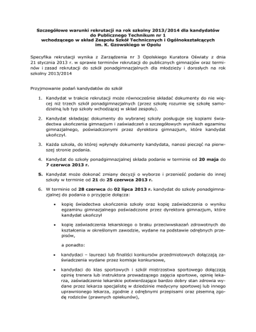 Szczegółowe warunki rekrutacji na rok szkolny 2013/2014 dla kandydatów do Publicznego Technikum nr 1 wchodzącego w skład Zespołu Szkół Technicznych i Ogólnokształcących im. K. Gzowskiego w Opolu Specyfika rekrutacji wynika z Zarządzenia nr 3 Opolskiego Kuratora Oświaty z dnia 21 stycznia 2013 r. w sprawie terminów rekrutacji do publicznych gimnazjów oraz terminów i zasad rekrutacji do szkół ponadgimnazjalnych dla młodzieży i dorosłych na rok szkolny 2013/2014 Przyjmowanie podań kandydatów do szkół 1. Kandydat w trakcie rekrutacji może równocześnie składać dokumenty do nie więcej niż trzech szkół ponadgimnazjalnych (przez szkołę rozumie się szkołę samodzielną lub typ szkoły wchodzącej w skład zespołu). 2. Kandydat składając dokumenty do wybranej szkoły posługuje się kopiami świadectwa ukończenia gimnazjum i zaświadczeń o szczegółowych wynikach egzaminu gimnazjalnego, poświadczonymi przez dyrektora gimnazjum, które kandydat ukończył. 3. Każda szkoła, do której wpłynęły dokumenty kandydata, nanosi pieczęć na pierwszej stronie podania. 4. Kandydat do szkoły ponadgimnazjalnej składa podanie w terminie od 20 maja do 7 czerwca 2013 r. 5. Kandydat może dokonać zmiany decyzji o wyborze i przenieść podanie do innej szkoły w terminie od 21 do 25 czerwca 2013 r. 6. W terminie od 28 czerwca do 02 lipca 2013 r. kandydat do szkoły ponadgimnazjalnej do podania o przyjęcie dołącza: kopię świadectwa ukończenia szkoły oraz kopię zaświadczenia o wyniku egzaminu gimnazjalnego poświadczone przez dyrektora gimnazjum, które kandydat ukończył kopię zaświadczenia lekarskiego o braku przeciwwskazań zdrowotnych do kształcenia w określonym zawodzie, wydane na podstawie odrębnych przepisów, a ponadto: kandydaci – laureaci lub finaliści konkursów przedmiotowych dołączają zaświadczenia wydane przez komisje konkursowe, kandydaci do klas sportowych i szkół mistrzostwa sportowego dołączają opinię trenera lub instruktora prowadzącego zajęcia sportowe, opinię lekarza, zaświadczenie lekarskie potwierdzające bardzo dobry stan zdrowia wydane przez lekarza specjalistę w dziedzinie medycyny sportowej lub innego uprawnionego lekarza, zgodnie z odrębnymi przepisami oraz pisemną zgodę rodziców (prawnych opiekunów), kandydaci do klas specjalnych i integracyjnych dołączają skierowanie wydane przez organ prowadzący. TERMINARZ REKRUTACJI NA ROK SZKOLNY 2013/2014 1. Składanie podań przez kandydatów do szkół ponadgimnazjalnych: 20 maja – 07 czerwca 2013 r. 2. Możliwość zmiany decyzji kandydata o wyborze i przeniesieniu podania do innej szkoły: 21 czerwca – 25 czerwca 2013 r. 3. Składanie przez kandydatów do wybranej szkoły kopii świadectwa ukończenia szkoły, kopii zaświadczenia o wyniku egzaminu gimnazjalnego oraz innych wymaganych dokumentów: 28 czerwca – 02 lipca 2013 r. 4. Ogłoszenie list kandydatów zakwalifikowanych do szkół ponadgimnazjalnych: 03 lipca 2013 r. 5. Potwierdzenie woli podjęcia nauki w danej szkole oraz dostarczenie oryginałów dokumentów: do 05 lipca 2013 r. 6. Ogłoszenie list uczniów przyjętych do poszczególnych szkół i podanie informacji o wolnych miejscach: 08 lipca 2013 do godz.12.00 r. 7. Przeprowadzenie rekrutacji uzupełniającej: do 10 lipca 2013 r. 8. Ogłoszenie list przyjętych uczniów w wyniku rekrutacji uzupełniającej: 11 lipca 2013 r. 9. Rekrutacja dodatkowa: 19 sierpnia – 23 sierpnia 2013 r. 10. Ostateczne ogłoszenie list uczniów przyjętych do oddziałów klasy I szkół wszystkich typów: 30 sierpnia 2013 r. Warunki rekrutacji: I. Warunki rekrutacji: Przyjmuje się maksymalną liczbę punktów, za wyniki egzaminu w ostatniej klasie gimnazjum, ustaloną przez Okręgową Komisję Egzaminacyjną. Maksymalna liczba punktów za egzamin może wynieść 100 tj. po 20 pkt. maksymalnie za każdą z części tego egzaminu. 1% w każdym z zakresów odpowiada 0,2 pkt. a). rekrutacja obejmuje nabór do wszystkich oddziałów klas pierwszych, b). do każdej klasy pierwszej przyjmuje się maksymalnie 30 uczniów, z możliwością zwiększenia c). kandydat ubiegający się o przyjęcie do szkoły może uzyskać maksymalnie 200 pkt. w tym: 100 pkt. za wynik egzaminu w ostatniej klasie gimnazjum, 75 pkt. za oceny z języka polskiego i wybrane zajęcia edukacyjne, które kandydat wskaże na padaniu do szkoły, 25 pkt. za inne osiągnięcia wymienione w świadectwie ukończenia gimnazjum, które uwzględnia się w procesie rekrutacji, a które opisane są w kryteriach rekrutacji, w pkt. I c, d). o przyjęciu do szkoły decydować będzie suma punktów jaką uzyskał kandydat na podstawie kryteriów rekrutacji w ten sposób, że do poszczególnych klas szkoły będą przyjmowani kandydaci z największą liczb punktów do wyczerpania planowanego limitu miejsc w klasie, e). przyjmuje się minimalną liczbę punktów do poszczególnych klas Publicznego Technikum nr 1 technik geodeta 100 pkt., technik budownictwa – 95 pkt., technik architektury krajobrazu – 90 pkt., technik systemów i urządzeń energetyki odnawialnej – 90 pkt., technik drogownictwa – 90 pkt. f). w przypadku uzyskania równych wyników w postępowaniu kwalifikacyjnym, pierwszeństwo przyjęcia mają sieroty, kandydaci przebywający w placówkach opiekuńczo – wychowawczych oraz umieszczeni w rodzinach zastępczych, kandydaci z problemami zdrowotnymi, którzy mają opinię poradni psychologiczno – pedagogicznej w sprawie możliwości wyboru kształcenia ze względu na stan zdrowia kandydatów, oraz kandydaci o ukierunkowanych i udokumentowanych zdolnościach, którym ustalono indywidualny program lub tok nauki, g). w przypadku uzyskania równych wyników w postępowaniu kwalifikacyjnym, o ile nie zachodzą przypadki opisane w punkcie f), do szkoły przyjmowani będą wszyscy kandydaci - do klasy, w której są wolne miejsca, wskazanej przez komisję. II. Wszelkie wątpliwości dotycz