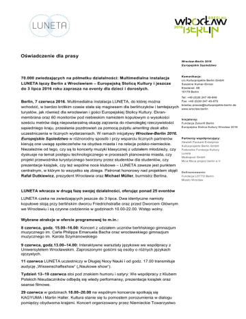 Oświadczenie dla prasy Wrocław-Berlin 2016 Europejskie Sąsiedztwo 70.000 zwiedzających na półmetku działalności: Multimedialna instalacja LUNETA łączy Berlin z Wrocławiem – Europejską Stolicą Kultury i jeszcze do 3 lipca 2016 roku zaprasza na eventy dla dzieci i dorosłych. Berlin, 7 czerwca 2016. Multimedialna instalacja LUNETA, do której można wchodzić, w bardzo krótkim czasie stała się magnesem dla berlińczyków i tamtejszych turystów, jak również dla wrocławian i gości Europejskiej Stolicy Kultury. Ekranmembrana oraz 60 monitorów pod niebieskim namiotem kopułowym o wysokości sześciu metrów dają niepowtarzalną okazję zajrzenia do równoległej rzeczywistości sąsiedniego kraju, przesłania pozdrowień za pomocą pulpitu airwriting desk albo uczestniczenia w licznych wydarzeniach. W ramach inicjatywy Wrocław-Berlin 2016. Europejskie Sąsiedztwo w różnorodny sposób i przy wsparciu licznych partnerów kierują one uwagę społeczeństw na obydwa miasta i na relacje polsko-niemieckie. Niezależnie od tego, czy są to koncerty muzyki klasycznej z udziałem młodzieży, czy dyskusje na temat postępu technologicznego w procesach planowania miasta, czy projekt przewodnika turystycznego tworzony przez studentów dla studentów, czy prezentacje książek, czy też wspólne noce klubowe – LUNETA zawsze jest punktem centralnym, w którym to wszystko się zbiega. Patronat honorowy nad projektem objęli Rafał Dutkiewicz, prezydent Wrocławia oraz Michael Müller, burmistrz Berlina. LUNETA wkracza w drugą fazę swojej działalności, oferując ponad 25 eventów LUNETA czeka na zwiedzających jeszcze do 3 lipca. Dwa identyczne namioty kopułowe stoją przy berlińskim dworcu Friedrichstraße oraz przed Dworcem Głównym we Wrocławiu i są czynne codziennie w godzinach 10.00-22.00. Wstęp wolny. Wybrane atrakcje w ofercie programowej to m.in.: 8 czerwca, godz. 15.00–16.00: Koncert z udziałem uczniów berlińskiego gimnazjum muzycznego im. Carla Philippa Emanuela Bacha oraz wrocławskiego gimnazjum muzycznego im. Karola Szymanowskiego 9 czerwca, godz.13.00–14.00: Interaktywne warsztaty językowe we współpracy z Uniwersytetem Wrocławskim. Zaproszonymi gośćmi są osoby o różnych językach ojczystych. 11 czerwca LUNETA uczestniczy w Długiej Nocy Nauki i od godz. 17.00 transmituje audycję „Wissenschaftsshow“ („Naukowe show“). Tydzień 13–19 czerwca stoi pod znakiem humoru i satyry: We współpracy z Klubem Polskich Nieudaczników odbędą się wtedy performansy, prezentacje książek oraz seanse filmowe. 29 czerwca w godzinach 18.00–20.00 na wspólnym koncercie spotkają się KAGYUMA i Martin Haller. Kultura stanie się tu pomostem porozumienia w dialogu pomiędzy obydwoma krajami. Koncert organizowany przez Niemieckie Towarzystwo Komunikacja: c/o Kulturprojekte Berlin GmbH Susanne Kumar-Sinner Klosterstr. 68 10179 Berlin Tel: +49 (0)30 247 49-849 Fax: +49 (0)30 247 49-879 [email protected] www.wroclaw.berlin Inicjatorzy: Fundacja Zukunft Berlin Europejska Stolica Kultury Wrocław 2016 Partnerzy współpracujący: Hewlett Packard Enterprise Kulturprojekte Berlin GmbH Federalna Fundacja Kultury Luneta Mediapool GmbH Mica Moca project berlin e.V. Dofinansowanie: Fundacja LOTTO Berlin Miasto Wrocław Kulturalno-Społeczne we Wrocławiu oraz Instytut Stosunków Zagranicznych stanowić będzie połączenie niemieckojęzycznych utworów Hallera z pogranicza muzyki pop, hip-hopu, elektro i soul z aranżacjami a capella wrocławskiej grupy Kagyuma. Pełny program zamieszczono na stronach: www.breslau.berlin oraz facebook.com/luneta2016. Idea LUNETY wyszła od artysty multimedialnego i jej kierownika artystycznego Volkmara Umlaufta. Inicjatywa Fundacji Zukunft Berlin, nakierowana na zbliżenie obydwu miast, stała się dla niego inspiracją do stworzenia dwóch przestrzeni, które zachęciłyby do wymiany audiowizualnej i bliższego wzajemnego poznania. LUNETA oparta jest na nowej koncepcji technologicznej opracowanej przez Hewlett Packard Enterprise we współpracy z firmą Intel. Rozwiązanie HPE to połączenie standardowych komponentów IT, które zapewnia wysokojakościowe wrażenia multimedialne bez konieczności ponoszenia większych nakładów. Wrocław-Berlin 2016. Europejskie Sąsiedztwo LUNETA jest jednym z kluczowych projektów w ramach inicjatywy Wrocław-Berlin 2016. Europejskie Sąsiedztwo. Wrocław jest Europejską Stolicą Kultury 2016. Jednocześnie obchodzimy 25-letni jubileusz podpisania polsko-niemieckiego traktatu o dobrym sąsiedztwie oraz partnerstwa miast pomiędzy Berlinem a Warszawą. Dla Fundacji Zukunft Berlin to okazja, by wspólnie z ESK Wrocław oraz wieloma partnerami zwrócić uwagę społeczeństw na relację łączącą obydwa miasta. Bogata oferta programowa obejmuje kursujący od niedawna Pociąg Kultury, cykl imprez In Between Festivals, wystawy, noce klubowe, koncerty, seanse filmowe oraz wiele innych wydarzeń. Więcej informacji na stronach : www.breslau.berlin lub www.wroclaw.berlin Wrocław-Berlin 2016. Europejskie Sąsiedztwo jest inicjatywą Fundacji Zukuft Berlin oraz Europejskiej Stolicy Kultury Wrocław 2016 realizowaną we współpracy z Hewlett Packard Enterprise, niemiecką Federalną Fundacją Kultury, Kulturprojekte Berlin GmbH, LUNETA, Mediapool GmbH oraz Mica Moca project berlin e.V. przy wsparciu Fundacji LOTTO Berlin oraz Miasta Wrocław. 2