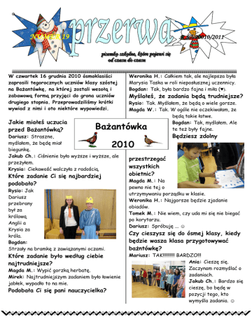 o NUMER 19 .R.SZ.20010/2011 ppiisseemmkkoo sszzkkoollnnee,, kkttóórree ppoojjaaw wii ssiięę oodd cczzaassuu ddoo cczzaassuu W czwartek 16 grudnia 2010 ósmoklasiści zaprosili tegorocznych uczniów klasy szóstej na Bażantówkę, na której zostali wesołą i zabawową formą przyjęci do grona uczniów drugiego stopnia. Przeprowadziliśmy krótki wywiad z nimi i oto niektóre wypowiedzi. Jakie miałeś uczucia przed Bażantówką? Weronika H.: Całkiem tak, ale najlepsza była Marysia Taska w roli nieposłusznej uczennicy. Bogdan: Tak, była bardzo fajna i miła (♥). Myślałeś, że zadania będą trudniejsze? Rysio: Tak. Myślałem, że będą o wiele gorsze. Magda W.: Tak. W ogóle nie oczekiwałam, że będą takie łatwe. Bogdan: Tak, myślałem. Ale te też były fajne. Bażantówka Dariusz: Straszne, myślałem, że będę miał biegunkę. Jakub Ch.: Ciśnienie było wyższe i wyższe, ale przeżyłem. Krysia: Ciekawość walczyła z radością. 2010 Które zadanie Ci się najbardziej podobało? Rysio: Jak Dariusz przebrany był za królową Anglii a Krysia za króla. Bogdan: Strzały na bramkę z zawiązanymi oczami. Które zadanie było według ciebie najtrudniejsze? Magda M.: Wypić gorzką herbatę. Mirek: Najtrudniejszym zadaniem było łowienie jabłek, wypadło to na mie. Podobała Ci się pani nauczycielka? Będziesz zdolny przestrzegać wszystkich obietnic? Magda M.: Na pewno nie tej o utrzymywaniu porządku w klasie. Weronika H.: Najgorsze będzie zjadanie obiadów. Tomek M.: Nie wiem, czy uda mi się nie biegać po korytarzu. Dariusz: Spróbuję ... ☺ Czy cieszysz się do ósmej klasy, kiedy będzie wasza klasa przygotowywać bażntówkę? Mariusz: TAK!!!!!!!!!! BARDZO!!! Ania: Cieszę się. Zaczynam rozmyślać o zadaniach. Jakub Ch.: Bardzo się cieszę, bo będę w pozycji tego, kto wymyśla zadania. ☺ -1- Od A do Z……… czyli spowiedź Bałwana A B C D E F G H I J K L M N O P R S T U W X Y Z autobusem jeżdżę, kiedy – autobusem nie jeżdżę,bo bym się roztopił boję się – wiosny cieszę się na – corocznie na 22 grudnia danie, które lubię – węgiel kamienny energię czerpię z – mrozu film – Happy feet gram na – miotle histerycznie krzyczę, gdy – dorośli zabierają miotłę z mojej ręki irytuje mnie –nieproporcjonalny kształt mojego ciała jestem – zimny książka – „Jak nie robić z siebie bałwana“ lody – truskawkowy Mrož w ciemnej czekoladzie „mam w nosie“ – marchewkę narty – właśnie zapisałem się do kursu o czym marzę– WINTER 4EVER !!!!!!!!!!! przyjaciel – pingwinek Pingu renifer to – koń z rogami sanki – rozwalone w piwnicy trocha humoru – Jasio pyta taty: - Gdzie są bałwany latem? Tata odpowiada: - Pracują u mnie w biurze. uzależniony jestem od – wesołych dzieci w przyszłości chciałbym zostać- Świętym Mikołajem „X” faktor mam do – stania bez ruchu yeti istnieje? – tak, to mój wróg znaki rozpoznawcze – garnek na głowie Tym razem przeprowadziliśmy ankietę z zagrożonym gatunkiem z rodziny bałwaniastych Bałwanem Antkiem zimnokrwistym Nie wie mama ani tata o czym myśli małolata…. … tym razem na temat zimy i świąt rozmawialiśmy z kolegami z pierwszej i drugiej klasy: Patrykiem Kisiałą, Noemi Kaleta, Anią Kroczek, Adamem Kuchejdą 1. Dlaczego robi się świąteczne porządki? … z powodu narodzenia Pana Boga 2. Kto przynosi prezenty? … Mikołaj 3. Gdzie mieszkają w lecie bałwany? … wiem, w niebie … nigdzie, one są tylko w zimie, bo w lecie się roztopią 4. Dlaczego woda w zimie zamarza? … bo na to pada śnieg i jest z tego lód … bo jest mróz …rusz głową… 1. Prawie wszystkie dzieci 1. stopnia uczęszczają tam po lekcjach. 2. Ostatni kolorowy dzień. 3. Imię dziewczyny z klasy siódmej, która zyskała w zeszłym roku tytuł „Czytelnik szkoły”. 4. Imię bałwana, z którym przeprowadziliśmy wywiad „Od A do Z”. 5. Imię nauczycielki, która prowadzi zespół redakcji „Przerwy” 6. Zazwyczaj po nim biegają uczniowie na przerwie 7. Sprzęt, na którym jeździ się na Zjeździe Gwiaździstym 8. W styczniu byliśmy w teatrze na przedstawieniu pod tytułem „Królewna.....” 9. Nazwa naszego czasopisma …ale heca… Kolega pyta Fąfarę: - Czy w tym roku kupiłeś coś pod choinkę? - Owszem, udało mi się kupić stojak. Jeśli znasz rozwiązanie krzyżówki, napisz na kartce wraz z imieniem i klasą, wrzuć do skrzynki zaufania. Może wygrasz słodkie „co nieco“?! Redakcja w składzie: Jola, Janka, Aga,Jaliub, Michał, Toma -2- -3-