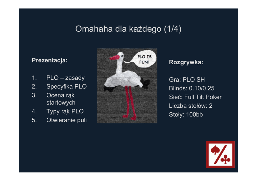 Omahaha dla każdego (1/4) Prezentacja: Rozgrywka: 1. 2. 3. Gra: PLO SH Blinds: 0.10/0.25 Sieć: Full Tilt Poker Liczba stołów: 2 Stoły: 100bb 4. 5. PLO – zasady Specyfika PLO Ocena rąk startowych Typy rąk PLO Otwieranie puli PLO: zasady • • • 4 karty na ręce, 3 na flopie, 1 na turnie, 1 na riverze, W Omahę gra się głównie w strukturze Pot Limit (maksymalne przebicie równe jest aktualnej puli), Wygrywający układ to ZAWSZE 2 karty z ręki i 3 karty ze stołu. Przykład: Ręka startowa: A♠A Q♣T♣ na stole: J♠J J♣J 3 8♣8 9♣6♣7♣ 8♠8 2♠K♠4♠ AAJJJ (nie AJJJJ) Q♣T♣9♣8♣7♣ (nie 6♣7♣8♣9♣T♣) A♠A 8♠8 K♠ (nie A♠K♠8♠4♠2♠). Specyfika PLO • 16 432 rąk startowych o różnej sile, Przykład: A♠Q♠Q♣4 = A Q Q 4♠ • 1 ręka PLO to 6x więcej kombinacji rąk NLHE: Przykład: A♠K♣J♠T♣ = A♠K♣ A♠J♠ A♠T♣ K♣J♠ K♣T♣ J♠T♣, • • • PLO to gra nutsów i nutsowych drawów, PLO to gra 60/40, Stosunkowo mała różnica w sile rąk preflop, Przykład: AAxx kontra losowa ręka = 65.6% / 34.4%, wygrywa ~2 z 3 rozdań Holdem: AA kontra losowa ręka = 85.2% / 14.8%, wygrywa ~5 z 6 rozdań • • • • • • • Duże znaczenie pozycji i gry po flopie – „PLO is a flop game”, Małe znaczenie implied odds, duże znaczenie pot odds, Przewaga gracza wybitnego nad dobrym jest niewielka, Przewaga gracza dobrego nad słabym jest bardzo duża, Przewaga gracza dobrego nad słabym w grach HU jest gigantyczna, Stosunkowo dużo słabych graczy, Stosunkowo wysoki potencjalny winrate dla dobrego gracza, Jak oceniać przydatność ręki startowej • • • • • • • • • Wszystkie cztery karty powinny ze sobą współpracować, Jeżeli tylko trzy karty ze sobą współpracują (czwarta jest tzw. danglerem), to siła ręki obniżona jest blisko dwukrotnie: Przykład: QJT9 = QJ, QT, Q9, JT, J9, T9 QJT2 = QJ, QT, JT + Q2, J2, T2 Wniosek: Należy unikać rąk z danglerami. Ręka powinna umożliwiać złapanie na stole nuts lub nutsowego draw: Przykład: - kolorowe drawy na Asie, - wrap drawy do strita (9876, QJT8, AKQT), - duże pary (JJxx-AAxx), - kombinacje powyższych (A♠T♠9 8 , J J T 8♣, etc.). Im późniejsza pozycja, tym słabsze i mniej „nutsowe” ręce możemy grać, Bez pozycji staramy się grać tylko ręce umożliwiające skompletowanie jakiegoś nuts, aby uniknąć przypadków dominacji, Z SB i BB staramy się grać podobne ręce jak z wczesnych pozycji, pamiętając że nienutsowe drawy bez pozycji rozgrywa się bardzo ciężko, Warto grać możliwie ciasno z SB i BB i nie wpadać w pułapkę dobrych odds bez perspektywicznych rąk, W PLO działa Gap Concept, ale słabiej niż w NLHE – potrzebujemy nieco mocniejszej ręki aby sprawdzić podbicie preflop mając pozycję, niż aby samemu z tej pozycji otwierać, Gap Concept bez pozycji – potrzebujemy silnej ręki aby sprawdzać otwarcie bez pozycji (z SB lub BB), niektórzy autorzy doradzają nawet polaryzację wyboru na przebicie lub pas. Podstawowe typy rąk PLO (1/4) a) Figury (praktycznie każda ręka złożona z kombinacji czterech kart od 9 do A jest grywalna): - Łatwo trafiają nutsowe straight draws, - Często trafiają na flopie top two pair, - Trafiony set zwykle będzie najwyższym możliwym setem, - Posiadanie Asa i figury w kolorze daje nam NFD. Przykłady: A♠A 9♠Qc = overpara i szansa na top seta (AA), NFD (A♠9♠), możliwości stritowe (AQ, Q9), A♠Q♣T♠9 = szansa na TTP (AQ, QT, etc.), NFD (A♠T♠), możliwości stritowe (AQ, QT, T9, Q9, AT), 9♠9 T♠J = szansa na seta (99), dwa FD (9♠T♠, 9 J ), możliwości stritowe (9T, TJ, 9J). b) Duże pary: - AAxx jest grywalne praktycznie z każdymi kartami bocznymi, - KKxx jest grywalne z większością kart bocznych (KK72r lub KK94r można zrzucać pf), - QQxx potrzebuje grywalnych kart bocznych (Q♠Q 9♠4 można zrzucać pf), - JJxx potrzebuje niezłych, współpracujących kart bocznych (J♠J 9♠6 można zrzucać pf). Przykłady : A♠A 7♠2 , K♠K♣Q♠4 , A♠Q♠Q 4 , Q♣Q T 8c, Q♠J♠J 8♣, J♠J 4♣4 . Podstawowe typy rąk PLO (2/4) c) Ręce stritowe: - Wszystkie kombinacje czterech kolejnych kart od AKQJ do 3456: Przykłady: QJT9, 9876, 6543. - Kombinacje czterech kolejnych kart z jedną przerwą u dołu: Przykłady: QJT8, 9875, 7653. - Kombinacje czterech kolejnych kart z jedną przerwą w środku: Przykłady: AKJT, 9865, 7643. - Kombinacje czterech kolejnych kart z jedną przerwą u góry: Przykłady: AQJT, 9765, 7543. - Kombinacje czterech kolejnych kart z podwójną przerwą u dołu: Przykłady: AKQ9, T985, 8763. - Kombinacje czterech kolejnych kart z podwójną przerwą w środku: Przykłady: AKT9, T965, 8743. - Kombinacje czterech kolejnych kart z dwoma przerwami u dołu: Przykłady: AKJ9, T975, 8753. Ważne: QJT9 > QJT8 > QJ98 > QT98 9874 > 9864 > 9854 Podstawowe typy rąk PLO (3/4) d) Ręce z Asem w kolorze (z drawem do NFD), w szczególności: - As w kolorze z dużą parą: Przykład: A♠A 7♠4 , A♠Q♠Q 5 , A♠J J 8♠. - As w kolorze z trzema kartami do strita: Przykład: A♠8♠7 6 , A♠T 9♠7 , A♠7 6 4♠. - As w kolorze z dwoma figurami 10+ i danglerem: Przykład: A♠K J♠5 , A♠J♠T 6 , A♠K♠Q 3 . e) Ręce ze średnimi parkami: Ważne: ręce z parkami są grywalne, jeżeli mają też inne sposoby skompletowania mocnego układu, np: - Parka i wrap: Przykład: 9 9♠8 7 , 8 7 7 5 - Parka, OESD i NFD: Przykład: A♠T♠T 9 - Dwie parki i gutshot: Przykład: 9♠9 7 7♣ - Inne kombinacje, gdzie wszystkie karty obok parki mniej lub bardziej współpracują ze sobą. Podstawowe typy rąk PLO (4/4) f) Ręce marginalne, np.: - Duże pary oprócz AA ze słabymi kartami bocznymi: Przykłady: K♠K 9♣4 , Q♣Q 7 3 , J♣J T 3♣, - Wrapy z przerwami u góry, zwłaszcza bez FD: Przykłady: 567T, 679J, 789Q, - NFD ze słabymi kartami bocznymi: Przykłady: A♠Q 7 4♣, A♠T 6♠5♠, A♠8 8♠3 , - Rę