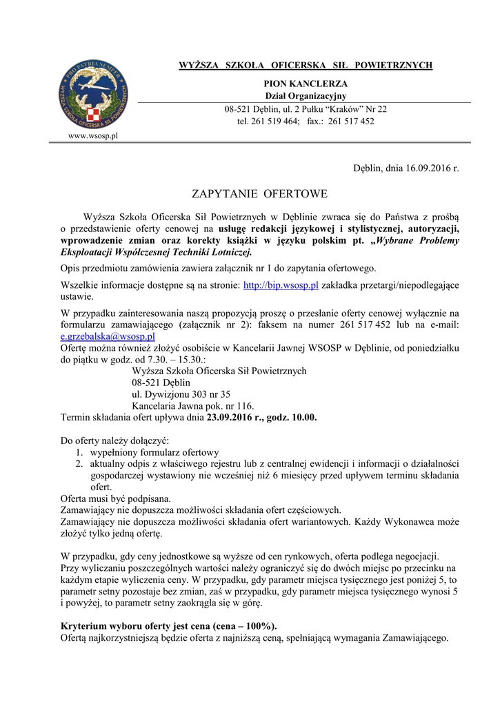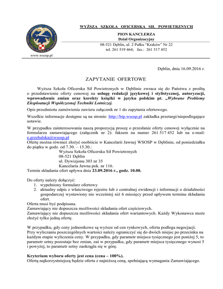 WYŻSZA SZKOŁA OFICERSKA SIŁ POWIETRZNYCH PION KANCLERZA Dział Organizacyjny 08-521 Dęblin, ul. 2 Pułku “Kraków” Nr 22 tel. 261 519 464; fax.: 261 517 452 www.wsosp.pl Dęblin, dnia 16.09.2016 r. ZAPYTANIE OFERTOWE Wyższa Szkoła Oficerska Sił Powietrznych w Dęblinie zwraca się do Państwa z prośbą o przedstawienie oferty cenowej na usługę redakcji językowej i stylistycznej, autoryzacji, wprowadzenie zmian oraz korekty książki w języku polskim pt. „Wybrane Problemy Eksploatacji Współczesnej Techniki Lotniczej. Opis przedmiotu zamówienia zawiera załącznik nr 1 do zapytania ofertowego. Wszelkie informacje dostępne są na stronie: http://bip.wsosp.pl zakładka przetargi/niepodlegające ustawie. W przypadku zainteresowania naszą propozycją proszę o przesłanie oferty cenowej wyłącznie na formularzu zamawiającego (załącznik nr 2): faksem na numer 261 517 452 lub na e-mail: [email protected] Ofertę można również złożyć osobiście w Kancelarii Jawnej WSOSP w Dęblinie, od poniedziałku do piątku w godz. od 7.30. – 15.30.: Wyższa Szkoła Oficerska Sił Powietrznych 08-521 Dęblin ul. Dywizjonu 303 nr 35 Kancelaria Jawna pok. nr 116. Termin składania ofert upływa dnia 23.09.2016 r., godz. 10.00. Do oferty należy dołączyć: 1. wypełniony formularz ofertowy 2. aktualny odpis z właściwego rejestru lub z centralnej ewidencji i informacji o działalności gospodarczej wystawiony nie wcześniej niż 6 miesięcy przed upływem terminu składania ofert. Oferta musi być podpisana. Zamawiający nie dopuszcza możliwości składania ofert częściowych. Zamawiający nie dopuszcza możliwości składania ofert wariantowych. Każdy Wykonawca może złożyć tylko jedną ofertę. W przypadku, gdy ceny jednostkowe są wyższe od cen rynkowych, oferta podlega negocjacji. Przy wyliczaniu poszczególnych wartości należy ograniczyć się do dwóch miejsc po przecinku na każdym etapie wyliczenia ceny. W przypadku, gdy parametr miejsca tysięcznego jest poniżej 5, to parametr setny pozostaje bez zmian, zaś w przypadku, gdy parametr miejsca tysięcznego wynosi 5 i powyżej, to parametr setny zaokrągla się w górę. Kryterium wyboru oferty jest cena (cena – 100%). Ofertą najkorzystniejszą będzie oferta z najniższą ceną, spełniającą wymagania Zamawiającego. Osobą upoważnioną do kontaktów z Wykonawcami jest: a) w sprawach merytorycznych: Izabela Pietruszewska, tel. 261 517 719 b) w sprawach proceduralnych: Ewelina Grzebalska, tel. 261 518 298 W załączeniu 1. Szczegółowy opis przedmiotu zamówienia (załącznik nr 1) 2. Formularz ofertowy (załącznik nr 2) 3. Wzór umowy (załącznik nr 3) KANCLERZ mgr Waldemar BIENIEK Załącznik nr 1 SZCZEGÓŁOWY OPIS PRZEDMIOTU ZAMÓWIENIA Przedmiot zamówienia obejmuje usługę w zakresie redakcji językowej i stylistycznej, autoryzacji, wprowadzenia zmian oraz korekty w treści podręcznika w języku polskim. Usługi będące przedmiotem zamówienia polegać mają na: 1. Korekcie tekstu – poprzez korektę Zamawiający rozumie sprawdzenie tekstów pod względem poprawności językowej oraz zaznaczenie błędów ortograficznych, interpunkcyjnych, gramatycznych, stylistycznych i leksykalnych, za pomocą znormalizowanych znaków korektorskich. Korekta obejmuje również adiustację, czyli przygotowanie tekstu do druku pod względem technicznym i graficznym w zakresie: korekty tekstu w wersji papierowej lub korekty tekstu w wersji elektronicznej (zgodnie z bieżącymi potrzebami Zamawiającego) oraz minimum dwóch korekt arkusza wydawniczego. 2. Opracowaniu materiału ilustracyjnego – przez opracowanie ilustracyjne Zamawiający rozumie zachowanie jednolitej formy stosowanego nazewnictwa oraz uporządkowanie numeracji, zawartych w treści podręcznika: zdjęć, rysunków, wykresów, tabel, rycin, itp. Wykonawca uwzględni i wprowadzi wszystkie uwagi zgłoszone przez Zamawiającego, aż do uzyskania jego ostatecznej akceptacji. Przygotuje zapis ostatecznej wersji publikacji w formatach doc., docx. i pdf. Wykona archiwizację wszystkich przygotowanych materiałów i publikacji w wersji elektronicznej, które przekaże Zamawiającemu. Jednostką rozliczeniową przyjętą przez Zamawiającego jest arkusz wydawniczy, na który składa się 40.000 znaków (ze spacjami) – za stronę normatywną uznaje się 1.800 znaków łącznie z cyframi, spacjami, znakami interpunkcyjnymi. Łączna objętości publikacji wynosi 112 stron normatywnych (tj. około 5 arkuszy wydawniczych). Pozostałe wymagania Wymagania jakościowe: Wymagania techniczne: Warunki dostawy: Warunki odbioru: redakcja językowa i stylistyczna, autoryzacja, wprowadzenie zmian oraz korekta tekstów w języku polskim dokonana przez specjalistę w zakresie przedmiotu zamówienia, na warunkach określonych w umowie - adiustacja techniczno-stylistyczna tekstu; - korekta tekstów po łamaniu komputerowym; - nanoszenie korekty autorskiej na egzemplarz redakcyjny; - nanoszenie korekty redakcyjnej na wersję elektroniczną; - opracowanie materiału ilustracyjnego /graficznego Wykonawca zobowiązuje się dostarczyć Zamawiającemu pisemną korektę całego podręcznika (jednorazowo) w formie elektronicznej pod adres wskazany przez Zamawiającego. [email protected], Wydział Wydawniczy i Poligrafii, Izabela Pietruszewska Termin realizacji Dodatkowe obowiązki wykonawcy w związku z realizacją zamówienia: Płatność: Kary umowne: Gwarancja: Do dnia 10.11.2016 r. Do wykonania zlecenia Wykonawca użyje materiałów i narzędzi własnych. Wynagrodzenie zostanie wypłacone najpóźniej w ciągu 30 dni od przyjęcia pracy na podstawie wystawionego przez Wykonawcę rachunku. Jeśli zwłoka w wykonaniu zlecenia jest większa niż 7 dni, Zamawiający może odstąpić od umowy. Zwłoka w wykonaniu zlecenia powoduje obniżenie wynagrodzenia o 10% za każdy dzień zwłoki. Zamawiający w terminie 3 dni od otrzymania publikacji oświadczy, czy przyjmuje wykonaną r