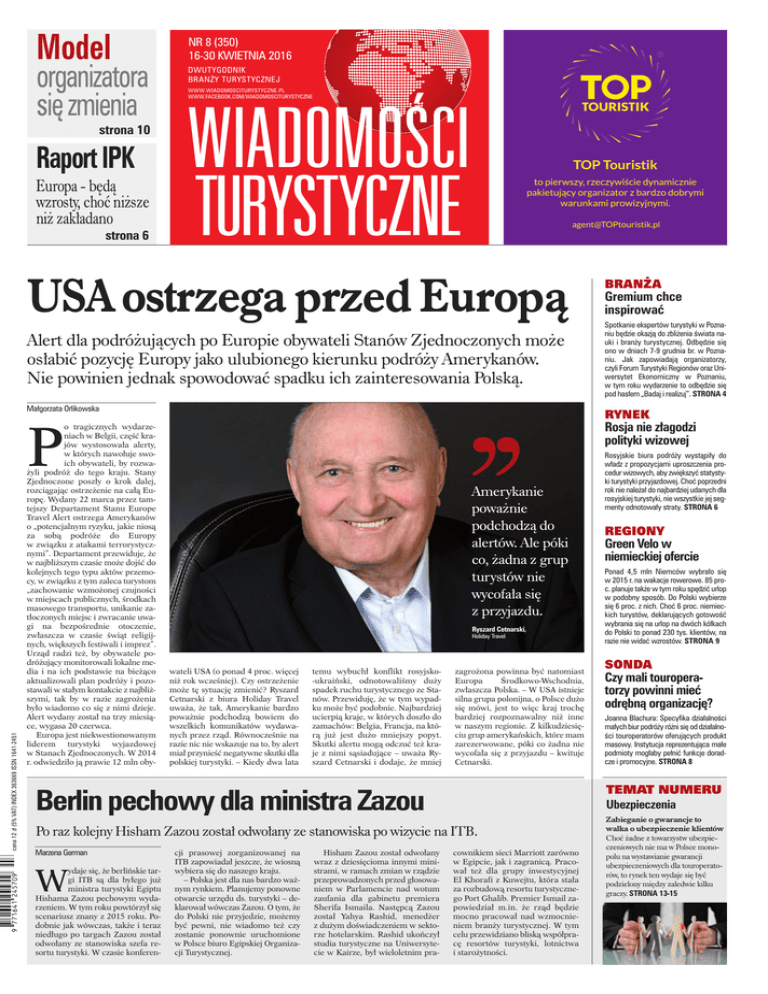 Model organizatora się zmienia strona 10 Raport IPK Europa - będą wzrosty, choć niższe niż zakładano strona 6 NR 8 (350) 16-30 KWIETNIA 2016 DWUTYGODNIK BRANŻY TURYSTYCZNEJ WWW.WIADOMOSCITURYSTYCZNE.PL WWW.FACEBOOK.COM/WIADOMOSCITURYSTYCZNE WIADOMOŚCI TURYSTYCZNE USA ostrzega przed Europą Alert dla podróżujących po Europie obywateli Stanów Zjednoczonych może osłabić pozycję Europy jako ulubionego kierunku podróży Amerykanów. Nie powinien jednak spowodować spadku ich zainteresowania Polską. Małgorzata Orlikowska cena 12 zł (5% VAT) INDEX 363669 ISSN 1641-2451 Amerykanie poważnie podchodzą do alertów. Ale póki co, żadna z grup turystów nie wycofała się z przyjazdu. Ryszard Cetnarski, Holiday Travel wateli USA (o ponad 4 proc. więcej niż rok wcześniej). Czy ostrzeżenie może tę sytuację zmienić? Ryszard Cetnarski z biura Holiday Travel uważa, że tak, Amerykanie bardzo poważnie podchodzą bowiem do wszelkich komunikatów wydawanych przez rząd. Równocześnie na razie nic nie wskazuje na to, by alert miał przynieść negatywne skutki dla polskiej turystyki. – Kiedy dwa lata temu wybuchł konflikt rosyjsko-ukraiński, odnotowaliśmy duży spadek ruchu turystycznego ze Stanów. Przewiduję, że w tym wypadku może być podobnie. Najbardziej ucierpią kraje, w których doszło do zamachów: Belgia, Francja, na którą już jest dużo mniejszy popyt. Skutki alertu mogą odczuć też kraje z nimi sąsiadujące – uważa Ryszard Cetnarski i dodaje, że mniej zagrożona powinna być natomiast Europa Środkowo-Wschodnia, zwłaszcza Polska. – W USA istnieje silna grupa polonijna, o Polsce dużo się mówi, jest to więc kraj trochę bardziej rozpoznawalny niż inne w naszym regionie. Z kilkudziesięciu grup amerykańskich, które mam zarezerwowane, póki co żadna nie wycofała się z przyjazdu – kwituje Cetnarski. W cji prasowej zorganizowanej na ITB zapowiadał jeszcze, że wiosną wybiera się do naszego kraju. – Polska jest dla nas bardzo ważnym rynkiem. Planujemy ponowne otwarcie urzędu ds. turystyki – deklarował wówczas Zazou. O tym, że do Polski nie przyjedzie, możemy być pewni, nie wiadomo też czy zostanie ponownie uruchomione w Polsce biuro Egipskiej Organizacji Turystycznej. Hisham Zazou został odwołany wraz z dziesięcioma innymi ministrami, w ramach zmian w rządzie przeprowadzonych przed głosowaniem w Parlamencie nad wotum zaufania dla gabinetu premiera Sherifa Ismaila. Następcą Zazou został Yahya Rashid, menedżer z dużym doświadczeniem w sektorze hotelarskim. Rashid ukończył studia turystyczne na Uniwersytecie w Kairze, był wieloletnim pra- Rosyjskie biura podróży wystąpiły do władz z propozycjami uproszczenia procedur wizowych, aby zwiększyć statystyki turystyki przyjazdowej. Choć poprzedni rok nie należał do najbardziej udanych dla rosyjskiej turystyki, nie wszystkie jej segmenty odnotowały straty. STRONA 6 REGIONY Green Velo w niemieckiej ofercie Ponad 4,5 mln Niemców wybrało się w 2015 r. na wakacje rowerowe. 85 proc. planuje także w tym roku spędzić urlop w podobny sposób. Do Polski wybierze się 6 proc. z nich. Choć 6 proc. niemieckich turystów, deklarujących gotowość wybrania się na urlop na dwóch kółkach do Polski to ponad 230 tys. klientów, na razie nie widać wzrostów. STRONA 9 SONDA Czy mali touroperatorzy powinni mieć odrębną organizację? Joanna Blachura: Specyfika działalności małych biur podróży różni się od działalności touroperatorów oferujących produkt masowy. Instytucja reprezentująca małe podmioty mogłaby pełnić funkcje doradcze i promocyjne. STRONA 8 TEMAT NUMERU Ubezpieczenia Po raz kolejny Hisham Zazou został odwołany ze stanowiska po wizycie na ITB. ydaje się, że berlińskie targi ITB są dla byłego już ministra turystyki Egiptu Hishama Zazou pechowym wydarzeniem. W tym roku powtórzył się scenariusz znany z 2015 roku. Podobnie jak wówczas, także i teraz niedługo po targach Zazou został odwołany ze stanowiska szefa resortu turystyki. W czasie konferen- Spotkanie ekspertów turystyki w Poznaniu będzie okazją do zbliżenia świata nauki i branży turystycznej. Odbędzie się ono w dniach 7-9 grudnia br. w Poznaniu. Jak zapowiadają organizatorzy, czyli Forum Turystyki Regionów oraz Uniwersytet Ekonomiczny w Poznaniu, w tym roku wydarzenie to odbędzie się pod hasłem „Badaj i realizuj”. STRONA 4 Rosja nie złagodzi polityki wizowej Berlin pechowy dla ministra Zazou Marzena German Gremium chce inspirować RYNEK P o tragicznych wydarzeniach w Belgii, część krajów wystosowała alerty, w których nawołuje swoich obywateli, by rozważyli podróż do tego kraju. Stany Zjednoczone poszły o krok dalej, rozciągając ostrzeżenie na całą Europę. Wydany 22 marca przez tamtejszy Departament Stanu Europe Travel Alert ostrzega Amerykanów o „potencjalnym ryzyku, jakie niosą za sobą podróże do Europy w związku z atakami terrorystycznymi”. Departament przewiduje, że w najbliższym czasie może dojść do kolejnych tego typu aktów przemocy, w związku z tym zaleca turystom „zachowanie wzmożonej czujności w miejscach publicznych, środkach masowego transportu, unikanie zatłoczonych miejsc i zwracanie uwagi na bezpośrednie otoczenie, zwłaszcza w czasie świąt religijnych, większych festiwali i imprez”. Urząd radzi też, by obywatele podróżujący monitorowali lokalne media i na ich podstawie na bieżąco aktualizowali plan podróży i pozostawali w stałym kontakcie z najbliższymi, tak by w razie zagrożenia było wiadomo co się z nimi dzieje. Alert wydany został na trzy miesiące, wygasa 20 czerwca. Europa jest niekwestionowanym liderem turystyki wyjazdowej w Stanach Zjednoczonych. W 2014 r. odwiedziło ją prawie 12 mln oby- BRANŻA cownikiem sieci Marriott zarówno w Egipcie, jak i zagranicą. Pracował też dla grupy inwestycyjnej El Khorafi z Kuwejtu, która stała za rozbudową resortu turystycznego