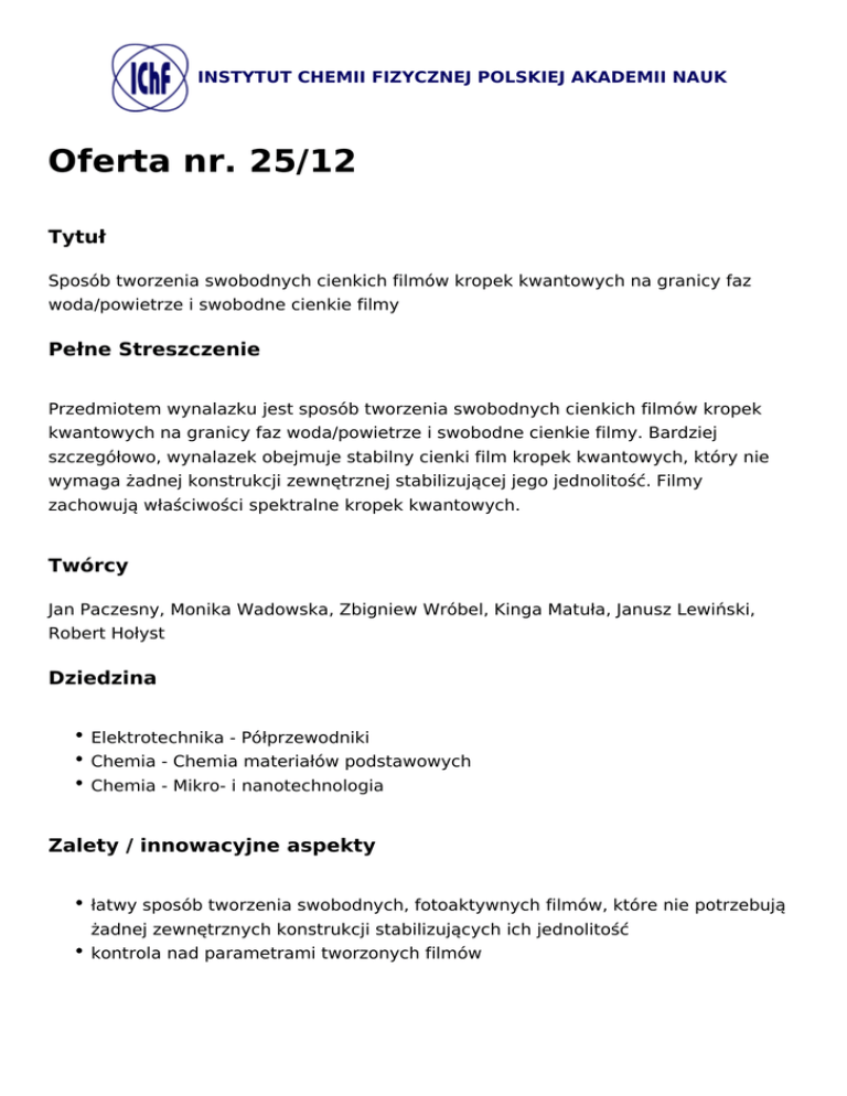 INSTYTUT CHEMII FIZYCZNEJ POLSKIEJ AKADEMII NAUK Oferta nr. 25/12 Tytuł Sposób tworzenia swobodnych cienkich filmów kropek kwantowych na granicy faz woda/powietrze i swobodne cienkie filmy Pełne Streszczenie Przedmiotem wynalazku jest sposób tworzenia swobodnych cienkich filmów kropek kwantowych na granicy faz woda/powietrze i swobodne cienkie filmy. Bardziej szczegółowo, wynalazek obejmuje stabilny cienki film kropek kwantowych, który nie wymaga żadnej konstrukcji zewnętrznej stabilizującej jego jednolitość. Filmy zachowują właściwości spektralne kropek kwantowych. Twórcy Jan Paczesny, Monika Wadowska, Zbigniew Wróbel, Kinga Matuła, Janusz Lewiński, Robert Hołyst Dziedzina Elektrotechnika - Półprzewodniki Chemia - Chemia materiałów podstawowych Chemia - Mikro- i nanotechnologia Zalety / innowacyjne aspekty łatwy sposób tworzenia swobodnych, fotoaktywnych filmów, które nie potrzebują żadnej zewnętrznych konstrukcji stabilizujących ich jednolitość kontrola nad parametrami tworzonych filmów Słowa kluczowe Swobodne cienkie filmy, tlenek cynku, nanocząstki, agregacja, spontaniczne uporządkowanie, kropki kwantowe Zastosowanie Wyświetlacze oparte o kropki kwantowe (QD-LED), Nowoczesne materiały Stan zaawansowania etap badania Prawa własności intelektualnej Zgłoszenie patentowe w Polsce IChF dla Firm ul. Kasprzaka 44/52 01-224 Warszawa TEL: 22 343 33 12 | FAX: 22 343 33 33 [email protected] | NIP: 525-000-87-55