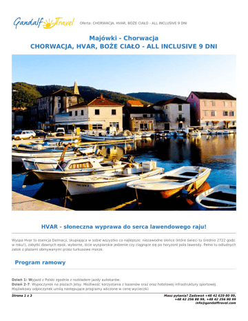 Oferta: CHORWACJA, HVAR, BOŻE CIAŁO - ALL INCLUSIVE 9 DNI Majówki - Chorwacja CHORWACJA, HVAR, BOŻE CIAŁO - ALL INCLUSIVE 9 DNI HVAR - słoneczna wyprawa do serca lawendowego raju! Wyspa Hvar to esencja Dalmacji, skupiająca w sobie wszystko co najlepsze: niezawodne słońce (które świeci tu średnio 2722 godz. w roku!), zabytki dawnych epok, wyborne, iście wyspiarskie jedzenie czy ciągnące się po horyzont pola lawendy. Pełno tu odludnych zatok z plażami obmywanymi przez turkusowe morze. Program ramowy Dzień 1: Wyjazd z Polski zgodnie z rozkładem jazdy autokarów. Dzień 2-7: Wypoczynek na plażach Jelsy. Możliwość korzystania z basenów oraz oraz hotelowej infrastruktury sportowej. Majówkowy odpoczynek umilą następujące programy wliczone w cenę wycieczki: Strona 1 z 3 Masz pytania? Zadzwoń +48 42 639 80 99, +48 42 256 88 99, +48 42 256 80 99 [email protected] 1. TAJEMNICA OLIWNEGO GAJU Spotkanie z historią produktu wytwarzanego na terenie Dalmacji od stuleci. Niepowtarzalna sposobność poznania świata miłośników oliwy, procesów wytarzania płynnego złota oraz uprawy drzew podczas prelekcji miejscowych ogrodników. Podczas spotkania degustacja najlepszych odmian oliwy. 2. HVAR W PIGUŁCE Całodniowa wycieczka, podczas której poznamy najpiękniejsze miejscowości wyspy, widniejącej na liście światowego dziedzictwa UNESCO. Podczas wycieczki zobaczymy m.in. miejscowość Hvar, będącą stolicą wyspy. Miasto zostało założone przez Wenecjan w XIII w. i stanowiło najważniejszy port we wschodniej części Adriatyku. Oblana słońcem miejscowość kusi ilością zabytków, do których należą m.in. wieża zegarowa, katedra św. Stefana, klasztor franciszkański, czy monumentalny Arsenał połączony z najstarszym miejskimi teatrem w Europie. Kolejnym celem naszej podróży będzie Stari Grad, najstarsze miasto na wyspie założone przez greków w IV w. p.n.e. Miejscowość od lat zachwyca kolejne pokolenia turystów znakomitymi zabytkami, prawdziwie południowym klimatem i spokojem. Ostatnim punktem wyprawy będzie pobyt w najmniej znanej, jednak niezwykle urokliwej miejscowości Vrboska. To niewielkie miasteczko o XV-to wiecznym rodowodzie z kamiennymi mostkami przerzuconymi nad paskiem morza wcinającego się w głąb lądu i z kamiennymi domami ocienionymi oleandrami zrobi wrażenie na każdym podróżnym. 3. KOLACJA DALMATYŃSKA I MUZYKA NA ŻYWO W klimat prawdziwie wyspiarskiego wypoczynku pozwoli nam zanurzyć się dalmatyńska kolacja z rybnym menu i lokalnymi przysmakami. Atmosfery kulinarnego święta doda charakterystyczna dla tego miejsca muzyka! Dzień 8: Wykwaterowanie. Wyjazd w drogę powrotną do Polski. Dzień 9: Przyjazd do Polski. Wyżywienie ALL INCLUSIVE: śniadania (7:00-10:00), obiady (12:00-14:00) i kolacje (19:00-21:00) w formie bufetu, podwieczorek (16:00-17:00), w barze przy basenie w godzinach 10:00-23:00 napoje: alkohole: piwo, wino oraz napoje bezalkoholowe: woda, soki. Terminy i ceny: Kliknięcie na cene pozwoli na przejście do formularza rezerwacji internetowej. Symbol Data Pok 2os. Pok 3os. Pok 4os. Pok 2os*** - zakwaterowanie w pokoju 2-osobowym z łazienką, Pok 3os*** - zakwaterowanie w pokoju 3-osobowym z łazienką. Dopłata do pokoju jednoosobowego wynosi 400 PLN. Zakwaterowanie w obiektach odbywa się od godziny 12.00 w dniu przyjazdu, natomiast wykwaterowanie odbywa się do godziny 9.00 w dniu wyjazdu. Cena zawiera 6 noclegów w hotelu Hvar ***; Strona 2 z 3 Masz pytania? Zadzwoń +48 42 639 80 99, +48 42 256 88 99, +48 42 256 80 99 [email protected] przejazd komfortowym autokarem; opiekę pilota; Internet Wi-Fi; Cena nie zawiera Dopłaty obowiązkowe ubezpieczenia 50 PLN/os SIGNAL IDUNA (KL 10 000 euro, NNW 7000PLN, bagaż 800PLN - płatne obligatoryjnie w momencie rezerwacji imprezy; dopłaty do All Inclusive - obligatoryjna dopłata 75 euro/os obligatoryjnej opłatyklimatycznej i kosztu przepraw promowych w obie strony na wyspę 25 euro/os. Zniżki rabat przy wyborze dojazdu własnego - 150 PLN stała cena dla dziecka do lat 3 - 350 PLN Zniżka dla dziecka do 12 lat - 15 % Zniżka dla dziecka do 6 lat - 20 % Podczas promocji nie łącza sie zniżki dla dzieci powyzej 3 lat. Dziecko do 3 lat zawsze ma stałą cenę plus ubezpieczenie. Strona 3 z 3 Masz pytania? Zadzwoń +48 42 639 80 99, +48 42 256 88 99, +48 42 256 80 99 [email protected]