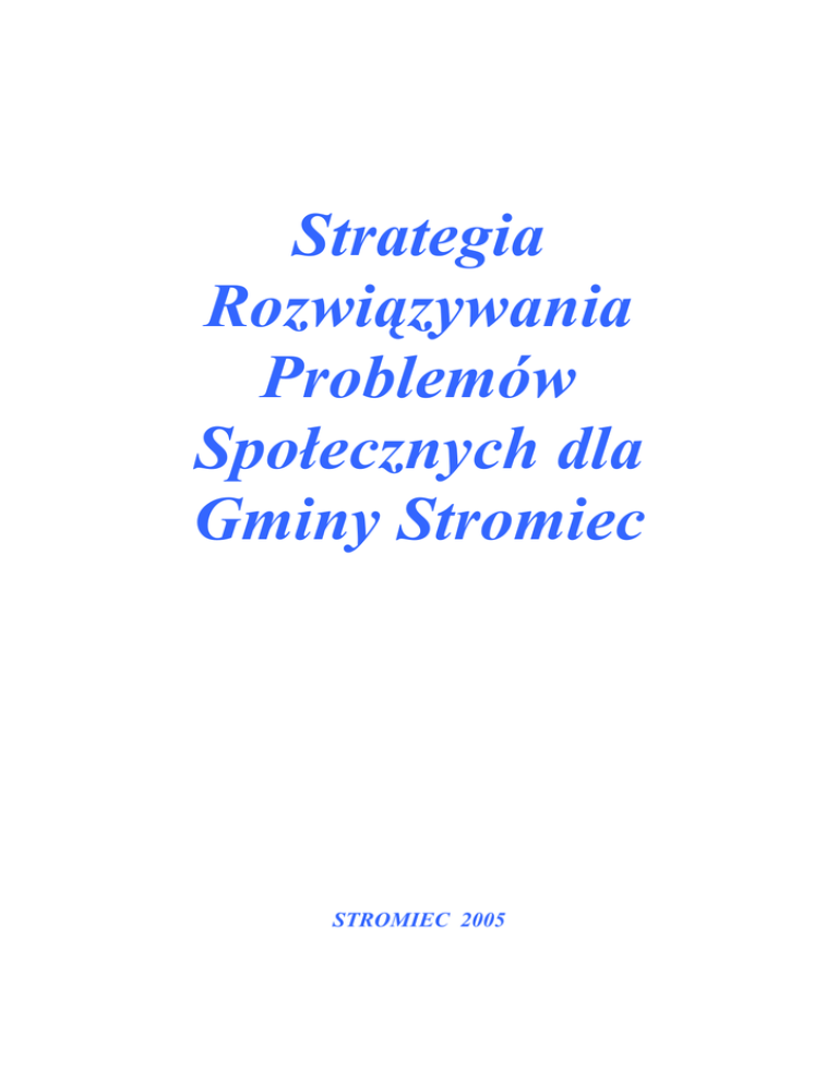 Strategia Rozwiązywania Problemów Społecznych dla Gminy Stromiec STROMIEC 2005 Strategia Rozwiązywania Problemów Społecznych dla Gminy Stromiec ___________________________________________________________________________ SPIS TREŚCI CZĘŚĆ I 1. Wstęp.............................................................................................. str. 3 1.1. Podstawy i cel opracowania .................................................. str. 3 1.2. Metodyka pracy nad Strategią Rozwiązywania Problemów Społecznych dla Gminy Stromiec ......................................... str. 3 1.3. Podstawa prawna systemu pomocy społecznej w Polsce ..... str. 4 2. Charakterystyka Gminy Stromiec ................................................. str.22 3. Diagnoza problemów społecznych. .............................................. str.33 3.1. Ubóstwo .. ............................................................................. str.33 3.2. Sieroctwo ............................................................................... str.35 3.3. Bezdomność .......................................................................... str.36 3.4. Bezrobocie ............................................................................. str.37 3.5. Niepełnosprawność ............................................................... str.41 3.6. Długotrwała lub ciężka choroba ............................................ str.43 3.7. Przemoc w rodzinie ............................................................... str.44 3.8. Ochrona macierzyństwa lub wielodzietności ......................... str.44 3.9. Bezradność w sprawach opiekuńczo - wychowawczych i prowadzenia gospodarstwa domowego, zwłaszcza w rodzinach niepełnych lub wielodzietnych ............................ str.45 3.10. Brak umiejętności w przystosowaniu do życia młodzieży opuszczającej placówki opiekuńczo-wychowawcze .............. str.46 3.11. Trudności w integracji osób, które otrzymały status uchodźcy ............................................................................ str.47 3.12. Trudności w przystosowaniu do życia po opuszczeniu zakładu karnego ................................................................................ str.48 3.13. Alkoholizm i narkomania ................................................... str.48 3.14. Zdarzenia losowe i sytuacje kryzysowe ............................. str.50 3.15. Klęski żywiołowe lub ekologiczne ................................... str.50 3.16. Problemy młodzieży ......................................................... str.51 3.17. Problemy ludzi starszych .................................................. str.52 4. Działalność Gminnego Ośrodka Pomocy Społecznej .................. str.53 5. Posumowanie sytuacji społecznej w gminie ................................ str.56 CZĘŚĆ II 1. Konsultacje społeczne (analiza SWOT, analiza PESTER, konsultacje społeczne) .... ............................................................................... str.57 2. Wizja rozwoju oraz cele główne i pośrednie gminy w zakresie rozwiązywania problemów społecznych .................................... .. str.64 3. Kierunki działań i zadania na lata 2005-2014................................ str.67 4. Wdrażanie i monitoring realizacji strategii ................................... str.72 5. Źródła finansowania ..................................................................... str.73 6. Wykaz materiałów źródłowych .................................................... str.81 2 Strategia Rozwiązywania Problemów Społecznych dla Gminy Stromiec ___________________________________________________________________________ CZĘŚĆ I 1. WSTĘP 1.1. Podstawy i cel opracowania Strategia Rozwiązywania Problemów Społecznych dla Gminy Stromiec powstała jako realizacja ustawy z dnia 12 marca 2004 roku o pomocy społecznej (Dz. U. Nr 64, poz. 593), która w rozdziale 2, Art. 17 wprowadza obowiązek opracowania i realizacji w/w strategii na szczeblu gminnym. Zgodnie z ustawą strategia rozwiązywania problemów społecznych w szczególności powinna uwzględniać programy pomocy społecznej, profilaktyki i rozwiązywania problemów alkoholowych i innych, których celem jest integracja osób i rodzin z grup szczególnego ryzyka. Celem programu jest przeprowadzenie diagnozy problemów społecznych występujących na terenie gminy w oparciu o dane będące w dyspozycji Gminnego Ośrodka Pomocy Społecznej uzyskane w toku bieżącej jego działalności, Urzędu Gminy, Powiatowego Urzędu Pracy oraz instytucji i organizacji współpracujących z GOPS oraz określenie kierunków strategicznych działań odniesionych do rzeczywistych problemów społeczności lokalnej (m.in. bezrobocia i problemów z zatrudnieniem, pomocy na rzecz osób dotkniętych problemem alkoholowym, osób niepełnosprawnych, starszych, rodzin i dzieci z problemami opiekuńczo-wychowawczymi itd.), wskazanie skutecznych kierunków działań dla ich rozwiązywania, a także ustalenie współpracy instytucjonalnej dla rozwiązywania poszczególnych problemów społecznych. 1.2. Metodyka pracy nad Strategią Rozwiązywania Problemów Społecznych dla Gminy Stromiec Opracowanie Strategii Rozwiązywania Problemów Społecznych dla Gminy Stromiec poprzedzone zostało spotkaniem przedstawicieli środowisk i grup społecznych oraz instytucji z terenu gminy – odbyły się Warsztaty Planowania Strategicznego. Podstawę opracowania stanowiły materiały źródłowe (praca Gminnego Ośrodka Pomocy Społecznej oraz Urzędu Gminy) oraz materiały będące wynikiem badań ankietowych różnych środowisk i grup społecznych. Realizacja zadań postawionych przed pomocą społeczną (zarówno na poziomie społeczności lokalnej, jak i na poziomie rodziny i jednostki), a także konieczność wypracowania niekonwencjonalnych form pomocy, wymaga profesjonalnego i systemowego diagnozowania problemów społecznych w sk