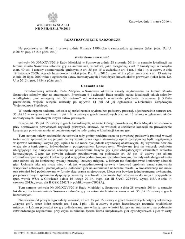 Katowice, dnia 1 marca 2016 r. WOJEWODA ŚLĄSKI NR NPII.4131.1.70.2016 ROZSTRZYGNIĘCIE NADZORCZE Na podstawie art. 91 ust. 1 ustawy z dnia 8 marca 1990 roku o samorządzie gminnym (tekst jedn. Dz. U. z 2015r. poz. 1515 z późn. zm.) stwierdzam nieważność uchwały Nr 307/XXVI/2016 Rady Miejskiej w Sosnowcu z dnia 28 stycznia 2016r. w sprawie lokalizacji na terenie miasta Sosnowca salonów gry na automatach, w całości, jako niezgodnej z art. 7 Konstytucji w związku z art. 40 ust. 1 ustawy o samorządzie gminnym, z art. 35 pkt 15 w związku z art. 4 ust. 1 pkt 1 lit. a ustawy z dnia 19 listopada 2009r. o grach hazardowych (tekst jedn. Dz. U. z 2015 r. poz. 612 z późn. zm.) oraz z art. 13 ustawy z dnia 20 lipca 2000 roku o ogłaszaniu aktów normatywnych i niektórych innych aktów prawnych (tekst jedn. Dz. U. z 2015r., poz. 1484 z późn. zm.). Uzasadnienie Przedmiotową uchwałą Rada Miejska w Sosnowcu określiła zasady usytuowania na terenie Miasta Sosnowiec salonów gier na automatach. Przepisem § 1 uchwały Rada ustaliła zakaz lokalizacji takich salonów w odległości „nie mniejszej niż 50 metrów” od wskazanych w uchwale placówek. Przepisem § 3 Rada przewidziała wejście w życie uchwały po upływie 14 dni od jej ogłoszenia w Dzienniku Urzędowym Województwa Śląskiego. W ocenie organu nadzoru, uchwała tej treści została wydana bez podstawy prawnej, a jednocześnie narusza art. 35 pkt 15 w związku z art. 4 ust. 1 pkt 1 lit. a ustawy o grach hazardowych oraz art. 13 ustawy o ogłaszaniu aktów normatywnych i niektórych innych aktów prawnych. Przepis art. 35 pkt 15 ustawy o grach hazardowych, na treść którego powołała się Rada Miejska w Sosnowcu przy normowaniu powyższych regulacji prawnych, stanowi, że wniosek o udzielenie koncesji na prowadzenie kasyna gry powinien zawierać pozytywną opinię rady gminy o lokalizacji kasyna gry. Tym samym należy stwierdzić, że uchwała rady gminy podejmowana na powyższej podstawie prawnej w swej treści może sprowadzać się jedynie do wyrażenia przez organ stanowiący opinii (pozytywnej bądź negatywnej) w sprawie lokalizacji kasyna gry. Opinia ta nie może być jednak czynnością abstrakcyjną. Jej wyrażenie bowiem wiąże się z konkretnym, indywidualnym postępowaniem koncesyjnym. Wydawana jest na wniosek podmiotu ubiegającego się o uzyskanie koncesji na prowadzenie kasyna gry i jest obligatoryjnym elementem wniosku koncesyjnego. Z tego też powodu uchwała podejmowana na podstawie art. 35 pkt 15 ustawy jest aktem sformułowanym w sposób konkretny pod względem podmiotowym i przedmiotowym, ma indywidualnego adresata oraz odnosi się do konkretnej sytuacji prawnej. Dotyczy miejsca, w którym ma funkcjonować konkretny ośrodek gier. Uchwała taka nie może więc - tak jak w przedmiotowej sprawie - kreować ogólnych zasad sytuowania wszystkich (obecnych i potencjalnych) „salonów” gier na automatach na terenie miasta. W konsekwencji nie może ona również być podejmowana w formie aktu prawa miejscowego. Ulega ona bowiem jednokrotnemu wykonaniu, po jednorazowym spełnieniu dyspozycji zawartej w uchwale i nie może być stosowana do innych przypadków (por. wyrok WSA w Gliwicach z dnia 16 lutego 2011r., sygn. akt III SA/Gl 2234/10, wyrok NSA z dnia 14 czerwca 2013r., sygn. akt II GSK 2242/11- publikowane CBOSA). Tym samym uchwała Nr 307/XXVI/2016 Rady Miejskiej w Sosnowcu z dnia 28 stycznia 2016r. w sprawie lokalizacji na terenie miasta Sosnowca salonów gry na automatach istotnie narusza art. 35 pkt 15 ustawy o grach hazardowych. Niezależnie od powyższego należy wskazać, że art. 35 pkt 15 ustawy o grach hazardowych dotyczy lokalizacji „kasyna gry”, przez które przepis art. 4 ust. 1 pkt 1 lit. a ustawy o grach hazardowych rozumie: wydzielone miejsce, w którym prowadzi się gry cylindryczne, gry w karty, gry w kości lub gry na automatach, na podstawie zatwierdzonego regulaminu, przy czym minimalna łączna liczba urządzanych gier cylindrycznych i gier w karty ————————————————————————————————————————————————————————— Id: E749B151-914E-49DD-B7E2-7BE22261B8C5. Podpisany Strona 1 wynosi 4, a liczba zainstalowanych automatów wynosi od 5 do 70 sztuk. Posłużenie się więc w uchwale pojęciem pozaustawowym „salonów gier na automatach” narusza ww. przepisy ustawy. Rada Miejska w Sosnowcu uzależniając wejście w życie przedmiotowej uchwały od jej ogłoszenia w Dzienniku Urzędowym Województwa Śląskiego potraktowała ją jako akt prawa miejscowego. Jednakże, jednym z podstawowych warunków dla uznania danej uchwały za akt powszechnie obowiązujący na terenie danej gminy jest podjęcie jej na podstawie wyraźnego upoważnienia ustawowego. Ponieważ przepisy ustawowe nie uprawniają rady gminy do ustalania zasad usytuowania na terenie gminy salonów gier na automatach, ani do wprowadzania w tym zakresie zakazów, należy uznać, że przedmiotową uchwałą Rada Miejska naruszyła także przepis art. 40 ust. 1 ustawy o samorządzie gminnym. W konsekwencji, regulacja zawarta w § 3 uchwały, przewidująca obowiązek ogłoszenia uchwały w wojewódzkim dzienniku urzędowym narusza przepis art. 13 ustawy o ogłaszaniu aktów normatywnych i niektórych innych aktów prawnych. Kwestionowana uchwała bowiem nie należy do żadnej z kategorii aktów (wymienionych w tym przepisie), podlegających ogłoszeniu w wojewódzkim dzienniku urzędowym. W szczególności nie stanowi ona aktu prawa miejscowego, ani też aktu, który podlegałby publikacji na mocy przepisów szczególnych. Ponieważ, jak wyżej wskazano, podstawą dla podjęcia przedmiotowej uchwały nie może być ani art. 35 pkt 15 ustawy o grach hazardowych ani też żaden inny przepis ustawowy, uznać należy, że Rada Miejska w Sosnowcu naruszyła przepis art. 7 Konstytucji RP, zgodnie z którym organy władz