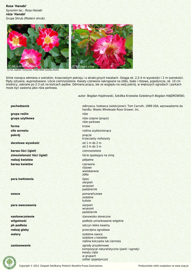 Rosa 'Hanabi' Synonim lac.: Rosa Hanabi róża 'Hanabi' Grupa Shrub (Modern shrub) (c) fot. Gabriel Tomżyński TOMŻYŃSKI Szkółka Roślin Silnie rosnąca odmiana o szerokim, krzaczastym pokroju i o atrakcyjnych kwiatach. Osiąga ok. 2,5-4 m wysokości i 2 m szerokości. Pędy sztywne, wyprostowane. Liście ciemnozielone. Kwiaty czerwone nakrapiane na żółto, biało i różowo, pojedyncze, ok. 10 cm średnicy, zebrane po 2-3 szt na końcach pędów. Odmiana pnąca, ale ze względu na swój pokrój, w większych ogrodach i parkach może być sadzona jako róża parkowa. autor: Bogdan Hajdrowski, Szkółka Krzewów Ozdobnych Bogdan HAJDROWSKI; pochodzenie odkrywca, hodowca (selekcjoner): Tom Carruth, 1999 USA; wprowadzenie do handlu: Weeks Wholesale Rose Grower, Inc. grupa roślin róże grupa użytkowa róże czepne (pnące) róże parkowe forma krzew siła wzrostu roślina szybkorosnąca pokrój pnącze krzaczasty rozłożysty docelowa wysokość od 1 m do 2 m od 2 m do 3 m barwa liści (igieł) ciemnozielone zimozieloność liści (igieł) liście opadające na zimę rodzaj kwiatów półpełne barwa kwiatów czerwone różowe wielobarwne żółte pora kwitnienia lipiec sierpień wrzesień październik owoce pomarańczowe ozdobne kuliste pora owocowania sierpień wrzesień październik nasłonecznienie stanowisko słoneczne wilgotność podłoże umiarkowanie wilgotne ph podłoża odczyn lekko kwaśny rodzaj gleby przeciętna ogrodowa walory ozdobne owoce ozdobne z kwiatów roślina kolczasta lub ciernista zastosowanie ogrody przydomowe kompozycje naturalistyczne (parki i ogrody) kwiaty cięte w grupach soliter (pojedynczo) Copyright © 2013. Związek Szkółkarzy Polskich Wszelkie Prawa Zastrzeżone. Producentów roślin znajdziesz na www.zszp.pl autor: Bogdan Hajdrowski, Szkółka Krzewów Ozdobnych Bogdan HAJDROWSKI; Copyright © 2013. Związek Szkółkarzy Polskich Wszelkie Prawa Zastrzeżone. Producentów roślin znajdziesz na www.zszp.pl