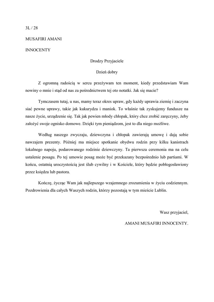 3L / 28 MUSAFIRI AMANI INNOCENTY Drodzy Przyjaciele Dzień dobry Z ogromną radością w sercu przeżywam ten moment, kiedy przedstawiam Wam nowiny o mnie i stąd od nas za pośrednictwem tej oto notatki. Jak się macie? Tymczasem tutaj, u nas, mamy teraz okres upraw, gdy każdy uprawia ziemię i zaczyna siać pewne uprawy, takie jak kukurydza i maniok. To właśnie tak zyskujemy fundusze na nasze życie, urządzenie się. Tak jak pewien młody chłopak, który chce zrobić zaręczyny, żeby założyć swoje ognisko domowe. Dzięki tym pieniądzom, jest to dla niego możliwe. Według naszego zwyczaju, dziewczyna i chłopak zawierają umowę i dają sobie nawzajem prezenty. Później ma miejsce spotkanie obydwu rodzin przy kilku kanistrach lokalnego napoju, podarowanego rodzinie dziewczyny. Ta pierwsza ceremonia ma na celu ustalenie posagu. Po tej umowie posag może być przekazany bezpośrednio lub partiami. W końcu, ostatnią uroczystością jest ślub cywilny i w Kościele, który będzie pobłogosławiony przez księdza lub pastora. Kończę, życząc Wam jak najlepszego wzajemnego zrozumienia w życiu codziennym. Pozdrowienia dla całych Waszych rodzin, którzy pozostają w tym mieście Lublin. Wasz przyjaciel, AMANI MUSAFIRI INNOCENTY.