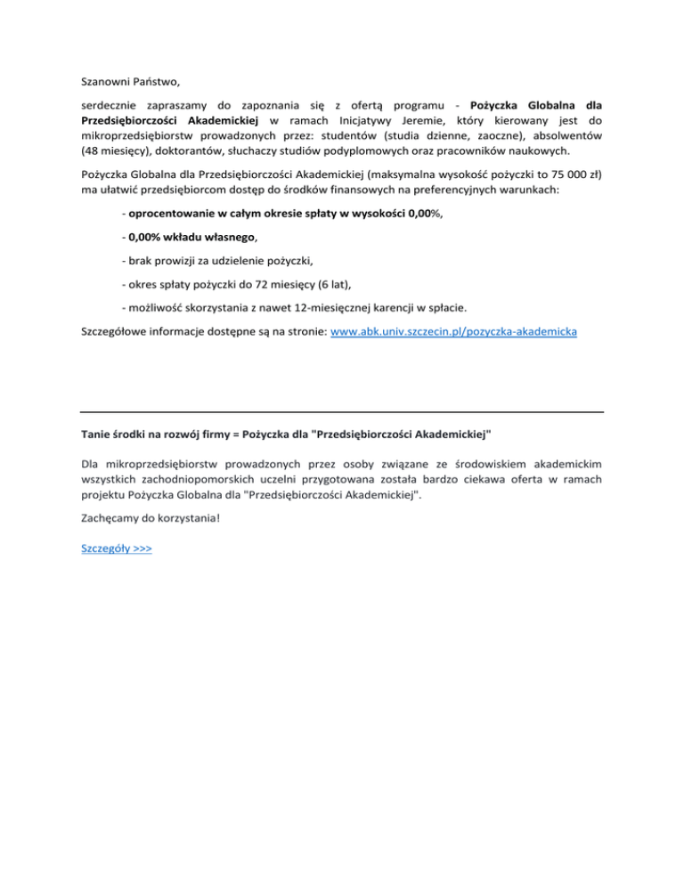 Szanowni Państwo, serdecznie zapraszamy do zapoznania się z ofertą programu - Pożyczka Globalna dla Przedsiębiorczości Akademickiej w ramach Inicjatywy Jeremie, który kierowany jest do mikroprzedsiębiorstw prowadzonych przez: studentów (studia dzienne, zaoczne), absolwentów (48 miesięcy), doktorantów, słuchaczy studiów podyplomowych oraz pracowników naukowych. Pożyczka Globalna dla Przedsiębiorczości Akademickiej (maksymalna wysokość pożyczki to 75 000 zł) ma ułatwić przedsiębiorcom dostęp do środków finansowych na preferencyjnych warunkach: - oprocentowanie w całym okresie spłaty w wysokości 0,00%, - 0,00% wkładu własnego, - brak prowizji za udzielenie pożyczki, - okres spłaty pożyczki do 72 miesięcy (6 lat), - możliwość skorzystania z nawet 12-miesięcznej karencji w spłacie. Szczegółowe informacje dostępne są na stronie: www.abk.univ.szczecin.pl/pozyczka-akademicka Tanie środki na rozwój firmy = Pożyczka dla "Przedsiębiorczości Akademickiej" Dla mikroprzedsiębiorstw prowadzonych przez osoby związane ze środowiskiem akademickim wszystkich zachodniopomorskich uczelni przygotowana została bardzo ciekawa oferta w ramach projektu Pożyczka Globalna dla "Przedsiębiorczości Akademickiej". Zachęcamy do korzystania! Szczegóły >>>