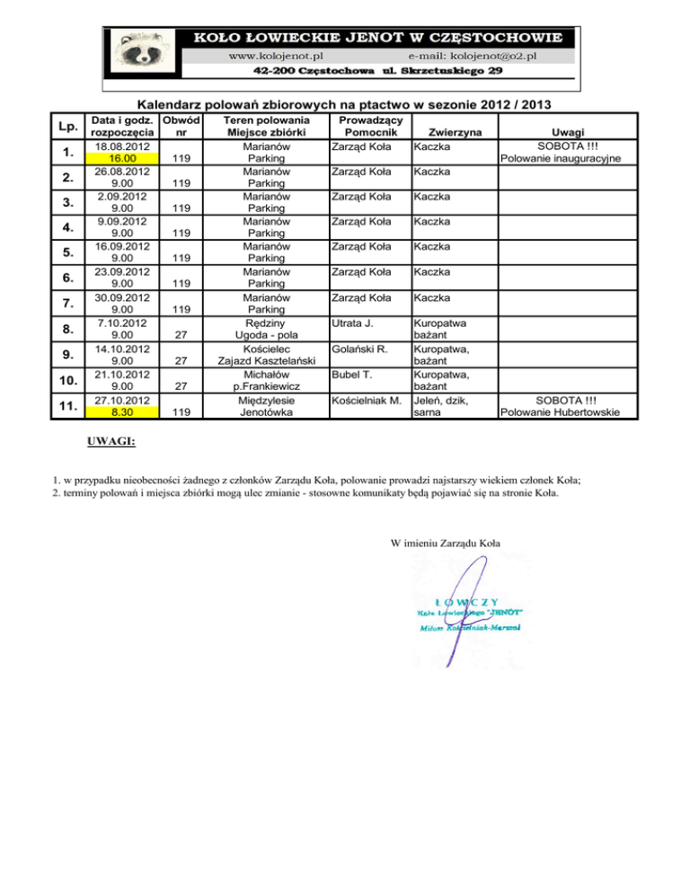 Kalendarz polowań zbiorowych na ptactwo w sezonie 2012 / 2013 Data i godz. Obwód nr 18.08.2012 16.00 119 26.08.2012 9.00 119 2.09.2012 9.00 119 9.09.2012 9.00 119 16.09.2012 9.00 119 23.09.2012 9.00 119 30.09.2012 9.00 119 7.10.2012 9.00 27 14.10.2012 9.00 27 21.10.2012 9.00 27 27.10.2012 8.30 119 Lp. rozpoczęcia 1. 2. 3. 4. 5. 6. 7. 8. 9. 10. 11. Teren polowania Miejsce zbiórki Marianów Parking Marianów Parking Marianów Parking Marianów Parking Marianów Parking Marianów Parking Marianów Parking Rędziny Ugoda - pola Kościelec Zajazd Kasztelański Michałów p.Frankiewicz Międzylesie Jenotówka Prowadzący Pomocnik Zwierzyna Zarząd Koła Kaczka Zarząd Koła Kaczka Zarząd Koła Kaczka Zarząd Koła Kaczka Zarząd Koła Kaczka Zarząd Koła Kaczka Zarząd Koła Kaczka Utrata J. Kuropatwa bażant Kuropatwa, bażant Kuropatwa, bażant Jeleń, dzik, sarna Golański R. Bubel T. Kościelniak M. Uwagi SOBOTA !!! Polowanie inauguracyjne SOBOTA !!! Polowanie Hubertowskie UWAGI: 1. w przypadku nieobecności żadnego z członków Zarządu Koła, polowanie prowadzi najstarszy wiekiem członek Koła; 2. terminy polowań i miejsca zbiórki mogą ulec zmianie - stosowne komunikaty będą pojawiać się na stronie Koła. W imieniu Zarządu Koła
