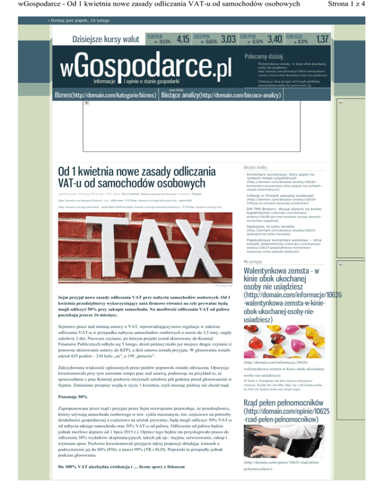 wGospodarce - Od 1 kwietnia nowe zasady odliczania VAT-u od samochodów osobowych Strona 1 z 4 › Dzisiaj jest piątek, 14 lutego Zaloguj się(http://domain.com/czytelnicy/logowanie?next=/opinie/10473-od-1-kwietnia-nowe-zasady-odliczania-vat-u-od-samochodow-osobowych) Dzisiejsze kursy walut EUR/PLN -0,53% 4,15 USD/PLN -0,65% 3,03 CHF/PLN -0,57% 3,40 EUR/USD 0,12% 1,37 Polecamy dzisiaj Walentynkowa zemsta - w kinie obok ukochanej osoby nie usiądziesz (http://domain.com/informacje/10626-walentynkowazemsta-w-kinie-obok-ukochanej-osoby-nie-usiadziesz) Chińczycy chcą przejąć od Google globalną amerykańską markę by przywrócić jej rentowność(http://domain.com/informacje/10619- nowa Giełda Biznes(http://domain.com/kategorie/biznes) Bieżące analizy(http://domain.com/biezace-analizy) amerykanska-marke-by-przywrocic-jej-rentownosc) chinczycy-chca-przejac-od-google-globalna- Od 1 kwietnia nowe zasady odliczania VAT-u od samochodów osobowych Bieżące analizy opublikowano: 10 lutego 2014 roku, 7:05 | autor: Tax Care(http://domain.com/autorzy/tax-care) | kategorie: Finanse · Inflacja w Chinach powyżej oczekiwań · Komentarz surowcowy: Silny popyt na rynkach metali szlachetnych (http://domain.com/biezace-analizy/10630komentarz-surowcowy-silny-popyt-na-rynkachmetali-szlachetnych) (http://domain.com/biezace-analizy/10629inflacja-w-chinach-powyzej-oczekiwan) (http://domain.com/kategorie/finanse) | tagi: odliczenie VAT(http://domain.com/tagi/odliczenie-vat) , samochód (http://domain.com/tagi/samochod) , samochód służbowy(http://domain.com/tagi/samochod-sluzbowy) , VAT(http://domain.com/tagi/vat) · DM TMS Brokers: Wysyp danych na koniec tygodnia(http://domain.com/biezaceanalizy/10628-dm-tms-brokers-wysyp-danychna-koniec-tygodnia) · Spokojnie, to tylko korekta (http://domain.com/biezace-analizy/10615spokojnie-to-tylko-korekta) · Popołudniowy komentarz walutowy – zima szkodzi dolarowi(http://domain.com/biezaceanalizy/10614-popoludniowy-komentarzwalutowy-zima-szkodzi-dolarowi) Nie przegap Fot.sxc.hu Sejm przyjął nowe zasady odliczania VAT przy nabyciu samochodów osobowych. Od 1 kwietnia przedsiębiorcy wykorzystujący auta firmowe również na cele prywatne będą mogli odliczyć 50% przy zakupie samochodu. Na możliwość odliczania VAT od paliwa poczekają jeszcze 16 miesięcy. Walentynkowa zemsta - w kinie obok ukochanej osoby nie usiądziesz (http://domain.com/informacje/10626 -walentynkowa-zemsta-w-kinieobok-ukochanej-osoby-nieusiadziesz) Sejmowe prace nad zmianą ustawy o VAT, wprowadzającej nowe regulacje w zakresie odliczania VAT-u w przypadku nabycia samochodów osobowych o masie do 3,5 tony, zajęły zaledwie 3 dni. Pierwsze czytanie, po którym projekt został skierowany do Komisji Finansów Publicznych odbyło się 5 lutego, dzień później miało już miejsce drugie czytanie (i ponowne skierowanie ustawy do KFP), a dziś ustawa została przyjęta. W głosowaniu wzięło udział 429 posłów - 230 było „za”, a 199 „przeciw”. (http://domain.com/informacje/10626- Zdecydowana większość zgłoszonych przez posłów poprawek została odrzucona. Opozycja kwestionowała przy tym zawrotne tempo prac nad ustawą, podnosząc na przykład to, że sprawozdanie z prac Komisji posłowie otrzymali zaledwie pół godziny przed głosowaniem w Sejmie. Zmienione przepisy wejdą w życie 1 kwietnia, czyli miesiąc później niż chciał rząd. Pozostaje 50% Zaproponowane przez rząd i przyjęte przez Sejm rozwiązanie przewiduje, że przedsiębiorcy, którzy używają samochodu osobowego w tzw. cyklu mieszanym, tzn. częściowo na potrzeby działalności gospodarczej a częściowo na użytek prywatny, będą mogli odliczyć 50% VAT-u od nabycia takiego samochodu oraz 50% VAT-u od paliwa. Odliczenie od paliwa będzie jednak możliwe dopiero od 1 lipca 2015 r.). Oprócz tego będzie im przysługiwało prawo do odliczenia 50% wydatków eksploatacyjnych, takich jak np.: myjnia, serwisowanie, zakup i wymiana opon. Posłowie kwestionowali przyjęcie takiej proporcji składając wniosek o podwyższenie jej do 80% (PiS), a nawet 99% (TR i SLD). Poprawki te przepadły jednak podczas głosowania. walentynkowa-zemsta-w-kinie-obok-ukochanejosoby-nie-usiadziesz) W kinie w Szanghaju ma dziś miejsce nietypowa sytuacja. Każdy kto chciałby udać się z ukochaną osobą na film nie będzie obok niej mógł usiąść. Rząd pełen pełnomocników (http://domain.com/opinie/10625 -rzad-pelen-pelnomocnikow) (http://domain.com/opinie/10625-rzad-pelen- Do 100% VAT niezbędna ewidencja i … liczne spory z fiskusem pelnomocnikow) wGospodarce - Od 1 kwietnia nowe zasady odliczania VAT-u od samochodów osobowych W innej sytuacji będą przedsiębiorcy wykorzystujący auto firmowe tylko i wyłącznie na potrzeby działalności gospodarczej. Do tego niezbędne będzie, aby sposób wykorzystania wynikał z „obiektywnych okoliczności”, które dodatkowo mają być potwierdzone prowadzoną ewidencją przebiegu pojazdu. Nie przeszła przy tym zgłoszona przez posłów PiS poprawka znosząca ten kłopotliwy obowiązek. Wprowadzono jedynie drobne zmiany, zezwalając na prowadzenie ewidencji w wersji elektronicznej i rezygnując z potwierdzenia przez przedsiębiorcę autentyczności wpisu osoby kierującej pojazdem (np. pracownika). Ze 100-proc. odliczeniem mogą mieć problem przedsiębiorcy prowadzący działalność gospodarczą w miejscu zamieszkania. Chociaż taka okoliczność nie została wskazana w projekcie, to jednak podany w uzasadnieniu projektu przykład zapewne będzie stanowił kierunek wykładni i podejścia fiskusa w praktyce : „W przypadku osób fizycznych, które działalność gospodarczą prowadzą w swoim miejscu zamieszkania (np. architekt), należy uznać, że posiadany przez niego wykorzystywany w działalności gospodarczej samochód jest również używany co do zasady na cele prywatne. Nie można bowiem obiektywnie stwierdzić, że samochód jest wykorzystywany wyłączn