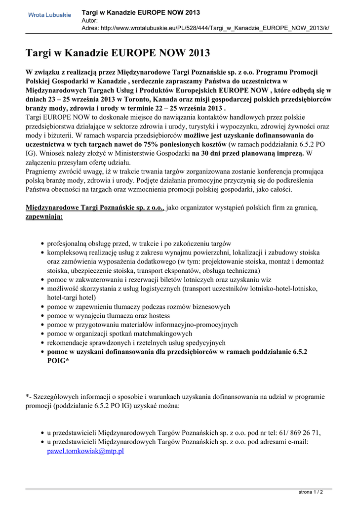Targi w Kanadzie EUROPE NOW 2013 Autor: Adres: http://www.wrotalubuskie.eu/PL/528/444/Targi_w_Kanadzie_EUROPE_NOW_2013/k/ Targi w Kanadzie EUROPE NOW 2013 W związku z realizacją przez Międzynarodowe Targi Poznańskie sp. z o.o. Programu Promocji Polskiej Gospodarki w Kanadzie , serdecznie zapraszamy Państwa do uczestnictwa w Międzynarodowych Targach Usług i Produktów Europejskich EUROPE NOW , które odbędą się w dniach 23 – 25 września 2013 w Toronto, Kanada oraz misji gospodarczej polskich przedsiębiorców branży mody, zdrowia i urody w terminie 22 – 25 września 2013 . Targi EUROPE NOW to doskonałe miejsce do nawiązania kontaktów handlowych przez polskie przedsiębiorstwa działające w sektorze zdrowia i urody, turystyki i wypoczynku, zdrowiej żywności oraz mody i biżuterii. W ramach wsparcia przedsiębiorców możliwe jest uzyskanie dofinansowania do uczestnictwa w tych targach nawet do 75% poniesionych kosztów (w ramach poddziałania 6.5.2 PO IG). Wniosek należy złożyć w Ministerstwie Gospodarki na 30 dni przed planowaną imprezą. W załączeniu przesyłam ofertę udziału. Pragniemy zwrócić uwagę, iż w trakcie trwania targów zorganizowana zostanie konferencja promująca polską branżę mody, zdrowia i urody. Podjęte działania promocyjne przyczynią się do podkreślenia Państwa obecności na targach oraz wzmocnienia promocji polskiej gospodarki, jako całości. Międzynarodowe Targi Poznańskie sp. z o.o., jako organizator wystąpień polskich firm za granicą, zapewniają: profesjonalną obsługę przed, w trakcie i po zakończeniu targów kompleksową realizację usług z zakresu wynajmu powierzchni, lokalizacji i zabudowy stoiska oraz zamówienia wyposażenia dodatkowego (w tym: projektowanie stoiska, montaż i demontaż stoiska, ubezpieczenie stoiska, transport eksponatów, obsługa techniczna) pomoc w zakwaterowaniu i rezerwacji biletów lotniczych oraz uzyskaniu wiz możliwość skorzystania z usług logistycznych (transport uczestników lotnisko-hotel-lotnisko, hotel-targi hotel) pomoc w zapewnieniu tłumaczy podczas rozmów biznesowych pomoc w wynajęciu tłumacza oraz hostess pomoc w przygotowaniu materiałów informacyjno-promocyjnych pomoc w organizacji spotkań matchmakingowych rekomendacje sprawdzonych i rzetelnych usług spedycyjnych pomoc w uzyskani dofinansowania dla przedsiębiorców w ramach poddziałanie 6.5.2 POIG* *- Szczegółowych informacji o sposobie i warunkach uzyskania dofinansowania na udział w programie promocji (poddziałanie 6.5.2 PO IG) uzyskać można: u przedstawicieli Międzynarodowych Targów Poznańskich sp. z o.o. pod nr tel: 61/ 869 26 71, u przedstawicieli Międzynarodowych Targów Poznańskich sp. z o.o. pod adresami e-mail: [email protected] strona 1 / 2 Targi w Kanadzie EUROPE NOW 2013 Autor: Adres: http://www.wrotalubuskie.eu/PL/528/444/Targi_w_Kanadzie_EUROPE_NOW_2013/k/ w Ministerstwie Gospodarki Departament Wdrażania Programów Operacyjnych pod numerem telefonu 22/ 693-58-44 na stronie www Ministerstwa Gospodarki: http://www.mg.gov.pl/Fundusze+UE/POIG/Dzialania/Dzialanie+652/Dokumenty+dla+wnioskodawcow Zapraszamy wszystkich zainteresowanych do współpracy i udziału w promocji naszego Kraju na rynku Ameryki Północnej. Kontakt z biurem Euope Now w Polsce: tel/fax: +48 41 344 37 55, e-mail: [email protected] strona 2 / 2 Powered by TCPDF (www.tcpdf.org)