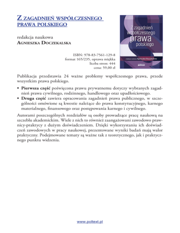 Z zagadnień współczesnego prawa polskiego redakcja naukowa Agnieszka Doczekalska ISBN: 978-83-7561-129-8 format 165/235, oprawa miękka liczba stron: 444 cena: 59,00 zł Publikacja przedstawia 24 ważne problemy współczesnego prawa, przede wszystkim prawa polskiego. • Pierwsza część poświęcona prawu prywatnemu dotyczy wybranych zagadnień prawa cywilnego, rodzinnego, handlowego oraz upadłościowego. • Druga część zawiera opracowania zagadnień prawa publicznego, w szczególności omówione są kwestie należące do prawa konstytucyjnego, karnego materialnego, finansowego oraz postępowania karnego i cywilnego. Autorami poszczególnych rozdziałów są osoby prowadzące pracę naukową na szczeblu akademickim. Wiele z nich to również zaangażowani zawodowo prawnicy-praktycy z dużym doświadczeniem. Dzięki wykorzystaniu ich doświadczeń zawodowych w pracy naukowej, prezentowane wyniki badań mają walor praktyczny. Podejmowane tematy są ważne tak z teoretycznego, jak i praktycznego punktu widzenia. www.poltext.pl Z zagadnień współczesnego prawa polskiego Spis treści Wstępȱȱǯǯǯǯǯǯǯǯǯǯǯǯǯǯǯǯǯǯǯǯǯǯǯǯǯǯǯǯǯǯǯǯǯǯǯǯǯǯǯǯǯǯǯǯǯǯǯǯǯǯǯǯǯǯǯǯǯǯǯǯǯǯǯǯǯǯǯǯǯǯǯǯǯǯǯǯǯǯǯǯǯǯǯǯǯǯǯǯǯǯǯǯǯǯǯǯǯǯǯǯǯǯǯǯǯǯǯǯ ȱȱ ȱ 9 Część I. Z ZAGADNIEŃ PRAWA PRYWATNEGOȱǯǯǯǯǯǯǯǯǯǯǯǯǯǯǯǯǯǯǯǯǯǯǯǯǯǯǯǯǯǯǯǯǯ ȱ 11 Magdalena Petelska £¢ȱàČȱ¿ȱ ȱ£Č¢ȱȱà¿ȱȱ ȱȱ ȱȱ ¢ǵȱ¿ȱ¢£ȱ ȱǯǯǯǯǯǯǯǯǯǯǯǯǯǯǯǯǯǯǯǯǯǯǯǯǯǯǯǯǯǯǯǯǯǯǯǯǯǯǯǯǯǯǯǯ ȱ 13 Anna Majchrowska ȱ£ȱÚȱȱ£¢ȱȱȱ £ ȱ Ù£¢ȱ£ȱȱǯǯǯǯǯǯǯǯǯǯǯǯǯǯǯǯǯǯǯǯǯǯǯǯǯǯǯǯǯǯǯǯǯǯǯǯǯǯǯǯǯǯǯǯǯǯǯǯǯǯǯǯǯǯǯǯǯ ȱ 24 Dominika Niemiałtowska-Dobek £ȱà ȱ£ȱ£ȱ£ȱȱȱȱȱ ȱ¢ȱ£Ù£ȱ£à ȱ ȱï ȱ£à ȱȱ £ȱ ȱ£ȱȱ¢ȱ ȱ ȱǯ ǯǯǯǯǯǯǯǯǯǯǯǯǯǯǯǯǯǯǯǯǯǯǯǯ ȱ 41 Iwona Jaroszewska-Ignatowska ¢ȱ¢ȱ¢£ȱÙ¢ȱïȱȱ ȱ£ȱÙ ¢ ¢ȱȱǯǯǯǯǯǯǯǯǯǯǯǯǯǯǯǯǯǯǯǯǯǯǯǯǯǯǯǯǯǯǯǯǯǯǯǯǯǯǯǯǯǯǯǯǯǯǯǯǯǯ ȱ 65 Paweł Murawski àÙȱ£ȱ ȱï ȱ £ȱȱȱ àÙȱ ¢ȱȱǯǯǯǯǯǯǯǯǯǯǯǯǯǯǯǯǯǯǯǯǯǯǯǯǯǯǯǯǯǯǯǯǯǯǯǯǯǯǯǯǯǯǯǯǯǯǯǯǯǯǯǯǯǯǯǯǯǯǯǯǯǯǯǯǯǯǯǯǯǯǯǯǯǯǯǯǯǯǯǯǯǯ ȱ 86 Sebastian Szulik ȱ àÙȱȱ £ïȱ£Ùà ȱȱ ££ȱ£ȱ£ £ȱàÙȱ£ȱ£ȱ £ïȱȱ ȱ ȱǯȱŘşşȱȱàÙȱ ¢ȱ ȱǯǯǯǯǯǯǯǯǯǯǯǯǯǯǯǯǯǯǯǯǯǯǯǯǯǯǯǯǯǯ ȱ 98 5 www.poltext.pl Z zagadnień współczesnego prawa polskiego Z zagadnień współczesnego prawa polskiego Przemysław Wołowski àČ ȱ£¢ȱ ȱÙȱ ȱȱÙČȱ ȱǯ ǯǯǯǯǯǯǯǯǯ ȱ 115 Paweł Malarecki ȱ£¢ȱ ï°ȱȮȱȱĊȱ£ȱ¢ǯȱ £ Čȱȱȱ££Úȱ£Ȯ££ȱ ȱǯǯǯǯǯǯǯǯǯǯǯǯǯǯǯǯǯǯǯǯǯǯǯǯǯǯǯ ȱ 124 Część II. Z ZAGADNIEŃ PRAWA PUBLICZNEGOȱǯǯǯǯǯǯǯǯǯǯǯǯǯǯǯǯǯǯǯǯǯǯǯǯǯǯǯǯǯǯǯ 141 Bartłomiej Opaliński ¢ȱȱ Ù£¢ȱ ¢ £ȱȱȱ£¢ȱȱ £Ùȱ Ù£ȱ ȱ¢ȱȱ£ȱŘȱ ȱŗşşŝȱȱ ȱǯ ǯǯǯǯǯǯǯǯǯǯǯǯǯǯǯǯǯǯ ȱ 143 Ewa Majewska £¢ȱ¢£ȱȱ£ȱȱ¢ȱ¢ïǰȱȱ ȱȱ ¢£ǵȱȱǯǯǯǯǯǯǯǯǯǯǯǯǯǯǯǯǯǯǯǯǯǯǯǯǯǯǯǯǯǯǯǯǯǯǯǯǯǯǯǯǯǯǯǯǯǯǯǯǯǯǯǯǯǯǯǯǯǯǯǯǯǯǯǯǯǯǯǯǯǯǯǯǯǯǯǯ ȱ 174 Łukasz Kielak ȱ ȱȱȱ £¿ȱȱ££¢¢ ȱ£Ùȱȱ ȱ£¿ ȱȱ£ȱ¢¢£¢ȱ ȱǯǯǯǯǯǯǯǯǯǯǯǯǯǯǯǯǯǯǯǯǯǯǯǯǯǯǯǯǯǯǯ ȱ 194 Łukasz Szopa ¢ȱ¢ȱ ȱǯȱŗŜśȱȱȱ ȱǯ ǯǯǯǯǯǯǯǯǯǯǯǯǯǯǯǯǯ ȱ 208 Robert Zieliński ȱ àÙȱȱ ȱà ȱȱ àȱ棢£¢ȱȱǯǯǯǯǯǯǯǯǯǯǯǯǯǯǯǯǯǯǯǯǯǯǯǯǯǯǯǯǯǯǯǯǯǯǯǯǯǯǯǯǯǯǯǯǯǯǯǯǯǯǯǯǯǯǯǯǯǯǯǯǯǯǯǯǯǯǯǯǯǯǯǯǯǯǯǯǯǯǯǯǯǯǯǯǯǯ ȱ 224 Krzysztof Kandut ¢ȱȱ¢ȱ¿ ȱà ȱ ¢ȱȱ ȱ£ȱ ȱà ȱ£ȱ ¢ȱĊàÙȱȱ £ȱ£¢ȱ¢ȱ ȱĊàÙȱ ¢ȱ ȱǯǯǯǯǯǯǯǯǯǯǯǯǯǯǯǯǯǯǯǯ ȱ 247 Aleksandra Ożarek ȱà ȱ£ȱ£¢ȱ ¢¢¢ȱ ȱǯǯǯǯǯǯǯǯǯǯǯǯǯǯǯǯǯǯǯǯǯ ȱ 263 Jakub Szczupakowski ȱ£à ȱ ȱ ȱ£ȱ£ȱȱȱ ȱÙȱ£ £Úȱ ¢ȱȱȱ£ȱ ȱǯǯǯǯǯǯǯǯǯǯǯǯǯǯǯǯǯǯǯǯ ȱ 280 6 www.poltext.pl Z zagadnień współczesnego prawa polskiego Spis treści Joanna Rucińska ȱȱ££¢¿°ȱ ȱ£ȱ¢ȱ à ȱȱ ȱę ȱÙ¢ȱ ȱȱ¢ȱȱ à ȱ¢¢ȱȱǯ ǯǯǯǯǯǯǯǯǯǯǯǯǯǯǯǯǯǯǯǯǯǯǯǯǯǯǯǯǯǯǯǯǯǯǯǯǯǯǯǯǯǯǯǯǯǯǯǯǯǯǯǯǯǯǯǯǯǯǯǯǯǯǯǯǯǯǯǯǯ ȱ 315 Maja Rezanko-Zielińskaȱǯǯǯǯǯǯǯǯǯǯǯǯǯǯǯǯǯǯǯǯǯǯǯǯǯǯǯǯǯǯǯǯǯǯǯǯǯǯǯǯǯǯǯǯǯǯǯǯǯǯǯǯǯǯǯǯǯǯǯǯǯǯǯǯǯǯǯǯǯǯǯǯǯǯǯǯǯǯǯǯǯǯ 331 ȱȱ ȱï ȱȱ£à ȱ à ¢ȱȱȱ¢ȱ ȱ ȱǯǯǯǯǯǯǯǯǯǯǯǯǯǯǯǯǯǯǯǯǯǯǯǯǯǯǯ ȱ 331 Paweł Utmańczyk ȱ££ȱȱ£ ȱ£ Ċȱ ȱȱ ȱ£££ȱȱȱȱ¢ȱǻǼȱȱ ȱŗŖŝŗȦŘŖŖşȱȱǯ ǯǯǯǯǯǯǯǯǯǯǯǯǯǯǯǯǯǯǯǯǯǯǯǯǯǯǯǯǯǯǯǯǯǯǯǯǯǯǯǯǯǯǯǯǯǯǯǯǯǯǯǯǯǯǯǯǯǯǯǯǯǯǯǯǯǯǯǯǯǯǯǯǯǯǯǯǯǯǯǯǯǯǯǯǯǯǯǯǯǯǯ ȱ 348 Piotr Combik ¢ȱ¢ȱ£ȱ£¢ȱ¢¢ȱȱ £ ȱ ȱ£ȱ¿ȱ¢ȱ ȱǯǯǯǯǯǯǯǯǯǯǯǯǯǯǯǯǯǯǯǯǯ ȱ 365 Aleksandra Ratajczak ȱ¿£ ȱ£ £ȱ ȱǯȱřŘŖȱǯǯǯȱȱ ȱ ȱ£ȱ ȱ¿ ȱ¢ ¢ȱȱ ȱǯǯǯǯǯǯǯǯǯǯǯǯǯǯǯǯǯǯǯǯǯǯǯǯ ȱ 377 Wojciech Tomalak ȱ ¢ȱȱȱȱ£¢ȱȱ ȱ ȱ¢ ¢ȱȱȱǯǯǯǯǯǯǯǯǯǯǯǯǯǯǯǯǯǯǯǯǯǯǯǯǯǯǯǯǯǯǯǯǯǯǯǯǯǯǯǯǯǯǯǯǯǯǯǯǯǯǯǯǯǯǯǯǯǯǯǯǯǯǯǯǯǯǯǯǯǯǯǯǯ ȱ 393 Dagmara Smolarek ȱ£ȱ£ÙȱÙȱï ȱȱ ¢£¢¢ ȱȱ ȱï ȱȱ¢ȱȱȱ £ȱ££ ȱȱ ¢Č£ȱȱǯǯǯǯǯǯǯǯǯǯǯǯǯǯǯǯǯǯǯǯǯǯǯǯǯǯǯǯǯǯǯǯǯǯǯǯǯǯǯǯǯǯǯǯǯǯǯǯǯǯ ȱ 413 Karol Zakrzewski ȱȱ¢ȱ ȱï ȱ££ ȱȱ ¢Č£ȱȱ ȱȱ¢Ùȱ ȱ£Ù ȱ ȱȱ ȱǯǯǯǯǯǯǯǯǯǯǯǯǯǯǯǯǯ ȱ 433 Noty 