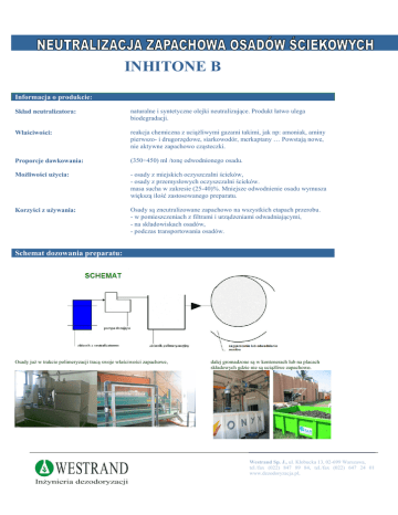 INHITONE B Informacja o produkcie: Skład neutralizatora: naturalne i syntetyczne olejki neutralizujące. Produkt łatwo ulega biodegradacji. Właściwości: reakcja chemiczna z uciążliwymi gazami takimi, jak np: amoniak, aminy pierwszo- i drugorzędowe, siarkowodór, merkaptany … Powstają nowe, nie aktywne zapachowo cząsteczki. Proporcje dawkowania: (350÷450) ml /tonę odwodnionego osadu. Możliwości użycia: - osady z miejskich oczyszczalni ścieków, - osady z przemysłowych oczyszczalni ścieków. masa sucha w zakresie (25-40)%. Mniejsze odwodnienie osadu wymusza większą ilość zastosowanego preparatu. Korzyści z używania: Osady są zneutralizowane zapachowo na wszystkich etapach przerobu. - w pomieszczeniach z filtrami i urządzeniami odwadniającymi, - na składowiskach osadów, - podczas transportowania osadów. Schemat dozowania preparatu: Osady już w trakcie polimeryzacji tracą swoje właściwości zapachowe, dalej gromadzone są w kontenerach lub na placach składowych gdzie nie są uciążliwe zapachowo. Westrand Sp. J., ul. Kłobucka 13, 02-699 Warszawa, tel./fax (022) 847 89 84, tel./fax (022) 647 24 01 www.dezodoryzacja.pl, INHITONE B Informacje techniczne: Właściwości: 4,5< pH <7,5 gęstość = 1,0 ±0,1 Opakowania: 30, 60, 200 litrów. Przechowywanie: w temperaturze pokojowej (minimum +8C). Przechowywać w oryginalnie zamkniętym opakowaniu. Producent: Westrand Int. Francja. Trwałość: 1 rok w normalnych warunkach przechowywania. Sposób dozowania: dodanie substancji reagującej do zbiornika polimeryzacyjnego, gdzie preparat zostaje wymieszany i dodany do zagęszczonych ścieków : - ręcznie - za pomocą pompy dozującej Główne referencje z VEOLIA EAU: - Toulon (La Garde) - Saint-Tropez - Ramatuelle - Sainte-Clothilde (Île de La Réunion) - Ajaccio (Corse) - Saint-Fons (Lyon) etc… Zalety Eliminacja uciążliwości zapachowej suszarni, placów odkładczych i składowisk osadów. Osad nie jest uciążliwy zapachowo także podczas jego transportu do zakładu utylizacyjnego. Niskie koszty w porównaniu z innymi metodami np.: dezodoryzacji powierzchniowej lub kurtyny antyodorowej. Duża wygoda stosowania, nie angażuje czasu obsługi technicznej a instalacja praktycznie nie wymaga konserwacji. Westrand Sp. J., ul. Kłobucka 13, 02-699 Warszawa, tel./fax (022) 847 89 84, tel./fax (022) 647 24 01 www.dezodoryzacja.pl,
