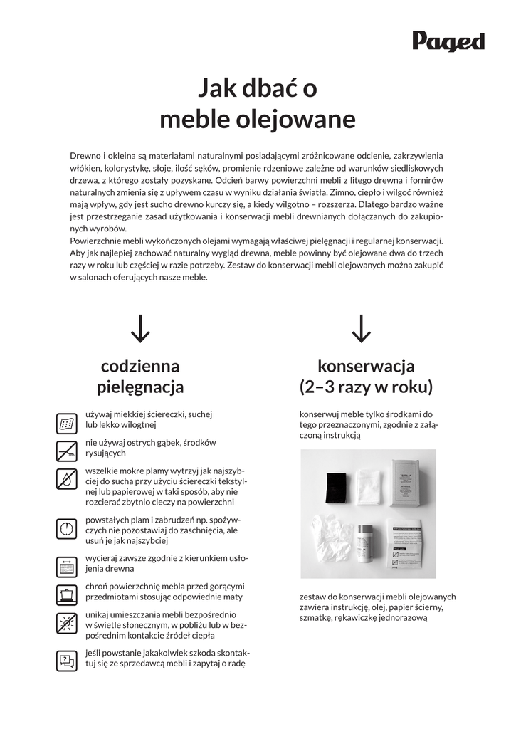 Jak dbać o meble olejowane Drewno i okleina są materiałami naturalnymi posiadającymi zróżnicowane odcienie, zakrzywienia włókien, kolorystykę, słoje, ilość sęków, promienie rdzeniowe zależne od warunków siedliskowych drzewa, z którego zostały pozyskane. Odcień barwy powierzchni mebli z litego drewna i fornirów naturalnych zmienia się z upływem czasu w wyniku działania światła. Zimno, ciepło i wilgoć również mają wpływ, gdy jest sucho drewno kurczy się, a kiedy wilgotno – rozszerza. Dlatego bardzo ważne jest przestrzeganie zasad użytkowania i konserwacji mebli drewnianych dołączanych do zakupionych wyrobów. Powierzchnie mebli wykończonych olejami wymagają właściwej pielęgnacji i regularnej konserwacji. Aby jak najlepiej zachować naturalny wygląd drewna, meble powinny być olejowane dwa do trzech razy w roku lub częściej w razie potrzeby. Zestaw do konserwacji mebli olejowanych można zakupić w salonach oferujących nasze meble. codzienna pielęgnacja ? • używaj miekkiej ściereczki, suchej lub lekko wilogtnej • nie używaj ostrych gąbek, środków rysujących • wszelkie mokre plamy wytrzyj jak najszybciej do sucha przy użyciu ściereczki tekstylnej lub papierowej w taki sposób, aby nie rozcierać zbytnio cieczy na powierzchni • powstałych plam i zabrudzeń np. spożywczych nie pozostawiaj do zaschnięcia, ale usuń je jak najszybciej • wycieraj zawsze zgodnie z kierunkiem usłojenia drewna • chroń powierzchnię mebla przed gorącymi przedmiotami stosując odpowiednie maty • unikaj umieszczania mebli bezpośrednio w świetle słonecznym, w pobliżu lub w bezpośrednim kontakcie źródeł ciepła • jeśli powstanie jakakolwiek szkoda skontaktuj się ze sprzedawcą mebli i zapytaj o radę konserwacja (2–3 razy w roku) • konserwuj meble tylko środkami do tego przeznaczonymi, zgodnie z załączoną instrukcją • zestaw do konserwacji mebli olejowanych zawiera instrukcję, olej, papier ścierny, szmatkę, rękawiczkę jednorazową Instrukcja konserwacji mebli olejowanych Oleje są produktem na bazie naturalnych składników i z założenia cały czas wnikają wgłąb drewna. Po jakimś czasie mogą powstać cechy takie jak: szorstkość, matowe miejsca, przebarwienia, wytarte lub błyszczące brzegi, plamy, lekkie zarysowania. Wówczas należy zastosować zestaw do konserwacji mebli olejowanych. 1. Odpyl powierzchnię mebla. 2. Nanieś równomiernie, miękką szmatką niewielką ilość oleju do pielęgnacji i pozostaw na kilka minut. 3. Wytrzyj jego nadmiar do sucha. 4. Meble zostaw do wyschnięcia na 24 godziny. 5. W przypadku bardziej porowatego drewna, czynność powtórz po 2–3 dniach. 6. Wszelkie uszkodzenia powierzchni olejowanych (np. plamy z czerwonego wina, zadrapania) zeszlifuj papierem o granulacji P240 lub P320 zgodnie z rysunkiem drewna. Uwaga: Ze względu na ryzyko samozapłonu materiału używaną szmatkę należy moczyć w wodzie. Jeśli zastosujesz te proste instrukcje w praktyce, będziesz cieszyć się olejowanymi meblami przez wiele lat!