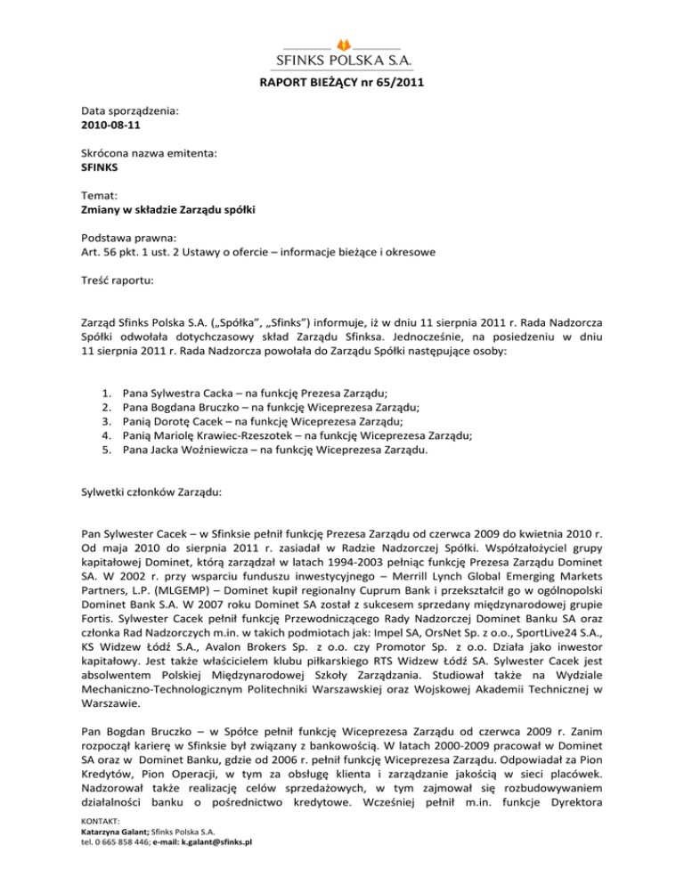 RAPORT BIEŻĄCY nr 65/2011 Data sporządzenia: 2010-08-11 Skrócona nazwa emitenta: SFINKS Temat: Zmiany w składzie Zarządu spółki Podstawa prawna: Art. 56 pkt. 1 ust. 2 Ustawy o ofercie – informacje bieżące i okresowe Treść raportu: Zarząd Sfinks Polska S.A. („Spółka”, „Sfinks”) informuje, iż w dniu 11 sierpnia 2011 r. Rada Nadzorcza Spółki odwołała dotychczasowy skład Zarządu Sfinksa. Jednocześnie, na posiedzeniu w dniu 11 sierpnia 2011 r. Rada Nadzorcza powołała do Zarządu Spółki następujące osoby: 1. 2. 3. 4. 5. Pana Sylwestra Cacka – na funkcję Prezesa Zarządu; Pana Bogdana Bruczko – na funkcję Wiceprezesa Zarządu; Panią Dorotę Cacek – na funkcję Wiceprezesa Zarządu; Panią Mariolę Krawiec-Rzeszotek – na funkcję Wiceprezesa Zarządu; Pana Jacka Woźniewicza – na funkcję Wiceprezesa Zarządu. Sylwetki członków Zarządu: Pan Sylwester Cacek – w Sfinksie pełnił funkcję Prezesa Zarządu od czerwca 2009 do kwietnia 2010 r. Od maja 2010 do sierpnia 2011 r. zasiadał w Radzie Nadzorczej Spółki. Współzałożyciel grupy kapitałowej Dominet, którą zarządzał w latach 1994-2003 pełniąc funkcję Prezesa Zarządu Dominet SA. W 2002 r. przy wsparciu funduszu inwestycyjnego – Merrill Lynch Global Emerging Markets Partners, L.P. (MLGEMP) – Dominet kupił regionalny Cuprum Bank i przekształcił go w ogólnopolski Dominet Bank S.A. W 2007 roku Dominet SA został z sukcesem sprzedany międzynarodowej grupie Fortis. Sylwester Cacek pełnił funkcję Przewodniczącego Rady Nadzorczej Dominet Banku SA oraz członka Rad Nadzorczych m.in. w takich podmiotach jak: Impel SA, OrsNet Sp. z o.o., SportLive24 S.A., KS Widzew Łódź S.A., Avalon Brokers Sp. z o.o. czy Promotor Sp. z o.o. Działa jako inwestor kapitałowy. Jest także właścicielem klubu piłkarskiego RTS Widzew Łódź SA. Sylwester Cacek jest absolwentem Polskiej Międzynarodowej Szkoły Zarządzania. Studiował także na Wydziale Mechaniczno-Technologicznym Politechniki Warszawskiej oraz Wojskowej Akademii Technicznej w Warszawie. Pan Bogdan Bruczko – w Spółce pełnił funkcję Wiceprezesa Zarządu od czerwca 2009 r. Zanim rozpoczął karierę w Sfinksie był związany z bankowością. W latach 2000-2009 pracował w Dominet SA oraz w Dominet Banku, gdzie od 2006 r. pełnił funkcję Wiceprezesa Zarządu. Odpowiadał za Pion Kredytów, Pion Operacji, w tym za obsługę klienta i zarządzanie jakością w sieci placówek. Nadzorował także realizację celów sprzedażowych, w tym zajmował się rozbudowywaniem działalności banku o pośrednictwo kredytowe. Wcześniej pełnił m.in. funkcje Dyrektora KONTAKT: Katarzyna Galant; Sfinks Polska S.A. tel. 0 665 858 446; e-mail: [email protected] Departamentu Ryzyka Kredytowego i Zastępcy Dyrektora w Departamencie Windykacji. Ukończył Finanse i Bankowość na Akademii Ekonomicznej w Poznaniu. Pani Dorota Cacek – od początku lat 90-tych związana z sektorem finansów i bankowości. W 1993 roku objęła funkcję Wiceprezesa Zarządu Dominet SA. W latach 2001-2002 aktywnie współuczestniczyła w negocjacjach zmierzających do pozyskania inwestora – amerykańskiego funduszu private equity Merrill Lynch Global Emerging Markets Partners L.P., przy wsparciu którego Dominet S.A. zakupił regionalny Cuprum Bank. Od 2002 roku zaangażowana była w proces jego budowy i przekształcania w ogólnopolski Dominet Bank. Jako Wiceprezes Zarządu banku w latach 2002-2007 odpowiadała za politykę personalną, komunikację wewnętrzną oraz relacje z mediami. Nadzorowała także rozwój sieci placówek terenowych i działania marketingowe. W 2007 roku Dominet SA został z sukcesem sprzedany międzynarodowej grupie Fortis. W latach 2002-2007 była Wiceprzewodniczącą Rady Nadzorczej Dolnośląskiej Szkoły Bankowej. W 2009 roku weszła do Rady Nadzorczej spółki Redan, gdzie pełni funkcję Wiceprzewodniczącej. W latach 2010-2011 zasiadała w Radzie Nadzorczej RTS Widzew Łódź SA, również w roli Wiceprzewodniczącej. Ukończyła filologię angielską na Uniwersytecie Warszawskim oraz liczne szkolenia z zakresu bankowości i marketingu w USA. Obecnie Dorota Cacek działa jako inwestor kapitałowy. Pani Mariola Krawiec-Rzeszotek – od kwietnia 2010 r. pełniła funkcję Prezesa Zarządu Sfinksa. Menedżer z wieloletnim doświadczeniem w dziedzinie zarządzania. Przez ponad 15 lat działa w branży finansowej. W latach 2002 – 2007 pełniła funkcję Wiceprezesa Dominet Banku, gdzie odpowiadała m.in. za politykę kredytową i zarządzanie ryzykiem kredytowym banku, politykę tworzenia rezerw, windykację należności, budowanie i wdrażanie zarządzania procesowego oraz koordynację zarządzania informacją. Wcześniej w latach 1993 – 2002 pracowała w zarządzie Dominet SA, gdzie przez pierwsze 2 lata pełniła funkcję Prezesa Zarządu, a następnie Wiceprezesa Zarządu. Od 2007 r. zasiada w radach nadzorczych spółek OrsNet i Sportlive24. Jako Prezes Zarządu nadzoruje działalność spółek z branży nieruchomości Etob Warszawa Sp. z o.o. oraz Maran Development Sp. z o.o. Jest absolwentką Akademii Wychowania Fizycznego w Poznaniu oraz studium podyplomowego z zakresu bankowości na Uniwersytecie Warszawskim. Ukończyła również liczne szkolenia, m.in. z zakresu zarządzania finansowego, zarządzania personelem oraz ryzyka kredytowego w banku. Pan Jacek Woźniewicz – pełnił funkcję Wiceprezesa Zarządu w Sfinksie od maja 2010 r. Wcześniej związany był z instytucjami rynku finansowego. W latach 2009-2010 pracował w Fortis Bank Polska SA, gdzie pełnił funkcję Zastępcy Dyrektora Departamentu Zarządzania Kapitałem, ALM i Finansowania. Wcześniej związany był z Cuprum Bankiem SA (1998-2002), a następnie z Dominet Bankiem SA (2002 – 2009), gdzie pełnił funkcję Dyrektora Departamentu Zarządzania Aktywami i Pasywami, a następnie Dyrektora Departamentu Ryzyk i Kontrolingu. Odpowiadał m.in. za 