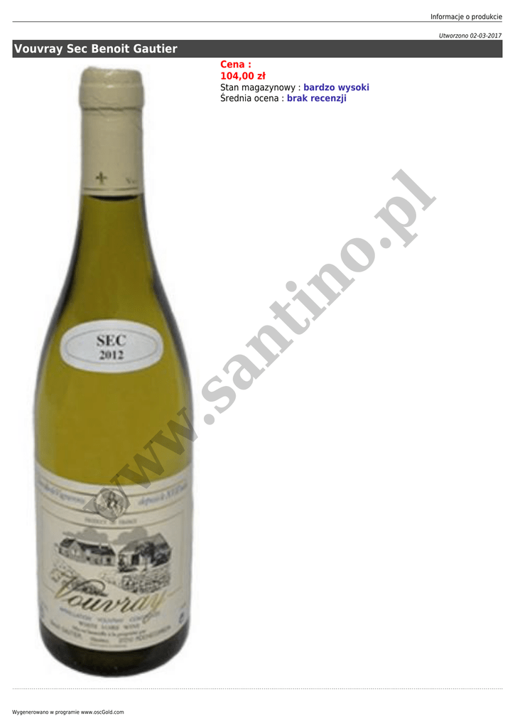 Informacje o produkcie Utworzono 02-03-2017 Vouvray Sec Benoit Gautier Cena : 104,00 zł w w w .s an t in o. pl Stan magazynowy : bardzo wysoki Średnia ocena : brak recenzji Wygenerowano w programie www.oscGold.com Kraj: Francja Region/apelacja: Dolina Loary Szczep: Chenin Blanc Pojemność: 0.75l Smak: Wytrawne Kolor: Białe w w w .s an t in o. pl Klasyczne Vouvray, skomponowane w 100% z odmiany Chenin Blanc, z 25letnich krzewów, uprawianych na gliniastych i bogatych w krzem glebach. Świeże i soczyste wino, z wyczuwalnymi aromatami białych brzoskwiń, melona i gruszek. W tle bardzo elegancka mineralność, usta dobrze zbudowane z wyważoną kwasowością i intrygującym finiszem, z nutą marcepana. Maksymalny potencjał leżakowania tego wina szacowany jest na około 8 lat.