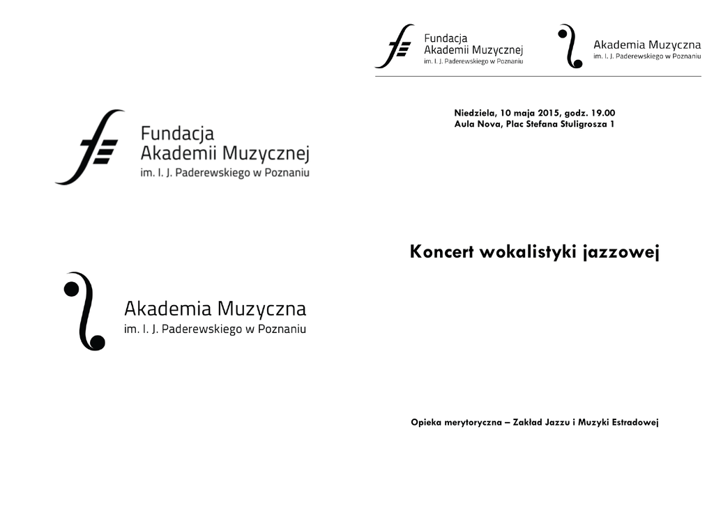 Niedziela, 10 maja 2015, godz. 19.00 Aula Nova, Plac Stefana Stuligrosza 1 Koncert wokalistyki jazzowej Opieka merytoryczna – Zakład Jazzu i Muzyki Estradowej Hanna Gieda In A Sentimental Mood – Duke Ellington / Manny Kurtz Wschód słońca nad stadniną – Seweryn Krajewski / Krzysztof Dzikowski Rosemary's Baby – Krzysztof Komeda / Wojciech Młynarski Ulyana Hedzik Naima – John Coltrane / John Hendricks Don't Blame Me – Iwona Witek / Ulyana Hedzik Afro Blue – John Coltraine / Oscar Brown Jr. Jagoda Uniewicz Open Your Eyes, You Can Fly – Chick Corea / Neville Potter Cichy wielbiciel – Paweł Betley / Magda Czapińska dr hab. Janusz Szrom – przygotowanie wokalne Zespół: Katarzyna Stroińska – fortepian Jacek Szwaj – fortepian Wojciech Doleżyczek – gitara Filip Postaremczak – bas Dawid Wirmański – Perkusja Iwona Wirek – trąbka Łukasz Mantej – saksofon tenorowy mgr Maciej Kociński – przygotowanie zespołu Samba życia – Sergio Mendez / Jonasz Kofta (opr. Patryk Sikora) Spain – Chick Corea (opr. Piotr Scholz) Dla ciebie jestem sobą – Jerzy Wasowski / Jeremi Przybora (opr. Tobiasz Gotfried) Oblivion – Astor Piazzolla (opr. Paweł Chmiel) Modlitwa – Bułat Okudżawa (opr. Piotr Scholz) Tomasz Kaniewski – dyrygent Jacek Szwaj – fortepian Zbigniew Wrombel – kontrabas Krzysztof Przybyłowicz – perkusja Andrzej Mazurek – instrumenty perkusyjne Smyczki: I skrzypce: Julia Muraszko, Aleksandra Machaj, Marta Michalak II skrzypce: Olivia Danielewicz, Tomasz Cichy Altówki: Karolina Ratajczak, Martyna Kowzan *** Hanna Banaszak Śpiewa utwory w opracowaniu studentów kompozycji z aranżacją dr hab. Wojciech Olszewski – opieka merytoryczna Stoję na tobie ziemio – H. Banaszak (opr. Paweł Chmiel) Wyrzeźbiłam twoją twarz – Jerzy Matuszkiewicz / Agnieszka Osiecka (opr. Iwona Witek) Może to sen – K. Niedźwiecki, M. Lamch / T. Kordeusz (opr. Jakub Kraszewski) Wiolonczela: Joanna Błaszczyk Big band: Saksofony: Damian Kaczmarek, Kacper Krupa, Krzysztof Kuśmierek, Łukasz Mantej, Dawid Tokłowicz Trąbki: Jakub Jankowiak, Piotr Krawczyk, Patryk Rynkiewicz, Iwona Witek Puzony: Mateusz Filbrandt, Adam Kurek, Gracjan Matouszek, Justyna Śliwka Gitara elektryczna: Wojciech Doleżyczek Gitara akustyczna: Krzysztof Baranowski