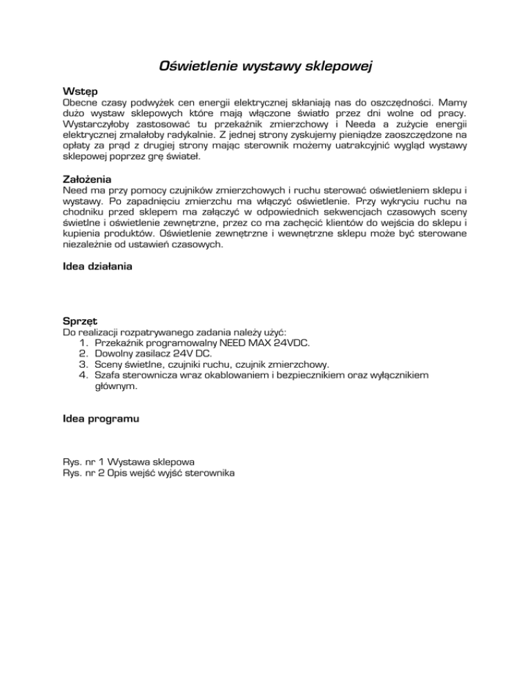 Oświetlenie wystawy sklepowej Wstęp Obecne czasy podwyżek cen energii elektrycznej skłaniają nas do oszczędności. Mamy dużo wystaw sklepowych które mają włączone światło przez dni wolne od pracy. Wystarczyłoby zastosować tu przekaźnik zmierzchowy i Needa a zużycie energii elektrycznej zmalałoby radykalnie. Z jednej strony zyskujemy pieniądze zaoszczędzone na opłaty za prąd z drugiej strony mając sterownik możemy uatrakcyjnić wygląd wystawy sklepowej poprzez grę świateł. Założenia Need ma przy pomocy czujników zmierzchowych i ruchu sterować oświetleniem sklepu i wystawy. Po zapadnięciu zmierzchu ma włączyć oświetlenie. Przy wykryciu ruchu na chodniku przed sklepem ma załączyć w odpowiednich sekwencjach czasowych sceny świetlne i oświetlenie zewnętrzne, przez co ma zachęcić klientów do wejścia do sklepu i kupienia produktów. Oświetlenie zewnętrzne i wewnętrzne sklepu może być sterowane niezależnie od ustawień czasowych. Idea działania Sprzęt Do realizacji rozpatrywanego zadania należy użyć: 1. Przekaźnik programowalny NEED MAX 24VDC. 2. Dowolny zasilacz 24V DC. 3. Sceny świetlne, czujniki ruchu, czujnik zmierzchowy. 4. Szafa sterownicza wraz okablowaniem i bezpiecznikiem oraz wyłącznikiem głównym. Idea programu Rys. nr 1 Wystawa sklepowa Rys. nr 2 Opis wejść wyjść sterownika Wystawa sklepowa Czujnik zmierzchowy Czujnik ruchu Czujnik ruchu Chodnik Oświetlenie zewnętrzne Scena oświetleniowa pierwsza Oświetlenie Scena oświetleniowa druga rys. nr 1 24V 0V +24V 0V 0V I1 I2 I3 I1 I2 I4 I5 I3 I4 I6 I7 I5 I6 I8 I7 I8 MODE RUN/STOP Q 3 Q 4 115-230V AC INPUT 8xAC Q1 Q2 Q3 Q4 OUTPUT 4xRELAY/10A Q 1 Q 2 Q1- oświetlenie zewnętrzne Q2- oświetlenie Q3- scena świetlan 1 Q4- scena świetlan 2 rys. nr 2