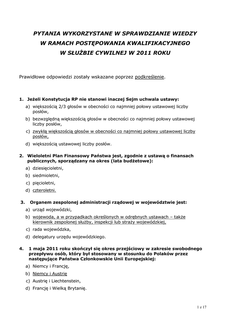 PYTANIA WYKORZYSTANE W SPRAWDZIANIE WIEDZY W RAMACH POSTĘPOWANIA KWALIFIKACYJNEGO W SŁUŻBIE CYWILNEJ W 2011 ROKU Prawidłowe odpowiedzi zostały wskazane poprzez podkreślenie. 1. Jeżeli Konstytucja RP nie stanowi inaczej Sejm uchwala ustawy: a) większością 2/3 głosów w obecności co najmniej połowy ustawowej liczby posłów, b) bezwzględną większością głosów w obecności co najmniej połowy ustawowej liczby posłów, c) zwykłą większością głosów w obecności co najmniej połowy ustawowej liczby posłów, d) większością ustawowej liczby posłów. 2. Wieloletni Plan Finansowy Państwa jest, zgodnie z ustawą o finansach publicznych, sporządzany na okres (lata budżetowe): a) dziesięcioletni, b) siedmioletni, c) pięcioletni, d) czteroletni. 3. Organem zespolonej administracji rządowej w województwie jest: a) urząd wojewódzki, b) wojewoda, a w przypadkach określonych w odrębnych ustawach – także kierownik zespolonej służby, inspekcji lub straży wojewódzkiej, c) rada wojewódzka, d) delegatury urzędu wojewódzkiego. 4. 1 maja 2011 roku skończył się okres przejściowy w zakresie swobodnego przepływu osób, który był stosowany w stosunku do Polaków przez następujące Państwa Członkowskie Unii Europejskiej: a) Niemcy i Francję, b) Niemcy i Austrię c) Austrię i Liechtenstein, d) Francję i Wielką Brytanię. 1 z 17 5. Według ustawy z dnia 21.11. 2008 r. o służbie cywilnej wyższym stanowiskiem w służbie cywilnej nie jest stanowisko: a) zastępcy dyrektora departamentu w ministerstwie, b) zastępcy dyrektora wydziału w urzędzie wojewódzkim, c) zastępcy dyrektora departamentu w urzędzie Ochrony Konkurencji i Konsumentów, d) zastępcy kierownika urzędu stanu cywilnego. 6. Orzeczenia Trybunału Konstytucyjnego zapadają w myśl ustawy: a) jednogłośnie, b) zwykłą większością głosów, c) bezwzględną większością głosów, d) większością 2/3 głosów. 7. W odniesieniu do ustawy budżetowej Konstytucja RP nie przewiduje możliwości: a) przekazania przez Prezydenta RP ustawy do ponownego rozpatrzenia przez Sejm (weto), b) skierowania jej do Trybunału Konstytucyjnego celem zbadania jej zgodności z Konstytucją, c) wprowadzania zmian w trakcie prac Senatu RP, d) zgłaszania propozycji zmian nieuzgodnionych z Prezydium Sejmu w trzecim czytaniu. 8. Organ administracji publicznej żądający od strony zaświadczenia na potwierdzenie faktów lub stanu prawnego jest obowiązany: a) pobrać opłatę skarbową, b) wyznaczyć termin doręczenia zaświadczenia, c) wskazać organ właściwy do wydania zaświadczenia, d) wskazać przepis prawa wymagający urzędowego potwierdzenia tych faktów lub stanu prawnego w drodze zaświadczenia. 9. Strona podmiotowa odpowiedzialności za naruszenie dyscypliny finansów publicznych w ramach jednostek sektora finansów publicznych obejmuje: a) wszystkich pracowników jednostki, b) kierowników jednostek, osoby wchodzące w skład organu wykonującego budżet lub plan finansowy, pracowników, którym przekazano określone obowiązki w ramach gospodarki finansowej lub zamówień publicznych, c) wyłącznie osoby zatrudnione w ramach jednostek sektora finansów publicznych na podstawie mianowania lub powołania, d) wyłącznie obywateli polskich zatrudnionych na podstawie umowy o pracę. 2 z 17 10. Obecnie w ramach wspólnej polityki zagranicznej i bezpieczeństwa Unię Europejską reprezentuje: a) Wysoki przedstawiciel Unii do spraw zagranicznych i polityki bezpieczeństwa oraz stały przewodniczący Rady Europejskiej, b) Przewodniczący Parlamentu Europejskiego, c) Przewodniczący Komisji Europejskiej i stały przewodniczący Rady Unii Europejskiej, d) Prezydencja Rady ds. Ogólnych Unii Europejskiej. 11. Rozpiętość kierowania oznacza: a) zakres kompetencji na danym stanowisku, b) zakres wymagań sformułowany wobec danego stanowiska, c) liczbę pracowników bezpośrednio podległych danemu kierownikowi, d) liczbę pracowników pośrednio podległych danemu kierownikowi. 12. Według ustawy o ochronie informacji niejawnych świadectwo bezpieczeństwa przemysłowego jest dokumentem potwierdzającym: a) uprawnienia właściwych organów bezpieczeństwa państwa do kontrolowania określonych obiektów z punktu widzenia spełnienia wymagań ochrony tajemnicy państwowej, b) zabezpieczenie urządzenia służącego do gromadzenia lub przesyłania na odległość informacji niejawnych, c) zdolność osoby fizycznej do zatrudnienia u przedsiębiorcy na stanowisku, na którym osoba ta może mieć dostęp do informacji stanowiących tajemnicę państwową, d) zdolność przedsiębiorcy do ochrony informacji niejawnych o klauzuli "poufne" lub wyższej. 13. Według szacunków GUS osoby zamieszkałe w miastach stanowiły na koniec 2009 r.: a) 45% ogółu ludności Polski, b) 61% ogółu ludności Polski, c) 73% ogółu ludności Polski, d) 82% ogółu ludności Polski. 14. Pierwsza ocena w służbie cywilnej jest dokonywana: a) najpóźniej po upływie 6 miesięcy od dnia zatrudnienia, b) najpóźniej 14 dni przed upływem okresu na jaki została zawarta umowa o pracę, c) nie wcześniej niż po upływie 8 miesięcy od dnia zatrudnienia, d) po upływie 24 miesięcy od dnia zatrudnienia. 3 z 17 15. Prezydent odmawia podpisania ustawy: a) którą Trybunał Konstytucyjny uznał za niezgodną z Konstytucją, b) tylko podczas trwania sesji Sejmu, c) w razie braku kontrasygnaty premiera, d) na wniosek Rady Ministrów. 16. Pożyczka udzielona z budżetu jednostki samorządu terytorialnego klasyfikowana jest jako: a) dochody, b) wydatki, c) przychody, d) rozchody. 17. Sejm może wyrazić wotum zaufania: a) tylko ministrowi, b) tylko Radzie Ministrów, c) tylko Prezesowi Rady Ministrów, d) tylko na wniosek 46 posłów. 18. Miastem na prawach powiatu jest: a) miasto stołeczne Warszawa, b) gmina wykonująca zadania także innej gminy, c) powiat wykonujący zadania gminy, d) związek gmin wykonujący prawa powiatu