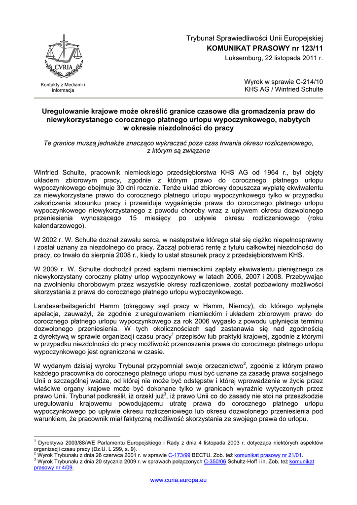 Trybunał Sprawiedliwości Unii Europejskiej KOMUNIKAT PRASOWY nr 123/11 Luksemburg, 22 listopada 2011 r. Wyrok w sprawie C-214/10 KHS AG / Winfried Schulte Kontakty z Mediami i Informacja Uregulowanie krajowe może określić granice czasowe dla gromadzenia praw do niewykorzystanego corocznego płatnego urlopu wypoczynkowego, nabytych w okresie niezdolności do pracy Te granice muszą jednakże znacząco wykraczać poza czas trwania okresu rozliczeniowego, z którym są związane Winfried Schulte, pracownik niemieckiego przedsiębiorstwa KHS AG od 1964 r., był objęty układem zbiorowym pracy, zgodnie z którym prawo do corocznego płatnego urlopu wypoczynkowego obejmuje 30 dni rocznie. Tenże układ zbiorowy dopuszcza wypłatę ekwiwalentu za niewykorzystane prawo do corocznego płatnego urlopu wypoczynkowego tylko w przypadku zakończenia stosunku pracy i przewiduje wygaśnięcie prawa do corocznego płatnego urlopu wypoczynkowego niewykorzystanego z powodu choroby wraz z upływem okresu dozwolonego przeniesienia wynoszącego 15 miesięcy po upływie okresu rozliczeniowego (roku kalendarzowego). W 2002 r. W. Schulte doznał zawału serca, w następstwie którego stał się ciężko niepełnosprawny i został uznany za niezdolnego do pracy. Zaczął pobierać rentę z tytułu całkowitej niezdolności do pracy, co trwało do sierpnia 2008 r., kiedy to ustał stosunek pracy z przedsiębiorstwem KHS. W 2009 r. W. Schulte dochodził przed sądami niemieckimi zapłaty ekwiwalentu pieniężnego za niewykorzystany coroczny płatny urlop wypoczynkowy w latach 2006, 2007 i 2008. Przebywając na zwolnieniu chorobowym przez wszystkie okresy rozliczeniowe, został pozbawiony możliwości skorzystania z prawa do corocznego płatnego urlopu wypoczynkowego. Landesarbeitsgericht Hamm (okręgowy sąd pracy w Hamm, Niemcy), do którego wpłynęła apelacja, zauważył, że zgodnie z uregulowaniem niemieckim i układem zbiorowym prawo do corocznego płatnego urlopu wypoczynkowego za rok 2006 wygasło z powodu upłynięcia terminu dozwolonego przeniesienia. W tych okolicznościach sąd zastanawia się nad zgodnością z dyrektywą w sprawie organizacji czasu pracy1 przepisów lub praktyki krajowej, zgodnie z którymi w przypadku niezdolności do pracy możliwość przenoszenia prawa do corocznego płatnego urlopu wypoczynkowego jest ograniczona w czasie. W wydanym dzisiaj wyroku Trybunał przypomniał swoje orzecznictwo2, zgodnie z którym prawo każdego pracownika do corocznego płatnego urlopu musi być uznane za zasadę prawa socjalnego Unii o szczególnej wadze, od której nie może być odstępstw i której wprowadzenie w życie przez właściwe organy krajowe może być dokonane tylko w granicach wyraźnie wytyczonych przez prawo Unii. Trybunał podkreślił, iż orzekł już3, iż prawo Unii co do zasady nie stoi na przeszkodzie uregulowaniu krajowemu powodującemu utratę prawa do corocznego płatnego urlopu wypoczynkowego po upływie okresu rozliczeniowego lub okresu dozwolonego przeniesienia pod warunkiem, że pracownik miał faktyczną możliwość skorzystania ze swojego prawa do urlopu. 1 Dyrektywa 2003/88/WE Parlamentu Europejskiego i Rady z dnia 4 listopada 2003 r. dotycząca niektórych aspektów organizacji czasu pracy (Dz.U. L 299, s. 9). 2 Wyrok Trybunału z dnia 26 czerwca 2001 r. w sprawie C-173/99 BECTU. Zob. też komunikat prasowy nr 21/01. 3 Wyrok Trybunału z dnia 20 stycznia 2009 r. w sprawach połączonych C-350/06 Schultz-Hoff i in. Zob. też komunikat prasowy nr 4/09. www.curia.europa.eu Trybunał stwierdził następnie, że w szczególnych okolicznościach, takich jak w niniejszym postępowaniu, pracownik niezdolny do pracy przez czas kilku następujących po sobie okresów rozliczeniowych, miałby prawo zgromadzenia, w nieograniczonym wymiarze, wszystkich praw do corocznego płatnego urlopu wypoczynkowego nabytych w okresie swojej nieobecności w pracy. Niemniej jednak prawo do gromadzenia w nieograniczonym wymiarze praw do corocznego płatnego urlopu wypoczynkowego nabytych w okresie niezdolności do pracy nie odpowiadałoby już celowi prawa do corocznego płatnego urlopu wypoczynkowego. Cel ten obejmuje dwa aspekty, mianowicie umożliwienie pracownikowi zarówno odpoczynku od pracy, jak i dysponowania okresem wytchnienia i wolnego czasu. Choć pozytywne oddziaływanie corocznego płatnego urlopu na bezpieczeństwo i zdrowie pracownika wywiera w pełni skutek, gdy jest on wykorzystany w roku, w którym jest on przewidziany, tj. w trwającym właśnie roku, to jednak czas wypoczynku nie traci pod tym względem swego znaczenia, gdy jest wykorzystany w trakcie roku następnego. Jednakże w zakresie, w jakim przeniesienie wykracza poza określone granice czasowe, coroczny urlop wypoczynkowy jest pozbawiony swego pozytywnego oddziaływania na pracownika z punktu widzenia jego celu jako czasu wypoczynku, zachowując jedynie swoją funkcję jako okres wytchnienia i wolnego czasu. W konsekwencji, z uwagi na cel prawa do corocznego płatnego urlopu wypoczynkowego, pracownik niezdolny do pracy przez okres kilku następujących po sobie lat, nie może mieć prawa do gromadzenia w nieograniczonym wymiarze praw do corocznego płatnego urlopu wypoczynkowego nabytych w tym okresie. W tym kontekście Trybunał orzekł, że poszanowanie tego prawa, którego celem jest ochrona pracownika, wymaga, aby każdy okres dozwolonego przeniesienia uwzględniał szczególne okoliczności, w których znajduje się pracownik niezdolny do pracy przez czas kilku następujących po sobie okresów rozliczeniowych. I tak, okres ten musi w szczególności gwarantować pracownikowi możliwość dysponowania, w razie potrzeby, okresami wypoczynku, które mogą zostać rozłożone, zaplanowane i dostępne w perspektywie dłuższego czasu. Ponadto każdy okres dozwolonego przeniesienia musi znacznie wykraczać poza czas trwania okresu rozliczeniowego, w odniesieniu do którego został przyznany. Ponadto okres 