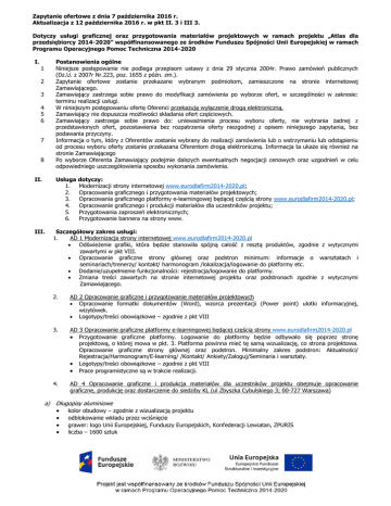 Zapytanie ofertowe z dnia 7 października 2016 r. Aktualizacja z 12 października 2016 r. w pkt II. 3 i III 3. Dotyczy usługi graficznej oraz przygotowania materiałów projektowych w ramach projektu „Atlas dla przedsiębiorcy 2014-2020” współfinansowanego ze środków Funduszu Spójności Unii Europejskiej w ramach Programu Operacyjnego Pomoc Techniczna 2014-2020 I. Postanowienia ogólne Niniejsze postępowanie nie podlega przepisom ustawy z dnia 29 stycznia 2004r. Prawo zamówień publicznych (Dz.U. z 2007r Nr.223, poz. 1655 z późn. zm.). Zapytanie ofertowe zostanie przekazane wybranym podmiotom, zamieszczone na stronie internetowej Zamawiającego. Zamawiający zastrzega sobie prawo do modyfikacji zamówienia po wyborze ofert, w szczególności w zakresie: terminu realizacji usługi. W niniejszym postępowaniu ofertę Oferenci przekazują wyłączenie drogą elektroniczną. Zamawiający nie dopuszcza możliwości składania ofert częściowych. Zamawiający zastrzega sobie prawo do: unieważnienia procesu wyboru oferty, nie wybrania żadnej z przedstawionych ofert, pozostawienia bez rozpatrzenia oferty niezgodnej z opisem niniejszego zapytania, bez podawania przyczyny. Informacja o tym, który z Oferentów zostanie wybrany do realizacji zamówienia lub o wstrzymaniu lub odstąpieniu od procesu wyboru oferty zostanie przekazana Oferentom drogą elektroniczną. Informacja ta ukaże się również na stronie Zamawiającego Po wyborze Oferenta Zamawiający podejmie dalszych ewentualnych negocjacji cenowych oraz uzgodnień w celu odpowiedniego uszczegółowienia sposobu wykonania zamówienia. 1 2 3 4 5 6 7 8 II. Usługa dotyczy: 1. Modernizacji strony internetowej www.eurodlafirm2014-2020.pl; 2. Opracowania graficznego i przygotowania materiałów projektowych; 3. Opracowania graficznego platformy e-learningowej będącej częścią strony www.eurodlafirm2014-2020.pl; 4. Opracowanie graficznego i produkcji materiałów dla uczestników projektu; 5. Przygotowania zaproszeń elektronicznych; 6. Przygotowanie bannera na strony www. III. Szczegółowy zakres usługi: 1. AD 1 Modernizacja strony internetowej www.eurodlafirm2014-2020.pl Odświeżenie grafiki, która będzie stanowiła spójną całość z resztą produktów, zgodnie z wytycznymi zawartymi w pkt VIII. Opracowanie graficzne strony głównej oraz podstron minimum: informacje o warsztatach i seminariach/trenerzy/ kontakt/ harmonogram /lokalizacja/logowanie do platformy etc. Dodanie/uzupełnienie funkcjonalności: rejestracja/logowanie do platformy. Zmiana treści zawartych na stronie internetowej projektu oraz podstronach zgodnie z wytycznymi Zamawiającego. 2. 3. AD 2 Opracowanie graficzne i przygotowanie materiałów projektowych Opracowanie formatki dokumentów (Word), wzorca prezentacji (Power point) ulotki informacyjnej, wizytówek. Logotypy/treści obowiązkowe – zgodnie z pkt VIII AD 3 Opracowanie graficzne platformy e-learningowej będącej częścią strony www.eurodlafirm2014-2020.pl Przygotowanie graficzne platformy. Logowanie do platformy będzie odbywało się poprzez stronę 4. projektową, o której mowa w pkt. 3. Platforma powinna mieć tę samą wizualizację, co strona projektowa. Opracowanie graficzne strony głównej oraz podstron. Minimalny zakres podstron: Aktualności/ Rejestracja/Harmonogram/E-learning/ /Kontakt/ Ankiety/Zaloguj/Seminaria i warsztaty. Logotypy/treści obowiązkowe – zgodnie z pkt VIII Prace programistyczne są w trakcie realizacji. AD 4 Opracowanie graficzne i produkcja materiałów dla uczestników projektu obejmuje opracowanie graficzne, produkcję oraz dostarczenie do siedziby KL (ul Zbyszka Cybulskiego 3; 00-727 Warszawa) a) Długopisy aluminiowe kolor obudowy – zgodnie z wizualizacją projektu odblokowanie wkładu przez wciśnięcie grawer: logo Unii Europejskiej, Funduszy Europejskich, Konfederacji Lewiatan, ZPURIS liczba – 1600 sztuk b) Notes reklamowy A5 z indywidualnym nadrukiem jednostronnym druk offsetowy jednostronny Rozmiar: 148x210 mm Papier niepowlekany, 80g Druk: 4/0 CMYK (kolorowy) Klejenie górne w blok po 25 kartek Kartonik na spód bloczka Nakład: 1600 sztuk Logotypy/treści obowiązkowe – zgodnie z pkt VIII c) Teczki z indywidualnym nadrukiem Teczka ze skrzydełkami z formatu A2+ format: 220x307 mm po złożeniu papier - 400g., folia satyna 1+0 kolorystyka – 4+1 Oprawa - sztancowanie w wykrojnika Nakład: 1600 sztuk Logotypy/treści obowiązkowe – zgodnie z pkt VIII d) Roll-up 1 sztuka 100x200 cm drukowany na materiale typu PET z przekładką blokującą światło (blockout). Materiał dwukrotnie zalaminowany klejem, uniemożliwiając przenikanie światła z obu stron roll-upa. e) Wizytówki format - 50 x 90 papier - kreda matt 350g. kolorystyka - 4+4 ; + folia satynowa 2-str. Nakład: 400sztuk (4x100) Logotypy/treści obowiązkowe – zgodnie z pkt VIII 5. 6. AD 5 Przygotowanie zaproszeń elektronicznych Przygotowanie szablonu zaproszenia elektronicznego na seminaria oraz warsztaty organizowane przez zamawiającego. Przygotowanie wzoru projektu graficznego zaproszenia w wersji elektronicznej dla 2 typów wydarzeń seminariów oraz warsztatów z konsultacjami indywidualnymi. Szablony winny być edytowalne. Wzory powinny dawać możliwość edycji i zmiany treści np. data i miejsce wydarzenia, program, osoby kontaktowe, przekierowanie na stronę rejestracji na wydarzenie etc. Zaproszenie do wysyłki w Outlooku/ systemie SARE/ System FreshMail. Logotypy/treści obowiązkowe – zgodnie z pkt VIII AD 6 Przygotowanie bannera na strony www KL oraz ZPURIS Przygotowanie bannera www promującego seminaria oraz warsztaty organizowane przez Zamawiającego. Przygotowanie banneru na stronę internetową KL (http://konfederacjalewiatan.pl) oraz ZPURIS (http://www.zpuris.org.pl). Specyfikacja banneru: Promobox duży 574x211 px IV. Termin realizacji październik- 5 listopada 2016. Zamawiający dopuszcza przesunięcie/ zmianę terminu. V. Oferta powinna zawierać: