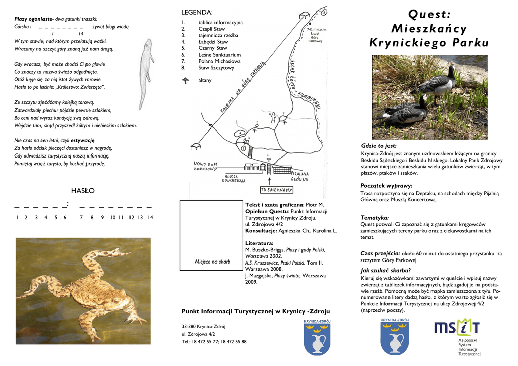Płazy ogoniaste- dwa gatunki traszki: Górska i _ _ _ _ _ _ _ _ żywot błogi wiodą 1 14 W tym stawie, nad którym przelatują ważki. Wracamy na szczyt góry znaną już nam drogą. Gdy wracasz, być może chodzi Ci po głowie Co znaczy ta nazwa świeżo odgadnięta. Otóż kryje się za nią istot żywych mrowie. Hasło to po łacinie: „Królestwo: Zwierzęta”. Quest: Mieszkańcy K r y n i c k i e g o Pa r k u LEGENDA: 1. 2. 3. 4. 5. 6. 7. 8. tablica informacyjna Czapli Staw tajemnicza rzeźba Łabędzi Staw Czarny Staw Leśne Sanktuarium Polana Michasiowa Staw Szczytowy altany Ze szczytu zjeżdżamy kolejką torową. Zatwardziały piechur pójdzie pewnie szlakiem, Bo ceni nad wyraz kondycję swą zdrową. Wejdzie tam, skąd przyszedł żółtym i niebieskim szlakiem. Nie czas na sen letni, czyli estywację. Za hasło odcisk pieczęci dostaniesz w nagrodę, Gdy odwiedzisz turystyczną naszą informację. Pamiętaj wciąż turysto, by kochać przyrodę. Gdzie to jest: Krynica-Zdrój jest znanym uzdrowiskiem leżącym na granicy Beskidu Sądeckiego i Beskidu Niskiego. Lokalny Park Zdrojowy stanowi miejsce zamieszkania wielu gatunków zwierząt, w tym płazów, ptaków i ssaków. Początek wyprawy: HASŁO _ _ _ _ _ _: _ _ _ _ _ _ _ _ 1 7 2 3 4 5 6 8 9 Tekst i szata graficzna: Piotr M. Opiekun Questu: Punkt Informacji Turystycznej w Krynicy Zdroju, ul. Zdrojowa 4/2 Konsultacje: Agnieszka Ch., Karolina L. 10 11 12 13 14 Miejsce na skarb Literatura: M. Buszko-Briggs, Płazy i gady Polski, Warszawa 2002. A.S. Kruszewicz, Ptaki Polski. Tom II. Warszawa 2008. J. Mazgajska, Płazy świata, Warszawa 2009. Punkt Informacji Turystycznej w Krynicy -Zdroju 33-380 Krynica-Zdrój ul. Zdrojowa 4/2 Tel.: 18 472 55 77; 18 472 55 88 Trasa rozpoczyna się na Deptaku, na schodach między Pijalnią Główną oraz Muszlą Koncertową. Tematyka: Quest pozwoli Ci zapoznać się z gatunkami kręgowców zamieszkujących tereny parku oraz z ciekawostkami na ich temat. Czas przejścia: około 60 minut do ostatniego przystanku za szczytem Góry Parkowej. Jak szukać skarbu? Kieruj się wskazówkami zawartymi w queście i wpisuj nazwy zwierząt z tabliczek informacyjnych, bądź zgaduj je na podstawie rzeźb. Pomocną może być mapka zamieszczona z tyłu. Ponumerowane litery dadzą hasło, z którym warto zgłosić się w Punkcie Informacji Turystycznej na ulicy Zdrojowej 4/2 (naprzeciw poczty). Witaj drogi turysto –oto Twe zadanie: Pisz w trasie nazwy zwierząt -czasami z tabliczek, Z numerami literki dadzą rozwiązanie, Którym będzie hasło bardzo tajemnicze. Dość mowy o płazach, wracamy na schody. Stoi na ich szczycie rzeźba tajemnicza. Sprawdź, jakie to zwierzę –niezwykłej urody Mały to _ _ _ _ _ _ _ –chyba w trakcie wycia. 12 W centrum miasta jest deptak i strefa piechura. Stoi tu pijalnia mineralnej wody, Za którą jest wzniesienie -to Parkowa Góra. Tuż obok budynku znajdują się schody. Podążaj nimi, aż ujrzysz tablicę -Schemat parku, w którym niejedno jest drzewo, Ścieżki i zwierzęta –wszystkiego nie zliczę. Zapoznaj się z planem i skieruj się w lewo. Znajdziesz w końcu jeziorko otoczone murem. To Czapli Staw –w nazwie pewien ptak się skrywa. Czytaj teraz z tabliczki ważne słowa, które Zdradzą jego gatunek –to jest CZAPLA _ _ _ _. 9 Nie zdążyły mu wyrosnąć nawet jeszcze rogi. Ssak parzystokopytny –„dlaczego?” –ktoś spyta. „Czy jest tak dlatego, że ma cztery nogi?” Cóż, parzyste liczby palców tworzą mu kopyta. Czasem, w wodzie jeziorka nagrzanej od słońca, W liściach, na kamieniu albo w kupce trawy Spotkać też możemy długiego zaskrońca, Co ma w tyle głowy parę plam białawych. Idź teraz znów w lewo, po dróg skrzyżowanie. Nawał jest tu przejść, ale wybrać które? Obierz teraz to kostką brukowane, Co zawraca ostro w prawo, a nadto pod górę. Ścieżka wiedzie dalej i nieco pod górę. Czasem z drzewa na drzewo wiewiórka gdzieś skoczy Nad sanktuarium Maryi z Jej piękną figurą. Można stanąć kontemplując zakątek uroczy. Kiedy krótki odcinek drogi pokonamy, Znajdziemy zbiornik , a w nim wodne ptaki. Jako „Staw Łabędzi” wszyscy go tu znamy. By wpisać nowe nazwy, patrz znowu na znaki. Wyżej jest zbieg dróg i Michasia Polana Idź tu prosto ścieżką, co w prawo zawija Bitą drogą, przy której dostrzeżesz _ _ _ _ _ _ _, Samce kaczek krzyżówek –to zielone głowy. ŁABĘDŹ _ _ _ _ _ stawowi swą nazwę nadaje. 2 6 _ _ _ _ _ _ _ _ Wpisz teraz do questu obie nazwy nowe: To „ROPUCHA _ _ _ _ _” oraz „ŻABA _ _ _ _ _ _”. Zwierzęta te to płazy bezogonowe. Ta grupa trwa od triasu, czyli już od dawna. W tyle głowy ropuch, tuż za oczodołem, Są skupiska jadu, które płazy chronią. Zwiemy je parotydem –przyusznym gruczołem, co w walce o życie skuteczną jest bronią. Parotyd ma też płaz, co ludzi unika. W razie zagrożenia swój ogon odtrąca. To salamandra – nazwa z perskiego języka, A znaczy to po prostu „w ogniu żyjąca”. 5 10 Małego tego płaza w świecie drapieżników Znamy z ciekawego odruchu obronnego. 13 Przez bobasa objęta jest jego szyja. Na prawo od stawu znowu mamy schody. Kiedy będziesz się wspinał, patrz także na boki. Znajdziesz dwie tablice na temat przyrody. Ważne są dla Ciebie –nie omiń ich wzrokiem. 7 4 Nazwy zwierząt ukryto w tekście o zbiorniku. Z nich dane nam wybrać _ _ _ _ _ _ GÓRSKIEGO, 11 się kojarzy z liściem nam klonowym, 8 _ _ _ 3 _ _ _ _ _ _ _ natomiast -z faraonów krajem. Żaby i ropuchy bez udziału wody Mnożyć się nie mogą, zatem każdej wiosny, Przybywszy z daleka, by rozpocząć gody, Łączą się w ampleksus -płazi splot miłosny. Składają wtedy jaja jako skrzek nam znane. Następnie z nich młode lęgną się kijanki. Jaja ropuch są małe, taśmą powiązane. Żabie –pokryte warstwą przezroczystej pianki. Ścieżka wiedzie wzdłuż brzegu, potem idzie w górę. Po prawej, w zaroślach zobaczysz altanę. A dalej po l