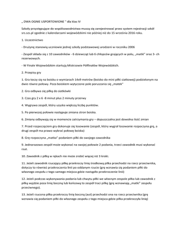 „ DWA OGNIE USPORTOWIONE " dla klas IV Szkoły przystępujące do współzawodnictwa muszą się zarejestrować przez system rejestracji szkół srs.szs.pl zgodnie z kalendarzami wojewódzkimi nie później niż do 15 września 2016 roku. 1. Uczestnictwo - Drużynę stanowią uczniowie jednej szkoły podstawowej urodzeni w roczniku 2006 - Zespół składa się z 10 zawodników - 6 dziewcząt lub 6 chłopców grających w polu, „matki” oraz 3- ch rezerwowych. - W Finale Wojewódzkim startują Mistrzowie Półfinałów Wojewódzkich. 2. Przepisy gry 1. Gra toczy się na boisku o wymiarach 14x9 metrów (boisko do mini piłki siatkowej) podzielonym na dwie równe połowy. Poza boiskiem wytyczone pole poruszania się „matek” 2. Gra odbywa się piłką do siatkówki 3. Czas gry 2 x 6 -8 minut plus 2 minuty przerwy 4. Wygrywa zespół, który uzyska większą liczbę punktów. 5. Po pierwszej połowie następuje zmiana stron boiska. 6. Zmiany odbywają się w momencie zatrzymania gry – dopuszczalna jest dowolna ilość zmian 7. Przed rozpoczęciem gry dokonuje się losowanie (zespół, który wygrał losowanie rozpoczyna grę, a drugi zespół ma prawo wybrać połowę boiska) 8. Grę rozpoczyna „matka” podaniem piłki do swojego zawodnika 9. Jednorazowo zespół może wykonać na swojej połowie 2 podania, trzeci zawodnik musi wykonać rzut. 10. Zawodnik z piłką w rękach nie może zrobić więcej niż 3 kroki. 11. Jeżeli zawodnik rzucający piłkę przekroczy linię środkową piłka przechodzi na rzecz przeciwnika, dotyczy to również przekroczenia linii po oddanym rzucie (grę wznawia się podaniem piłki do własnego zespołu z tego samego miejsca gdzie nastąpiło przekroczenie linii) 12. Jeżeli podczas wykonywania podania lub chwytu piłki we własnym zespole piłka lub zawodnik z piłką wyjdzie poza linię boczną lub końcową to zespół traci piłkę (grę wznawiają „matki” zespołu przeciwnego). 13. Jeżeli rzucona piłka przekroczy linię boczną (aut) przechodzi ona na rzecz przeciwnika (grę wznawia się podaniem piłki do własnego zespołu z tego miejsca gdzie piłka przekroczyła linię) 14. Niedozwolona jest gra na czas, czyli przerzuty między „matkami” a zawodnikami z pola, jeżeli sędzia stwierdzi, że zespół gra na czas upomina zespół, a za następnym przerzutem odgwizduje stratę piłkę na rzecz przeciwnika (grę wznawia „matka”) 15. Punkty zdobywa się poprzez trafienie piłką zawodnika lub kilku zawodników zespołu przeciwnego, przy czym piłka po trafieniu musi upaść na podłoże (w przypadku gdy odbita piłka jest złapana przez zawodnika tego samego zespołu punktu się nie przyznaje) 16. Jeżeli piłka trafi więcej niż jednego zawodnika i następnie upadnie na podłoże to za każdego trafionego zawodnika przyznaje się jeden punkt. 17. Po trafieniu zawodnika grę rozpoczyna zawodnik trafiony ostatnio, podaniem do zawodnika z własnego zespołu. 18. Zdobycie punktu następuje również gdy zawodnik chwytający piłkę przekroczy linię boczną lub końcową 19. Sędzia liczący punkty jest zobowiązany podawać wynik na bieżąco (po zdobyciu każdego kolejnego punktu) Punktacja: 1. Za wygrane spotkanie drużyna otrzymuje 2 punkty, za remis 1 punkt, za przegraną 0 punktów 2. O kolejności zespołów decyduje: a) Większą liczba zdobytych punktów b) Jeżeli dwie lub więcej uzyska tą samą liczbę punktów - wynik bezpośredniego spotkania pomiędzy zainteresowanymi drużynami - różnica małych punktów (zbić zdobytych i utraconych w spotkaniach tych drużyn - większa liczba zbić zdobytych.