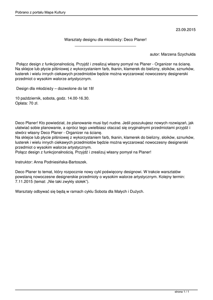 Pobrano z portalu Mapa Kultury 23.09.2015 Warsztaty designu dla młodzieży: Deco Planer! ____________________________ autor: Marzena Szychułda Połącz design z funkcjonalnością. Przyjdź i zrealizuj własny pomysł na Planer - Organizer na ścianę. Na sklejce lub płycie pilśniowej z wykorzystaniem farb, tkanin, klamerek do bielizny, słoików, sznurków, lusterek i wielu innych ciekawych przedmiotów będzie można wyczarować nowoczesny designerski przedmiot o wysokim walorze artystycznym. Design dla młodzieży – dozwolone do lat 18! 10 październik, sobota, godz. 14.00-16.30. Opłata: 70 zł. Deco Planer! Kto powiedział, że planowanie musi być nudne. Jeśli poszukujesz nowych rozwiązań, jak ułatwiać sobie planowanie, a oprócz tego uwielbiasz otaczać się oryginalnymi przedmiotami przyjdź i stwórz własny Deco Planer - Organizer na ścianę. Na sklejce lub płycie pilśniowej z wykorzystaniem farb, tkanin, klamerek do bielizny, słoików, sznurków, lusterek i wielu innych ciekawych przedmiotów będzie można wyczarować nowoczesny designerski przedmiot o wysokim walorze artystycznym. Połącz design z funkcjonalnością. Przyjdź i zrealizuj własny pomysł na Planer! Instruktor: Anna Podniesińska-Bartoszek. Deco Planer to temat, który rozpocznie nowy cykl poświęcony designowi. W trakcie warsztatów powstaną nowoczesne designerskie przedmioty o wysokim walorze artystycznym. Kolejny termin: 7.11.2015 (temat: „Nie taki zwykły stołek”). Warsztaty odbywać się będą w ramach cyklu Sobota dla Małych i Dużych. strona 1 / 1