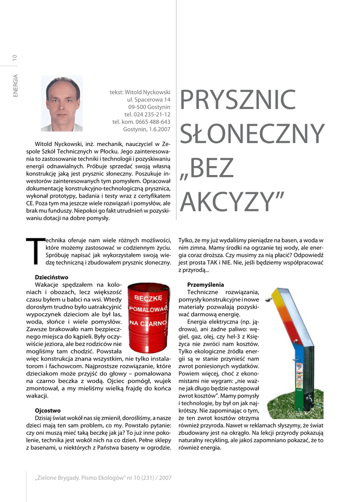 10 ENERGIA Witold Nyckowski, inż. mechanik, nauczyciel w Zespole Szkół Technicznych w Płocku. Jego zainteresowania to zastosowanie techniki i technologii i pozyskiwaniu energii odnawialnych. Próbuje sprzedać swoją własną konstrukcję jaką jest prysznic słoneczny. Poszukuje inwestorów zainteresowanych tym pomysłem. Opracował dokumentację konstrukcyjno-technologiczną prysznica, wykonał prototypy, badania i testy wraz z certyfikatem CE. Poza tym ma jeszcze wiele rozwiązań i pomysłów, ale brak mu funduszy. Niepokoi go fakt utrudnień w pozyskiwaniu dotacji na dobre pomysły. PRYSZNIC SŁONECZNY „BEZ AKCYZY” T Tylko, że my już wydaliśmy pieniądze na basen, a woda w nim zimna. Mamy środki na ogrzanie tej wody, ale energia coraz droższa. Czy musimy za nią płacić? Odpowiedź jest prosta TAK i NIE. Nie, jeśli będziemy współpracować z przyrodą... Ojcostwo Dzisiaj świat wokół nas się zmienił, dorośliśmy, a nasze dzieci mają ten sam problem, co my. Powstało pytanie: czy oni muszą mieć taką beczkę jak ja? To już inne pokolenie, technika jest wokół nich na co dzień. Pełne sklepy z basenami, u niektórych z Państwa baseny w ogrodzie. Przemyślenia Techniczne rozwiązania, pomysły konstrukcyjne i nowe materiały pozwalają pozyskiwać darmową energię. Energia elektryczna (np. jądrowa), ani żadne paliwo: węgiel, gaz, olej, czy hel-3 z Księżyca nie zwróci nam kosztów. Tylko ekologiczne źródła energii są w stanie przynieść nam zwrot poniesionych wydatków. Powiem więcej, choć z ekonomistami nie wygram: „nie ważne jak długo będzie następował zwrot kosztów”. Mamy pomysły i technologie, by był on jak najkrótszy. Nie zapominając o tym, że ten zwrot kosztów otrzyma również przyroda. Nawet w reklamach słyszymy, że świat zbudowany jest na okrągło. Na lekcji przyrody pokazują naturalny recykling, ale jakoś zapomniano pokazać, że to również energia. tekst: Witold Nyckowski ul. Spacerowa 14 09-500 Gostynin tel. 024 235-21-12 tel. kom. 0665 488-643 Gostynin, 1.6.2007 echnika oferuje nam wiele różnych możliwości, które możemy zastosować w codziennym życiu. Spróbuję napisać jak wykorzystałem swoją wiedzę techniczną i zbudowałem prysznic słoneczny. Dzieciństwo Wakacje spędzałem na koloniach i obozach, lecz większość czasu byłem u babci na wsi. Wtedy dorosłym trudno było uatrakcyjnić wypoczynek dzieciom ale był las, woda, słońce i wiele pomysłów. Zawsze brakowało nam bezpiecznego miejsca do kąpieli. Były oczywiście jeziora, ale bez rodziców nie mogliśmy tam chodzić. Powstała więc konstrukcja znana wszystkim, nie tylko instalatorom i fachowcom. Najprostsze rozwiązanie, które dzieciakom może przyjść do głowy – pomalowana na czarno beczka z wodą. Ojciec pomógł, wujek zmontował, a my mieliśmy wielką frajdę do końca wakacji. „Zielone Brygady. Pismo Ekologów” nr 10 (231) / 2007 Początek W lipcu 1999 r. zbudowałem pierwsze własnej konstrukcji kolektory słoneczne. Cztery panele, razem 5,2 m2 i zbiornik 300 litrów z miedzianym wymiennikiem. Nie liczyłem na wiele, może 25-30oC. Jakie było zdziwienie rodziny, gdy pierwszy raz odkręcili kurek z gorącą wodą nagrzaną za darmo. Miała ona temp. 55oC (zawór mieszający). Od tamtego dnia nie wyobrażam sobie, bym musiał płacić za podgrzewanie wody. Zabawa i wypoczynek W ogródku bawiące się dzieci, my przygotowujemy grilową ucztę i powstaje odwieczny problem „nie chlapcie się zimną wodą, bo się przeziębicie” – „a co mamy robić gdy jest upał i w piaskownicy potrzebna woda?”. Sami byśmy chętnie wzięli ciepłą kąpiel po pracy w ogródku lub biesiadzie. Coś z tym trzeba było zrobić. 1. 2. 3. 4. 5. 6. 7. Założenia musi być bezpieczne – dzieciaki są najważniejsze ekologiczne – za darmo ciepła woda wydajne i proste w obsłudze – mamy się kąpać, a nie kombinować estetyczne – ładnie wyglądać w ogrodzie trwałe – odporne na warunki atmosferyczne lekkie – żeby można schować na zimę dla wszystkich – dzieci i dorosłych Budowa Rysowałem i rysowałem, powstało wiele rozwiązań. To moje maluchy wybrały najlepsze. I tak powstał prysznic słoneczny. Nie obeszło się bez prototypu i testów na prysznicu. Najważniejszy test przeprowadziły dzieci. Szczegóły Prysznic słoneczny to kolumna wykonana z rury aluminiowej tworzącej zbiornik 25 l, przegięta pod kątem 300 i ocieplona na 2/3 swojej wysokości, ze względu na bezpieczeństwo i możliwość przegrzania. Pozyskiwanie energii słonecznej odbywa się dzięki panelowi kolektora, który jest też mojej kon- strukcji. Budując swoje kolektory opracowałem technologię łączenia blachy miedzianej z rurą, na 1/2 obwodu rury. Pozwoliło to bardzo efektywnie przekazać ciepło. Całość jest zamknięta w wytrzymałej obudowie wykonanej z żywicy poliestrowej. Od strony kolektora słonecznego jest poliwęglan odporny na UV. Szkło byłoby lepsze, ale bezpieczeństwo dzieci trzyma mnie w ryzach konstrukcyjno-technologicznych. Wewnątrz jest cała instalacja hydrauliczna. 1. zawór trójdrożny mieszający wodę od 30 do 60oC – zabezpieczenie przed poparzeniem – nastawiamy nim temp. wody do kąpieli. 2. zawór poboru wody do wylewki (główki) prysznica 3. zawór zwrotny i bezpieczeństwa, zabezpiecza przed wzrostem ciśnienia. 4. rurki i złączki, bez których nie da się tego spiąć w całość. Na zewnątrz jest wylewka prysznica, mydelniczka, wieszak ręcznika, termometr kontrolny, pokrętła: zaworu do wylewki prysznica, zaworu mieszającego, zaworu bezpieczeństwa – czasami musimy go udrożnić (zalecenie producenta zaworu). W dolnej części prysznica znajduje się przyłącze i kran poboru zimnej wody. Prysznic o masie 25 kg wstawiamy na podstawę i dzięki obrotowemu osadzeniu (3600) możemy ustawić go w kierunku Słońca. Przewidziane jest jeszcze miejsce na elektronikę solarną, ale brak 