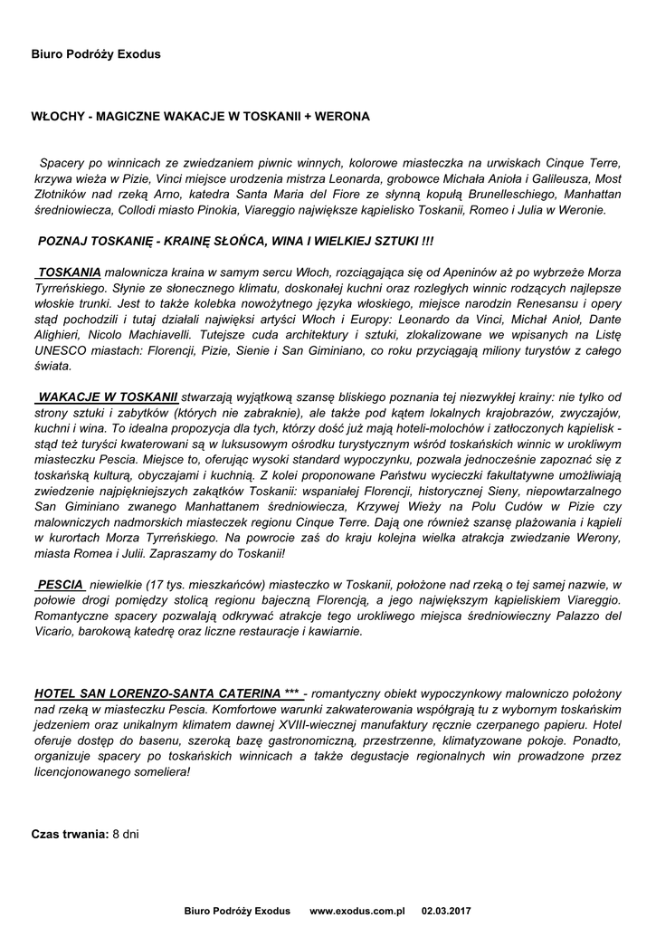 Biuro Podróży Exodus WŁOCHY - MAGICZNE WAKACJE W TOSKANII + WERONA Spacery po winnicach ze zwiedzaniem piwnic winnych, kolorowe miasteczka na urwiskach Cinque Terre, krzywa wieża w Pizie, Vinci miejsce urodzenia mistrza Leonarda, grobowce Michała Anioła i Galileusza, Most Złotników nad rzeką Arno, katedra Santa Maria del Fiore ze słynną kopułą Brunelleschiego, Manhattan średniowiecza, Collodi miasto Pinokia, Viareggio największe kąpielisko Toskanii, Romeo i Julia w Weronie. POZNAJ TOSKANIĘ - KRAINĘ SŁOŃCA, WINA I WIELKIEJ SZTUKI !!! TOSKANIA malownicza kraina w samym sercu Włoch, rozciągająca się od Apeninów aż po wybrzeże Morza Tyrreńskiego. Słynie ze słonecznego klimatu, doskonałej kuchni oraz rozległych winnic rodzących najlepsze włoskie trunki. Jest to także kolebka nowożytnego języka włoskiego, miejsce narodzin Renesansu i opery stąd pochodzili i tutaj działali najwięksi artyści Włoch i Europy: Leonardo da Vinci, Michał Anioł, Dante Alighieri, Nicolo Machiavelli. Tutejsze cuda architektury i sztuki, zlokalizowane we wpisanych na Listę UNESCO miastach: Florencji, Pizie, Sienie i San Giminiano, co roku przyciągają miliony turystów z całego świata. WAKACJE W TOSKANII stwarzają wyjątkową szansę bliskiego poznania tej niezwykłej krainy: nie tylko od strony sztuki i zabytków (których nie zabraknie), ale także pod kątem lokalnych krajobrazów, zwyczajów, kuchni i wina. To idealna propozycja dla tych, którzy dość już mają hoteli-molochów i zatłoczonych kąpielisk stąd też turyści kwaterowani są w luksusowym ośrodku turystycznym wśród toskańskich winnic w urokliwym miasteczku Pescia. Miejsce to, oferując wysoki standard wypoczynku, pozwala jednocześnie zapoznać się z toskańską kulturą, obyczajami i kuchnią. Z kolei proponowane Państwu wycieczki fakultatywne umożliwiają zwiedzenie najpiękniejszych zakątków Toskanii: wspaniałej Florencji, historycznej Sieny, niepowtarzalnego San Giminiano zwanego Manhattanem średniowiecza, Krzywej Wieży na Polu Cudów w Pizie czy malowniczych nadmorskich miasteczek regionu Cinque Terre. Dają one również szansę plażowania i kąpieli w kurortach Morza Tyrreńskiego. Na powrocie zaś do kraju kolejna wielka atrakcja zwiedzanie Werony, miasta Romea i Julii. Zapraszamy do Toskanii! PESCIA niewielkie (17 tys. mieszkańców) miasteczko w Toskanii, położone nad rzeką o tej samej nazwie, w połowie drogi pomiędzy stolicą regionu bajeczną Florencją, a jego największym kąpieliskiem Viareggio. Romantyczne spacery pozwalają odkrywać atrakcje tego urokliwego miejsca średniowieczny Palazzo del Vicario, barokową katedrę oraz liczne restauracje i kawiarnie. HOTEL SAN LORENZO-SANTA CATERINA *** - romantyczny obiekt wypoczynkowy malowniczo położony nad rzeką w miasteczku Pescia. Komfortowe warunki zakwaterowania współgrają tu z wybornym toskańskim jedzeniem oraz unikalnym klimatem dawnej XVIII-wiecznej manufaktury ręcznie czerpanego papieru. Hotel oferuje dostęp do basenu, szeroką bazę gastronomiczną, przestrzenne, klimatyzowane pokoje. Ponadto, organizuje spacery po toskańskich winnicach a także degustacje regionalnych win prowadzone przez licencjonowanego someliera! Czas trwania: 8 dni Biuro Podróży Exodus www.exodus.com.pl 02.03.2017 Terminy: 30.09.2014 - 07.10.2014 1449 PLN do 31 stycznia 2014 - promocyjna cena 1349 Program: Dzień 1. 20.00 wyjazd z Zielonej Góry. Nocny przejazd przez Niemcy. Dzień 2. Wjazd do Włoch. Około 13.00 zakwaterowanie w hotelu*** w toskańskim miasteczku Pescia. Czas wolny. Obiadokolacja. Nocleg. Dzień 3.-6. Śniadanie. Czas wolny. Możliwość udziału w wycieczkach fakultatywnych. Powrót do hotelu w Pescii. Obiadokolacja. Nocleg. Dzień 7. 07.00 śniadanie. 07.45 wyjazd. Zwiedzanie WERONY (miasto Romea i Julii, lista UNESCO) - Arena (trzeci co do wielkości antyczny amfiteatr we Włoszech), Brama Borsari, Brama Nowa, katedra, Castel Vechio, plac Signori, plac Maffel, dom Julii (Capuletich). Nocny przejazd przez Niemcy. Dzień 8. Wjazd do kraju. Około 05.00 rozwiązanie wycieczki w Zielonej Górze. WYCIECZKI FAKULTATYWNE: Biuro Podróży Exodus www.exodus.com.pl 02.03.2017 1. FLORENCJA SIENA SAN GIMINIANO 45 EUR (przy min. 25 os. chętnych): 07.00 śniadanie. 07.45 wyjazd. Przejazd przez VINCI rodzinne miasto Leonarda da Vinci. Spacer po SAN GIMINIANO (miasto stu wież, Manhattan średniowiecza, lista UNESCO) niezwykłe średniowieczne miasto o 14 (spośród 72 ogółem zbudowanych) kilkudziesięciometrowych wieżach mieszkalno-obronnych. Zwiedzanie SIENY (lsta UNESCO) romańska katedra z baptysterium i kampanilą, Piazza del Campo, Palazzo Publico, Wieża Mangia, Piazza Salimbeni, dom św. Katarzyny ze Sieny, stare miasto. Zwiedzanie FLORENCJI (stolica Toskanii, lista UNESCO) plac Signoria, most Złotników nad rzeką Arno, katedra Santa Maria del Fiore z baptysterium i Rajskimi Wrotami, kościół Santa Croce (miejsce pochówku najwybitniejszych toskańczyków, m.in. Michała Anioła i Galileusza), stare miasto (obowiązkowy przewodnik lokalny). Czas wolny. Około 21.00 powrót do hotelu w Pescii. 2. PIZA COLLODI VIAREGGIO 25 EUR (przy min. 25 os. chętnych): 08.00 śniadanie. 08.45 wyjazd. Spacer po COLLODI (miasto Pinokia) pomnik i park Pinokia, Pałac Garzoni z ogrodami. Zwiedzanie PIZY (lista UNESCO) Pole Cudów z katedrą, baptysterium i słynną Krzywą Wieżą. Przystanek w VIAREGGIO (słynny toskański kurort nad Morzem Tyreńskim) czas wolny, możliwość plażowania. Około 20.00 - powrót do hotelu w Pescii. 3. CINQUE TERRE 20 EUR (przy min. 25 os. chętnych): 08.00 śniadanie. 08.45 wyjazd. Przejazd autokarem do miejscowości LA SPECIA w rejonie CINQUE TERRE (lista UNESCO) bajkowa część Riwiery Liguryjskiej obejmująca 5 miasteczek (Monterosso, Vernazza, Riomaggiore, Corniglia, Manarola) malowniczo położonych na morskim klifie, w otoczeniu wzgórz porośniętych winnicami. Niewielka odległość m