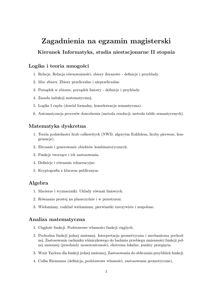 Zagadnienia na egzamin magisterski Kierunek Informatyka, studia niestacjonarne II stopnia Logika i teoria mnogości 1. Relacje. Relacja równoważności, zbiory ilorazowe - definicje i przykłady. 2. Moc zbioru. Zbiory przeliczalne i nieprzeliczalne. 3. Porządek w zbiorze, porządek liniowy - definicje i przykłady. 4. Zasada indukcji matematycznej. 5. Logika I rzędu (dowód formalny, konsekwencja semantyczna). 6. Automatyzacja procesów dowodzenia (metoda rezolucji, metoda tablic semantycznych). Matematyka dyskretna 1. Teoria podzielności liczb całkowitych (NWD, algorytm Euklidesa, liczby pierwsze, kongruencje). 2. Zliczanie i generowanie obiektów kombinatorycznych. 3. Funkcje tworzące i ich zastosowania. 4. Definicje i równania rekurencyjne. 5. Kryptografia z kluczem publicznym. Algebra 1. Macierze i wyznaczniki. Układy równań liniowych. 2. Równania prostej na płaszczyźnie i w przestrzeni. 3. Wielomiany, rozkład wielomianu, pierwiastki rzeczywiste i zespolone. Analiza matematyczna 1. Ciągłość funkcji. Podstawowe własności funkcji ciągłych. 2. Pochodna funkcji jednej zmiennej. Interpretacja geometryczna i mechaniczna pochodnej. Zastosowanie rachunku różniczkowego do badania przebiegu zmienności funkcji jednej zmiennej (przedziały monotoniczności, ekstrema lokalne, punkty przegięcia. 3. Wzór Taylora dla funkcji jednej zmiennej. Zastosowania do obliczania przybliżeń funkcji. 4. Całka Riemanna (definicja, podstawowe własności, zastosowania geometryczne). 1 Statystyczna analiza danych 1. Rozkład częstości cechy, dystrybuanta empiryczna, histogram. Rozkład zmiennej, dystrybuanta, gęstość rozkładu. Rozkład normalny. 2. Miary tendencji centralnej i rozproszenia (średnia z próby, moda, mediana, rozstęp, wariancja z próby). Wartość oczekiwana i wariancja zmiennej losowej. 3. Estymacja punktowa wartości oczekiwanej i wariancji. 4. Pojęcie testu statystycznego (hipoteza zerowa i hipoteza alternatywna, obszar krytyczny, błędy pierwszego i drugiego rozdzaju). Przykłady testów. Podstawy teorii obliczeń, lingwistyka matematyczna 1. Formalizacja pojęcia obliczenia: maszyny RAM i Turinga. Hipoteza Churcha-Turinga. 2. Struktura zbioru funkcji obliczalnych, stosowanie rekursji i minimalizacji. 3. Zbiory rekurencyjne, problemy rozstrzygalne. Problem stopu, poprawności, wejścia. 4. Złożoność obliczeniowa algorytmów. Klasy P, NP, problemy NP-zupelne. 5. Automaty skończone, wyrażenia regularne, twierdzenie Kleene’go i jego zastosowania. Algorytmy i struktury danych 1. Poprawność i złożoność algorytmu. 2. Algorytmy sortowania. 3. Elementy teorii grafów. Algorytmy grafowe. 4. Podstawowe algorytmy tekstowe. 5. Struktury danych i ich wpływ na złożoność algorytmów. Programowanie obiektowe 1. Pojęcia klasy i obiektu. Przykład klasy i kilku obiektów tej klasy. 2. Dziedziczenie. Przykład hierarchii klas. 3. Metody wirtualne. Przykład ilustrujący ich użyteczność. 4. Konstruktory i destruktory. Programowanie równoległe 2 1. Modele programowania równoległego. 2. Projektowanie algorytmów równoległych i ich złożoność czasowa. 3. Klasyczne problemy współbieżności. 4. Biblioteki programistyczne wspomagające tworzenie aplikacji równoległych. Bazy danych 1. Podstawowe własności baz danych. 2. Relacyjne bazy danych (model danych, klucze, SQL). 3. Bezpieczeństwo baz danych. 4. Współbieżne przetwarzanie transakcji. Inżynieria oprogramowania 1. Cykl życia programu. 2. Modelowanie pojęciowe (język UML). 3. Modelowanie baz danych. 4. Metody testowania oprogramowania. Systemy operacyjne, architektura komputerów 1. Struktura komputera: procesor, we/wy, magistrala, pamięć. Działanie komputera. 2. Architektura systemu operacyjnego, jądro systemu. 3. Rodzaje planistów i decyzje o przydziale procesora. Algorytmy przydziału procesora. 4. Zarządzanie pamięcią i jej adresacja. Algorytmy przydziału pamięci. 5. Pamięć wirtualna. Algorytmy zastępowania stron. 6. Systemy plików i ich organizacja. Sieci komputerowe i programowanie sieciowe 1. Warstwy protokołu modelu OSI. 2. Protokoły komunikacyjne i ich implementacje. 3. Komunikacja między procesami na jednej maszynie. 4. Komunikacja między procesami na różnych maszynach (gniazda). 5. Zdalne wywołanie procedur, zastosowania. 3
