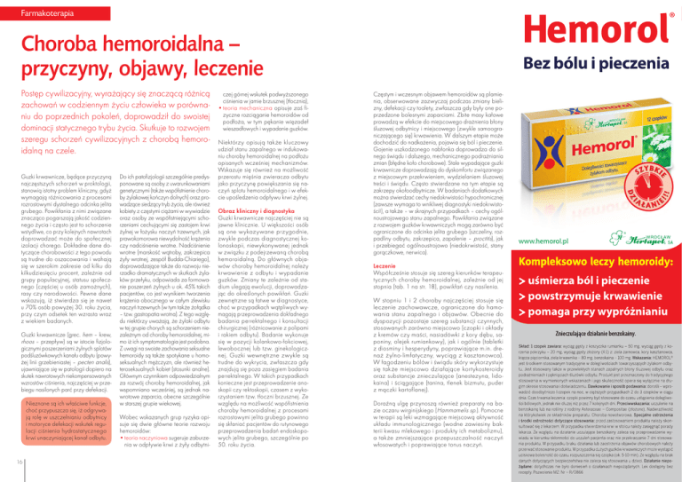Farmakoterapia Farmakoterapia Choroba hemoroidalna – przyczyny, objawy, leczenie Postęp cywilizacyjny, wyrażający się znaczącą różnicą zachowań w codziennym życiu człowieka w porównaniu do poprzednich pokoleń, doprowadził do swoistej dominacji statycznego trybu życia. Skutkuje to rozwojem szeregu schorzeń cywilizacyjnych z chorobą hemoroidalną na czele. Guzki krwawnicze, będące przyczyną najczęstszych schorzeń w proktologii, stanowią istotny problem kliniczny, gdyż wymagają różnicowania z procesami rozrostowymi dystalnego odcinka jelita grubego. Powikłania z nimi związane znacząco pogarszają jakość codziennego życia i często jest to schorzenie wstydliwe, co przy kolejnych nawrotach doprowadzać może do społecznej izolacji chorego. Dokładne dane dotyczące chorobowości z tego powodu są trudne do oszacowania i wahają się w szerokim zakresie od kilku do kilkudziesięciu procent, zależnie od grupy populacyjnej, statusu społecznego (częściej u osób zamożnych), rasy czy narodowości. Pewne dane wskazują, iż stwierdza się je nawet u 70% osób powyżej 30. roku życia, przy czym odsetek ten wzrasta wraz z wiekiem badanych. Guzki krwawnicze (grec. hem – krew, rhoos – przepływ) są w istocie fizjologicznymi poszerzeniami żylnych splotów podśluzówkowych kanału odbytu (powyżej linii grzebieniastej – pecten analis), ujawniające się w patologii dopiero na skutek nawrotowych niekompensowanych wzrostów ciśnienia, najczęściej w przebiegu nasilonych parć przy defekacji. Nieznane są ich właściwe funkcje, choć przypuszcza się, iż odgrywają rolę w uszczelnianiu odbytnicy i motoryce defekacji wskutek regulacji ciśnienia hydrostatycznego krwi unaczyniającej kanał odbytu. 16 Do ich patofizjologii szczególnie predysponowane są osoby z uwarunkowaniami genetycznymi (także współistnienie choroby żylakowej kończyn dolnych) oraz prowadzące siedzący tryb życia, ale również kobiety z częstymi ciążami w wywiadzie oraz osoby ze współistniejącymi schorzeniami cechującymi się zastojem krwi żylnej w łożysku naczyń trzewnych, jak prawokomorowa niewydolność krążenia czy nadciśnienie wrotne. Nadciśnienie wrotne (marskość wątroby, zakrzepica żyły wrotnej, zespół Budda-Chiariego), doprowadzające także do rozwoju nierzadko dramatycznych w skutkach żylaków przełyku, odpowiada za formowanie poszerzeń żylnych u ok. 45% takich pacjentów, co jest wynikiem tworzenia krążenia obocznego w całym zlewisku naczyń trzewnych (w tym także żołądka – tzw. gastropatia wrotna). Z tego względu niektórzy uważają, że żylaki odbytu w tej grupie chorych są schorzeniem niezależnym od choroby hemoroidalnej, mimo iż ich symptomatologia jest podobna. Z uwagi na swoiste zachowania seksualne hemoroidy są także spotykane u homoseksualnych mężczyzn, ale również heteroseksualnych kobiet (stosunki analne). Głównym czynnikiem odpowiedzialnym za rozwój choroby hemoroidalnej, jak wspomniano wcześniej, są jednak nawrotowe zaparcia, obecne szczególnie w starszej grupie wiekowej. Wobec wskazanych grup ryzyka opisuje się dwie główne teorie rozwoju hemoroidów: •teoria naczyniowa sugeruje zaburzenia w odpływie krwi z żyły odbytni- czej górnej wskutek podwyższonego ciśnienia w jamie brzusznej (tłocznia), •teoria mechaniczna opisuje zaś fizyczne rozciąganie hemoroidów od podłoża, w tym pękanie więzadeł wieszadłowych i wypadanie guzków. Niektórzy opisują także kluczowy udział stanu zapalnego w indukowaniu choroby hemoroidalnej na podłożu opisanych wcześniej mechanizmów. Wskazuje się również na możliwość przerostu mięśnia zwieracza odbytu jako przyczynę powiększania się naczyń splotu hemoroidalnego i w efekcie upośledzenia odpływu krwi żylnej. Obraz kliniczny i diagnostyka Guzki krwawnicze najczęściej nie są jawne klinicznie. U większości osób są one wykazywane przygodnie, zwykle podczas diagnostycznej kolonoskopii, niewykonywanej jednak w związku z podejrzewaną chorobą hemoroidalną. Do głównych objawów choroby hemoroidalnej należy krwawienie z odbytu i wypadanie guzków. Zmiany te zależnie od stadium ulegają ewolucji, doprowadzając do określonych powikłań. Guzki zewnętrzne są łatwe w diagnostyce, choć w przypadkach wątpliwych wymagają przeprowadzenia dokładnego badania perrektalnego i konsultacji chirurgicznej (różnicowanie z polipami i rakiem odbytu). Badanie wykonuje się w pozycji kolankowo-łokciowej, lewobocznej lub tzw. ginekologicznej. Guzki wewnętrzne zwykle są trudne do wykrycia, zwłaszcza gdy znajdują się poza zasięgiem badania perrektalnego. W takich przypadkach konieczne jest przeprowadzenie anoskopii czy rektoskopii, czasem z wykorzystaniem tzw. tłoczni brzusznej. Ze względu na możliwość współistnienia choroby hemoroidalnej z procesami rozrostowymi jelita grubego powinno się skłaniać pacjentów do rutynowego przeprowadzenia badań endoskopowych jelita grubego, szczególnie po 50. roku życia. Częstym i wczesnym objawem hemoroidów są plamienia, obserwowane zazwyczaj podczas zmiany bielizny, defekacji czy toalety, zwłaszcza gdy były one poprzedzone bolesnymi zaparciami. Zbite masy kałowe prowadzą w efekcie do miejscowego drażnienia błony śluzowej odbytnicy i miejscowego (zwykle samoograniczającego się) krwawienia. W dalszym etapie może dochodzić do nadkażenia, pojawia się ból i pieczenie. Gojenie uszkodzonego nabłonka doprowadza do silnego świądu i dalszego, mechanicznego podrażniania zmian (błędne koło chorobowe). Stale wypadające guzki krwawnicze doprowadzają do dyskomfortu związanego z miejscowym przekrwieniem, wydzielaniem śluzowej treści i świądu. Często stwierdzane na tym etapie są zakrzepy okołoodbytnicze. W badaniach dodatkowych można stwierdzać cechy niedokrwistości hypochromicznej (zawsze wymaga to wnikliwej diagnostyki niedokrwistości!), a także – w skrajnych p