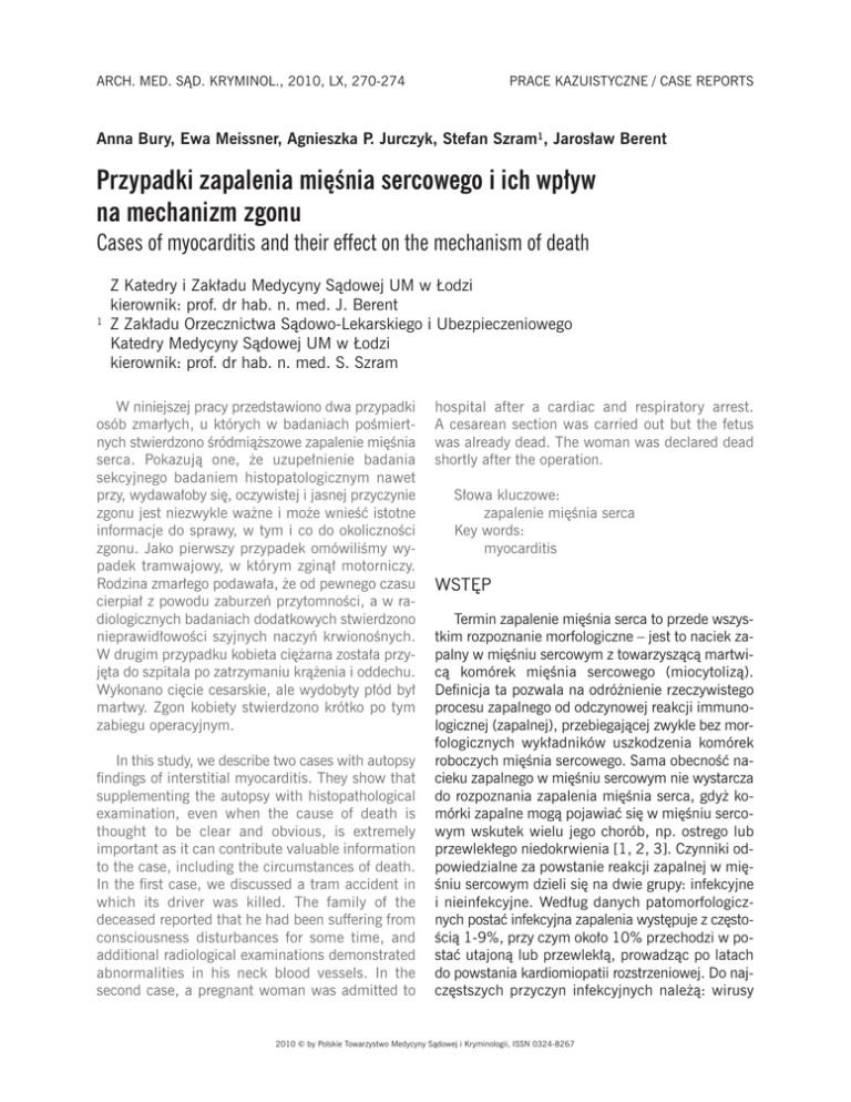 ARCH. MED. SĄD. KRYMINOL., 2010, LX, 270-274 PRACE KAZUISTYCZNE / CASE REPORTS Anna Bury, Ewa Meissner, Agnieszka P. Jurczyk, Stefan Szram1, Jarosław Berent Przypadki zapalenia mięśnia sercowego i ich wpływ na mechanizm zgonu Cases of myocarditis and their effect on the mechanism of death 1 Z Katedry i Zakładu Medycyny Sądowej UM w Łodzi kierownik: prof. dr hab. n. med. J. Berent Z Zakładu Orzecznictwa Sądowo-Lekarskiego i Ubezpieczeniowego Katedry Medycyny Sądowej UM w Łodzi kierownik: prof. dr hab. n. med. S. Szram W niniejszej pracy przedstawiono dwa przypadki osób zmarłych, u których w badaniach pośmiertnych stwierdzono śródmiąższowe zapalenie mięśnia serca. Pokazują one, że uzupełnienie badania sekcyjnego badaniem histopatologicznym nawet przy, wydawałoby się, oczywistej i jasnej przyczynie zgonu jest niezwykle ważne i może wnieść istotne informacje do sprawy, w tym i co do okoliczności zgonu. Jako pierwszy przypadek omówiliśmy wypadek tramwajowy, w którym zginął motorniczy. Rodzina zmarłego podawała, że od pewnego czasu cierpiał z powodu zaburzeń przytomności, a w radiologicznych badaniach dodatkowych stwierdzono nieprawidłowości szyjnych naczyń krwionośnych. W drugim przypadku kobieta ciężarna została przyjęta do szpitala po zatrzymaniu krążenia i oddechu. Wykonano cięcie cesarskie, ale wydobyty płód był martwy. Zgon kobiety stwierdzono krótko po tym zabiegu operacyjnym. In this study, we describe two cases with autopsy findings of interstitial myocarditis. They show that supplementing the autopsy with histopathological examination, even when the cause of death is thought to be clear and obvious, is extremely important as it can contribute valuable information to the case, including the circumstances of death. In the first case, we discussed a tram accident in which its driver was killed. The family of the deceased reported that he had been suffering from consciousness disturbances for some time, and additional radiological examinations demonstrated abnormalities in his neck blood vessels. In the second case, a pregnant woman was admitted to hospital after a cardiac and respiratory arrest. A cesarean section was carried out but the fetus was already dead. The woman was declared dead shortly after the operation. Słowa kluczowe: zapalenie mięśnia serca Key words: myocarditis WSTĘP Termin zapalenie mięśnia serca to przede wszystkim rozpoznanie morfologiczne – jest to naciek zapalny w mięśniu sercowym z towarzyszącą martwicą komórek mięśnia sercowego (miocytolizą). Definicja ta pozwala na odróżnienie rzeczywistego procesu zapalnego od odczynowej reakcji immunologicznej (zapalnej), przebiegającej zwykle bez morfologicznych wykładników uszkodzenia komórek roboczych mięśnia sercowego. Sama obecność nacieku zapalnego w mięśniu sercowym nie wystarcza do rozpoznania zapalenia mięśnia serca, gdyż komórki zapalne mogą pojawiać się w mięśniu sercowym wskutek wielu jego chorób, np. ostrego lub przewlekłego niedokrwienia [1, 2, 3]. Czynniki odpowiedzialne za powstanie reakcji zapalnej w mięśniu sercowym dzieli się na dwie grupy: infekcyjne i nieinfekcyjne. Według danych patomorfologicznych postać infekcyjna zapalenia występuje z częstością 1-9%, przy czym około 10% przechodzi w postać utajoną lub przewlekłą, prowadząc po latach do powstania kardiomiopatii rozstrzeniowej. Do najczęstszych przyczyn infekcyjnych należą: wirusy 2010 © by Polskie Towarzystwo Medycyny Sądowej i Kryminologii, ISSN 0324-8267 Nr 4 PRZYPADKI ZAPALENIA MIĘŚNIA SERCOWEGO I ICH WPŁYW NA MECHANIZM ZGONU (Coxackie A i B, grypy typu A i B, CMV, HIV-1, HAV i HCV, ECHO, EBV, adenowirusy) [4, 5], bakterie (paciorkowce beta-hemolizujące, maczugowce błonicy, meningokoki, Borrelia burgdorferi, Mycoplasma pneumoniae, Chlamydia trachomatis, Listeria monocytogenes, Mycobacterium tuberculosis, krętki) [6], grzyby (Candida, Actinomyces) oraz pierwotniaki (Trypanosoma cruzi, Toxoplasma gondii), pasożyty (glista ludzka, włośnie, bąblowiec) [7]. Wśród przyczyn nieinfekcyjnych wymienić należy: choroby z autoagresji (wole Hashimoto, RZS, miastenia, choroba Takayasu, autoimmunologiczne zapalenie wątroby, choroby zapalne jelit, sarkoidoza, zespół Churg-Straussa, choroba Kawasaki, kolagenozy-SLE, twardzina, zapalenie wielomięśniowe), polekowe (antracykliny, amitryptylina, aminy katecholowe, anatoksyna tężcowa, penicylina, tetracykliny, chloramfenikol, streptomycyna), diuretyki, niektóre leki przeciwdrgawkowe, niektóre NLPZ, sulfonamidy, sole litu, pochodne sulfonylomocznika), a także tlenek węgla, etanol, kokaina, Cu, Pb, Fe, porażenie prądem, jad węży, pająków i skorpionów, promieniowanie oraz mocznica. Obserwowano także pojedyncze przypadki poszczepiennego zapalenia mięśnia sercowego [8]. Przebieg kliniczny schorzenia jest w większości przypadków skąpoobjawowy, z tego powodu jego rzeczywista częstość jest trudna do określenia. Ze względu na objawy kliniczne zapalenia mięśnia serca możemy wyróżnić postać bezobjawową lub skąpoobjawową (ograniczenie wydolności fizycznej, tachykardia), postać arytmiczną, stenokardialną (objawy ostrego zespołu wieńcowego) [9], rozstrzeniową (duszność wysiłkowa, tachykardia, zastój obwodowy), zastoinową (objawy niewydolności serca). W zależności od charakterystyki komórkowego nacieku zapalnego wyróżnia się zapalenie limfocytarne, eozynofilowe, olbrzymiokomórkowe, ziarniniakowe. Występuje również klasyfikacja zapalenia na podstawie histochemicznej oceny wycinków mięśnia sercowego podczas dwóch biopsji serca (Dallas) oraz immunohistologiczna (Zabrze). OPIS PRZYPADKÓW Przypadek 1. W godzinach porannych, przy dobrych warunkach atmosferycznych, doszło do wypadku komunikacyjnego. Motorniczy tramwaju mającego jechać 271 prosto nie dokonał zmiany zwrotnicy torów z kierunku skrętu w prawo na kierunek jazdy prosto, wskutek c