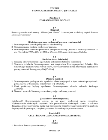 STATUT STOWARZYSZENIA MIASTO JEST NASZE Rozdział I POSTANOWIENIA OGÓLNE §1 [Nazwa] Stowarzyszenie nosi nazwę „Miasto Jest Nasze” i zwane jest w dalszej części Statutu „Stowarzyszeniem”. §2 [Podstawa prawna, osobowość prawna, czas trwania] 1. Stowarzyszenie powołuje się na czas nieokreślony 2. Stowarzyszenie posiada osobowość prawną. 3. Stowarzyszenie działa na podstawie przepisów ustawy „Prawo o stowarzyszeniach” z dn. 7 kwietnia 1989 r. (Dz. U. 2001 nr 79, poz. 855), oraz niniejszego Statutu. §3 [Siedziba, teren działania] 1. Siedzibą Stowarzyszenia i jego władz jest miasto stołeczne Warszawa. 2. Terenem działania Stowarzyszenia jest terytorium Rzeczypospolitej Polskiej. Dla właściwego realizowania swych celów, Stowarzyszenie może prowadzić działalność poza granicami Rzeczypospolitej Polskiej. §4 [Nazwa, symbol] 1. Stowarzyszenie posługuje się, zgodnie z obowiązującymi w tym zakresie przepisami, pełną nazwą w brzmieniu określonym w § 1 Statutu. 2. Znak graficzny, będący symbolem Stowarzyszenia określa uchwała Walnego Zebrania. 3. Nazwa i symbole Stowarzyszenia korzystają z ochrony prawnej. §5 [Działalność Stowarzyszenia] Działalność Stowarzyszenia opiera się na pracy społecznej ogółu członków. Wykonywanie niektórych czynności lub prowadzenie niektórych spraw, z zakresu działalności Stowarzyszenia, może być powierzone przez Stowarzyszenie innym osobom fizycznym lub prawnym, z wykorzystaniem dozwolonych prawem umów. Rozdział II CELE I ŚRODKI DZIAŁANIA STOWARZYSZENIA §6 [Cele] 1. Do celów Stowarzyszenia należy: Strona 1 z 17 1) promowanie idei „prawa mieszkańców do miasta”, społeczeństwa obywatelskiego i rozwoju demokracji miejskiej, kształtowanie kompetencji obywatelskich, wspieranie rozwoju wspólnot i społeczności lokalnych i sąsiedzkich, powiązań i współpracy między różnymi grupami mieszkańców oraz różnymi środowiskami; 2) poprawa standardów funkcjonowania samorządu terytorialnego oraz administracji rządowej w zakresie wpływającym na funkcjonowanie miasta przez promowanie idei jawności i przejrzystości procedur i działań władz miasta, poszanowania prawa oraz doskonalenia i upraszczania przepisów prawnych, przeciwdziałanie korupcji oraz usprawnianie i dbanie o należytą komunikację między mieszkańcami a władzami miasta; 3) promowanie idei odpowiedzialnego społecznie biznesu oraz wspieranie lokalnej przedsiębiorczości; 4) budowanie poparcia społecznego dla działań ukierunkowanych na istotne potrzeby ogółu mieszkańców Warszawy i jej poszczególnych dzielnic; 5) zrównoważony rozwój i modernizacja miasta w dziedzinie ładu przestrzennego, architektury, urbanistyki środowiska przyrodniczego, infrastruktury, gospodarki, transportu, zasobów naturalnych, stosunków własnościowych, kultury, edukacji sportu oraz warunków życia mieszkańców, poprzez aktywne uczestnictwo w wypracowaniu strategii rozwoju miasta oraz procesach inwestycyjnych, mogących wpływać na jakość środowiska życia mieszkańców; 6) kształtowanie polityki gospodarki nieruchomościami i stosunków własnościowych, w szczególności w kwestii reprywatyzacji nieruchomości (tzw. dekret Bieruta, mienie poniemieckie i porzucone), komunalizacji i uwłaszczania, polityki scalania i podziału gruntów oraz gospodarowania nieruchomościami i innym mieniem komunalnym, jak również spółek, których m. st. Warszawa jest całościowym lub częściowym wspólnikiem lub akcjonariuszem; 7) ochrona i zachowanie elementów istotnych dla tożsamości historycznej i kulturowej Warszawy i jej poszczególnych dzielnic: architektonicznych, urbanistycznych, przyrodniczych i infrastrukturalnych w szczególności zabytków i dóbr kultury, krajobrazu i fragmentów rodzimej przyrody, w tym terenów zieleni dostępnych wszystkim mieszkańcom oraz miejsc i obiektów o szczególnym znaczeniu dla mieszkańców; 8) ochrona i promowanie godnych warunków i wysokiej jakości życia mieszkańców Warszawy, w szczególności obejmujących politykę mieszkaniową, służbę zdrowia, sport i edukację; 9) propagowanie racjonalnej polityki finansowej miasta; 10) identyfikacja problemów lokalnych społeczności i różnych środowisk oraz udzielanie im wsparcia w ich rozwiązywaniu poprzez tworzenie koncepcji ich rozwiązywania, promowanie praktyk konsultacji społecznych i współpracę z władzami miasta odnośnie działań inwestycyjnych istotnych dla społeczności lokalnych i środowisk społecznych; 11) budowanie i rozpowszechnianie wiedzy i informacji istotnych dla diagnostyki i stymulowania aktywności społecznej i przekształcanie ich w wiedzę przydatną do diagnozowania potrzeb i rozwiązywania problemów społecznych oraz projektowania i realizacji przedsięwzięć sprzyjających rozwojowi lokalnych społeczności i środowisk, jakości życia mieszkańców oraz Miasta Stołecznego Warszawy. 2. Cele opisane w § 6 ust. 1 Statutu realizowane są na rzecz całego społeczeństwa polskiego. Strona 2 z 17 §7 [Sposoby realizacji celów, działalność pożytku publicznego] 1. Stowarzyszenie nie prowadzi działalności gospodarczej. 2. Stowarzyszenie realizuje swoje cele w drodze nieodpłatnej działalności pożytku publicznego poprzez: 1) prowadzenie działań informacyjnych, propagandowych i edukacyjnych, w szczególności: prowadzenie strony internetowej; organizacja debat, dyskusji i odczytów; prowadzenie działań i kampanii informacyjnych i promujących wśród mieszkańców postawy zgodne z celami Stowarzyszenia; prowadzenie działalności wydawniczej; 2) gromadzenie informacji oraz przeprowadzanie i przedstawianie niezależnych opracowań, studiów, badań, analiz, ekspertyz, ocen, raportów i opinii wraz ze składaniem wniosków i postulatów w sprawach z zakresu działalności statutowej 3) merytoryczne lub finansowe wspieranie działań prowadzonych przez inne organizacje i instytucje, dotycz
