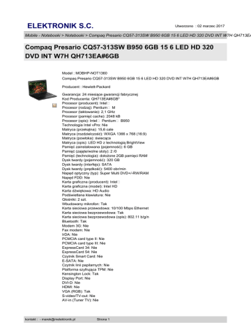 ELEKTRONIK S.C. Utworzono : 02 marzec 2017 Mobile - Notebooki > Notebooki > Compaq Presario CQ57-313SW B950 6GB 15 6 LED HD 320 DVD INT W7H QH713EA Compaq Presario CQ57-313SW B950 6GB 15 6 LED HD 320 DVD INT W7H QH713EA#6GB Model : MOBHP-NOT1360 Compaq Presario CQ57-313SW B950 6GB 15 6 LED HD 320 DVD INT W7H QH713EA#6GB Producent : Hewlett-Packard Gwarancja: 24 miesiące gwarancji fabrycznej Kod Producenta: QH713EA#6GB* Procesor (producent): Intel� Procesor (rodzaj): Pentium� M Procesor (taktowanie): 2,1 GHz Procesor (pamięć cache): 2048 kB Procesor (opis): Intel� Pentium� B950 Technologia Intel vPro: Nie Matryca (przekątna): 15,6 cale Matryca (rozdzielczość): WXGA 1366 x 768 (16:9) Matryca (powłoka): świecąca Matryca (opis): LED HD z technologią BrightView Pamięć zainstalowana (pojemność): 6 GB Pamięć (zajęte/wolne sloty): 2 /0 Pamięć (technologia): dołożone 2GB pamięci RAM Dysk twardy (pojemność): 320 GB Dysk twardy (interfejs): SATA Dysk twardy (prędkość): 5400 obr/min Napęd optyczny (typ): Super Multi DVD+/-RW/RAM Napęd FDD: Nie Karta graficzna (producent): Intel� Karta graficzna (model): Intel HD Karta dźwiękowa: HD Audio Podświetlana klawiatura: Nie Głośniki: 2 szt. Wbudowany mikrofon: Tak Karta sieciowa przewodowa: 10/100 Mbps Ethernet Karta sieciowa bezprzewodowa: Tak Karta sieciowa bezprzewodowa (opis): 802.11 b/g/n Bluetooth: Tak Modem 3G: Nie Fax modem: Nie IrDA: Nie PCMCIA card type II: Nie PCMCIA card type III: Nie ExpressCard 34: Nie ExpressCard 54: Nie Czytnik Smart Card: Nie E-SATA: Nie Czytnik linii papilarnych: Nie Platforma szyfrująca TPM: Nie Kensington Lock: Tak Display Port: Nie DVI-D: Nie HDMI: Nie VGA (RGB): Tak S-video/TV-out: Nie AV-in (Tuner TV): Nie kontakt : - [email protected] Strona 1 ELEKTRONIK S.C. Utworzono : 02 marzec 2017 Mobile - Notebooki > Notebooki > Compaq Presario CQ57-313SW B950 6GB 15 6 LED HD 320 DVD INT W7H QH713EA Compaq Presario CQ57-313SW B950 6GB 15 6 LED HD 320 DVD INT W7H QH713EA#6GB Line-in: Nie Line-out: Tak Wejście mikrofonu: Tak S/PDIF: Nie LPT (równoległy): Nie RS232 (szeregowy): Nie Moduł GPS: Nie Czytnik kart pamięci: Tak Czytnik kart pamięci (opis): Wieloformatowy czytnik kart pamięci 2 w 1 obsługujący karty Secure Digital i MultiMedia Panel klawiszy multimedialnych: Nie Złącze replikatora portów: Nie Fire-Wire (IEEE1394): Nie USB 2.0: 3 szt. System operacyjny: Windows 7 Home Premium 64 bit System operacyjny (wer. Językowa): polski Dodatkowe oprogramowanie: Symantec Norton Internet Security (automatyczne aktualizacje przez 60 dni), Pakiet Microsoft� Office Starter: Tylko programy Word i Excel� z ograniczoną funkcjonalnością i z reklamami. Bez programów PowerPoint� i Outlook� Wbudowana kamera: Tak Wbudowana kamera (opis): Kamera internetowa z wbudowanym mikrofonem cyfrowym (VGA) Wbudowana kamera obrotowa: Nie Urządzenie wskazujące: Tabliczka TouchPad z obsługą sterowania dotykowego i z wyłącznikiem Wymiary (wysokość): 36 mm Wymiary (szerokość): 376 mm Wymiary (głębokość): 247 mm Waga: 2,55 kg Gwarancja: 24 mies Gwarancja międzynarodowa: Tak Gwarancja baterii: 12 mies Wyposażenie: Zasilacz 65 W Opis: certyfikaty: Certyfikat ENERGY STAR�; EPEAT Silver�Informacja dla Kanału sprzedaży: Towar kupiony z rynku, ceny uwzględniają maksymalne rabaty. Brak finansowego wsparcia z HP Adres www producenta: Link na stronę opisu technicznego Cena : 1.729,35 zł Brutto ( 1.417,50 zł Netto) Dostępność: Produkt dostępny w naszym sklepie od 23 czerwiec 2012 kontakt : - [email protected] Strona 2