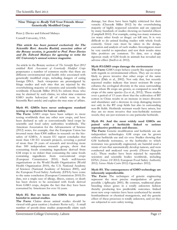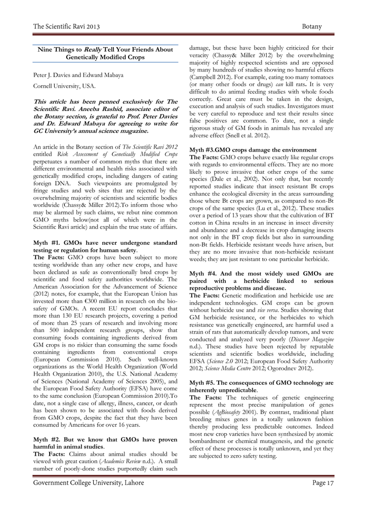 Nine Things to Really Tell Your Friends About Genetically Modified Crops Peter J. Davies and Edward Mabaya Cornell University, USA. This article has been penned exclusively for The Scientific Ravi. Aneeba Rashid, associate editor of the Botany section, is grateful to Prof. Peter Davies and Dr. Edward Mabaya for agreeing to write for GC University’s annual science magazine. An article in the Botany section of The Scientific Ravi 2012 entitled Risk Assessment of Genetically Modified Crops perpetuates a number of common myths that there are different environmental and health risks associated with genetically modified crops, including dangers of eating foreign DNA. Such viewpoints are promulgated by fringe studies and web sites that are rejected by the overwhelming majority of scientists and scientific bodies worldwide (Chassy& Miller 2012).To inform those who may be alarmed by such claims, we rebut nine common GMO myths below(not all of which were in the Scientific Ravi article) and explain the true state of affairs. Myth #1. GMOs have never undergone standard testing or regulation for human safety. The Facts: GMO crops have been subject to more testing worldwide than any other new crops, and have been declared as safe as conventionally bred crops by scientific and food safety authorities worldwide. The American Association for the Advancement of Science (2012) notes, for example, that the European Union has invested more than €300 million in research on the biosafety of GMOs. A recent EU report concludes that more than 130 EU research projects, covering a period of more than 25 years of research and involving more than 500 independent research groups, show that consuming foods containing ingredients derived from GM crops is no riskier than consuming the same foods containing ingredients from conventional crops (European Commission 2010). Such well-known organizations as the World Health Organization (World Health Organization 2010), the U.S. National Academy of Sciences (National Academy of Sciences 2005), and the European Food Safety Authority (EFSA) have come to the same conclusion (European Commission 2010).To date, not a single case of allergy, illness, cancer, or death has been shown to be associated with foods derived from GMO crops, despite the fact that they have been consumed by Americans for over 16 years. Myth #2. But we know that GMOs have proven harmful in animal studies. The Facts: Claims about animal studies should be viewed with great caution (Academics Review n.d.). A small number of poorly-done studies purportedly claim such damage, but these have been highly criticized for their veracity (Chassy& Miller 2012) by the overwhelming majority of highly respected scientists and are opposed by many hundreds of studies showing no harmful effects (Campbell 2012). For example, eating too many tomatoes (or many other foods or drugs) can kill rats. It is very difficult to do animal feeding studies with whole foods correctly. Great care must be taken in the design, execution and analysis of such studies. Investigators must be very careful to reproduce and test their results since false positives are common. To date, not a single rigorous study of GM foods in animals has revealed any adverse effect (Snell et al. 2012). Myth #3.GMO crops damage the environment The Facts: GMO crops behave exactly like regular crops with regards to environmental effects. They are no more likely to prove invasive that other crops of the same species (Dale et al., 2002). Not only that, but recently reported studies indicate that insect resistant Bt crops enhance the ecological diversity in the areas surrounding those where Bt crops are grown, as compared to non-Bt crops of the same species (Lu et al., 2012). These studies over a period of 13 years show that the cultivation of BT cotton in China results in an increase in insect diversity and abundance and a decrease in crop damaging insects not only in the BT crop fields but also in surrounding non-Bt fields. Herbicide resistant weeds have arisen, but they are no more invasive that non-herbicide resistant weeds; they are just resistant to one particular herbicide. Myth #4. And the most widely used GMOs are paired with a herbicide linked to serious reproductive problems and disease. The Facts: Genetic modification and herbicide use are independent technologies. GM crops can be grown without herbicide use and vice versa. Studies showing that GM herbicide resistance, or the herbicides to which resistance was genetically engineered, are harmful used a strain of rats that automatically develop tumors, and were conducted and analyzed very poorly (Discover Magazine n.d.). These studies have been rejected by reputable scientists and scientific bodies worldwide, including EFSA (Science 2.0 2012; European Food Safety Authority 2012; Science Media Centre 2012; Ogorodnev 2012). Myth #5. The consequences of GMO technology are inherently unpredictable. The Facts: The techniques of genetic engineering represent the most precise manipulation of genes possible (AgBiosafety 2001). By contrast, traditional plant breeding mixes genes in a totally unknown fashion thereby producing less predictable outcomes. Indeed most new crop varieties have been synthesized by atomic bombardment or chemical mutagenesis, and the genetic effect of these processes is totally unknown, and yet they are subjected to zero safety testing. Myth #6. GMO makers intimidate and silence farmers and scientists. The Facts: Only farmers profiting from illegally growing crops from patented seed have been prosecuted. Many new GMO crops are being released at cost to farmers in developing countries. The overwhelming number of scientists approves of GM crops and only the false claims of marginal “scientists” are challenged, not only by the commercial GMO makers but by biological scientists worldwide. Moreover, many GMO patents held by private companies and research institutions have expired (or are soon to