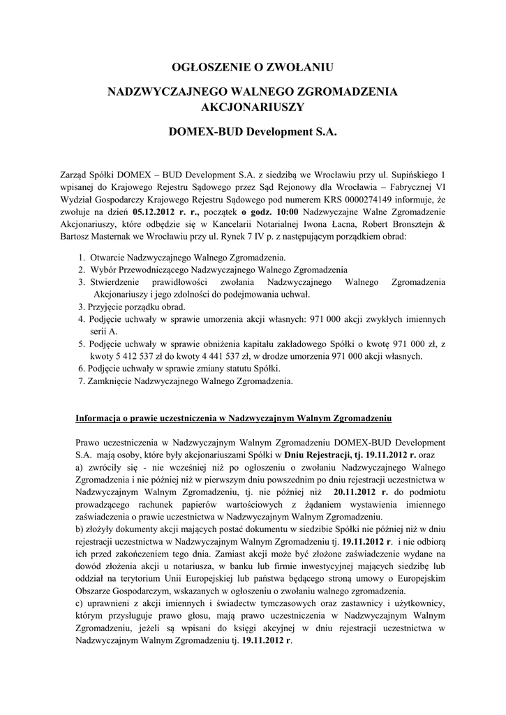 OGŁOSZENIE O ZWOŁANIU NADZWYCZAJNEGO WALNEGO ZGROMADZENIA AKCJONARIUSZY DOMEX-BUD Development S.A. Zarząd Spółki DOMEX – BUD Development S.A. z siedzibą we Wrocławiu przy ul. Supińskiego 1 wpisanej do Krajowego Rejestru Sądowego przez Sąd Rejonowy dla Wrocławia – Fabrycznej VI Wydział Gospodarczy Krajowego Rejestru Sądowego pod numerem KRS 0000274149 informuje, że zwołuje na dzień 05.12.2012 r. r., początek o godz. 10:00 Nadzwyczajne Walne Zgromadzenie Akcjonariuszy, które odbędzie się w Kancelarii Notarialnej Iwona Łacna, Robert Bronsztejn & Bartosz Masternak we Wrocławiu przy ul. Rynek 7 IV p. z następującym porządkiem obrad: 1. Otwarcie Nadzwyczajnego Walnego Zgromadzenia. 2. Wybór Przewodniczącego Nadzwyczajnego Walnego Zgromadzenia 3. Stwierdzenie prawidłowości zwołania Nadzwyczajnego Walnego Zgromadzenia Akcjonariuszy i jego zdolności do podejmowania uchwał. 3. Przyjęcie porządku obrad. 4. Podjęcie uchwały w sprawie umorzenia akcji własnych: 971 000 akcji zwykłych imiennych serii A. 5. Podjęcie uchwały w sprawie obniżenia kapitału zakładowego Spółki o kwotę 971 000 zł, z kwoty 5 412 537 zł do kwoty 4 441 537 zł, w drodze umorzenia 971 000 akcji własnych. 6. Podjęcie uchwały w sprawie zmiany statutu Spółki. 7. Zamknięcie Nadzwyczajnego Walnego Zgromadzenia. Informacja o prawie uczestniczenia w Nadzwyczajnym Walnym Zgromadzeniu Prawo uczestniczenia w Nadzwyczajnym Walnym Zgromadzeniu DOMEX-BUD Development S.A. mają osoby, które były akcjonariuszami Spółki w Dniu Rejestracji, tj. 19.11.2012 r. oraz a) zwróciły się - nie wcześniej niż po ogłoszeniu o zwołaniu Nadzwyczajnego Walnego Zgromadzenia i nie później niż w pierwszym dniu powszednim po dniu rejestracji uczestnictwa w Nadzwyczajnym Walnym Zgromadzeniu, tj. nie później niż 20.11.2012 r. do podmiotu prowadzącego rachunek papierów wartościowych z żądaniem wystawienia imiennego zaświadczenia o prawie uczestnictwa w Nadzwyczajnym Walnym Zgromadzeniu. b) złożyły dokumenty akcji mających postać dokumentu w siedzibie Spółki nie później niż w dniu rejestracji uczestnictwa w Nadzwyczajnym Walnym Zgromadzeniu tj. 19.11.2012 r. i nie odbiorą ich przed zakończeniem tego dnia. Zamiast akcji może być złożone zaświadczenie wydane na dowód złożenia akcji u notariusza, w banku lub firmie inwestycyjnej mających siedzibę lub oddział na terytorium Unii Europejskiej lub państwa będącego stroną umowy o Europejskim Obszarze Gospodarczym, wskazanych w ogłoszeniu o zwołaniu walnego zgromadzenia. c) uprawnieni z akcji imiennych i świadectw tymczasowych oraz zastawnicy i użytkownicy, którym przysługuje prawo głosu, mają prawo uczestniczenia w Nadzwyczajnym Walnym Zgromadzeniu, jeżeli są wpisani do księgi akcyjnej w dniu rejestracji uczestnictwa w Nadzwyczajnym Walnym Zgromadzeniu tj. 19.11.2012 r. Listę uprawnionych z akcji na okaziciela do uczestnictwa w Nadzwyczajnym Walnym Zgromadzeniu Spółka ustali na podstawie wykazu sporządzonego przez podmiot prowadzący depozyt papierów wartościowych zgodnie z przepisami o obrocie instrumentami finansowymi i na podstawie akcji mających postać dokumentu złożonych w spółce. Podmiot prowadzący depozyt papierów wartościowych sporządza wykaz na podstawie wykazów przekazywanych nie później niż na dwanaście dni przed datą Nadzwyczajnego Walnego Zgromadzenia przez podmioty uprawnione zgodnie z przepisami o obrocie instrumentami finansowymi. Podstawą sporządzenia wykazów przekazywanych podmiotowi prowadzącemu depozyt papierów wartościowych są wystawione zaświadczenia o prawie uczestnictwa w Nadzwyczajnym Walnym Zgromadzeniu Spółki. Lista akcjonariuszy uprawnionych do uczestnictwa w Nadzwyczajnym Walnym Zgromadzeniu, podpisana przez Zarząd, zawierająca imiona i nazwiska albo firmy (nazwy) uprawnionych, ich miejsce zamieszkania (siedzibę), liczbę, rodzaj i numery akcji oraz liczbę przysługujących im głosów zostanie wyłożona w lokalu Zarządu pod adresem ul. Supińskiego 1, 52-317 Wrocław, przez trzy dni powszednie przed odbyciem Nadzwyczajnego Walnego Zgromadzenia, tj. 30.11.2012 r., 03.12.2012 r., 04.12.2012 r. Akcjonariusz Spółki może przeglądać listę akcjonariuszy w lokalu Zarządu oraz żądać odpisu listy za zwrotem kosztów jego sporządzenia. Akcjonariusz Spółki może żądać przesłania mu listy akcjonariuszy uprawnionych do udziału w Nadzwyczajnym Walnym Zgromadzeniu nieodpłatnie pocztą elektroniczną, podając adres poczty elektronicznej, na który lista powinna być wysłana. Spółka może zażądać udokumentowania, iż składający takowe żądanie Akcjonariusz jest nim faktycznie w dniu złożenia powyższego żądania, jeśli nie znajduje się on na liście Akcjonariuszy uprawnionych do udziału w Nadzwyczajnym Walnym Zgromadzeniu. Opis procedur dotyczących uczestniczenia w walnym zgromadzeniu i wykonywania prawa głosu Prawo akcjonariusza do żądania umieszczenia określonych spraw w porządku obrad Walnego Zgromadzenia Akcjonariusz lub akcjonariusze, którzy reprezentują co najmniej 1/20 kapitału zakładowego Spółki mogą żądać umieszczenia określonych spraw w porządku obrad Walnego Zgromadzenia. Żądanie Akcjonariusza lub Akcjonariuszy powinno zostać zgłoszone Zarządowi Spółki w formie pisemnej lub w postaci elektronicznej nie później niż na dwadzieścia jeden dni przed wyznaczonym terminem Zgromadzenia, tj. nie później niż 14.11.2012 r. Żądanie powinno zawierać uzasadnienie lub projekt uchwały dotyczącej proponowanego punktu lub sprawy porządku obrad. Akcjonariusz lub Akcjonariusze żądający umieszczenia określonych spraw w porządku obrad muszą do powyższego żądania załączyć zaświadczenie /świadectwo depozytowe/, wystawione przez właściwy podmiot, potwierdzające stan posiadania przez Akcjonariusza lub Akcjonariuszy, wymaganej do złożenia powyższego żądania części kapitału zakłado