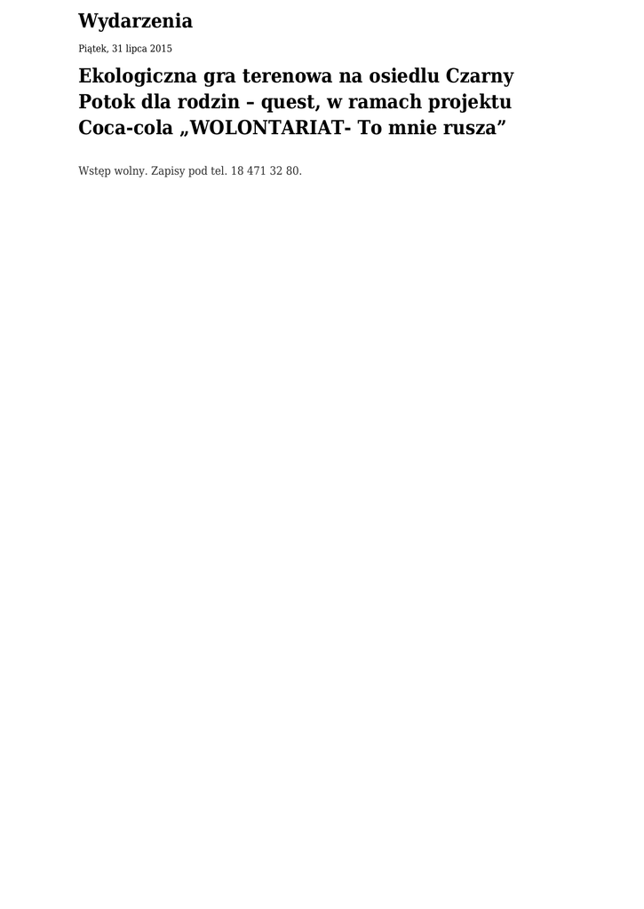 Wydarzenia Piątek, 31 lipca 2015 Ekologiczna gra terenowa na osiedlu Czarny Potok dla rodzin – quest, w ramach projektu Coca-cola „WOLONTARIAT- To mnie rusza” Wstęp wolny. Zapisy pod tel. 18 471 32 80.