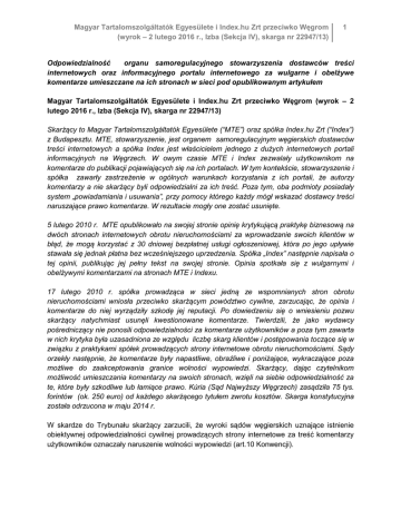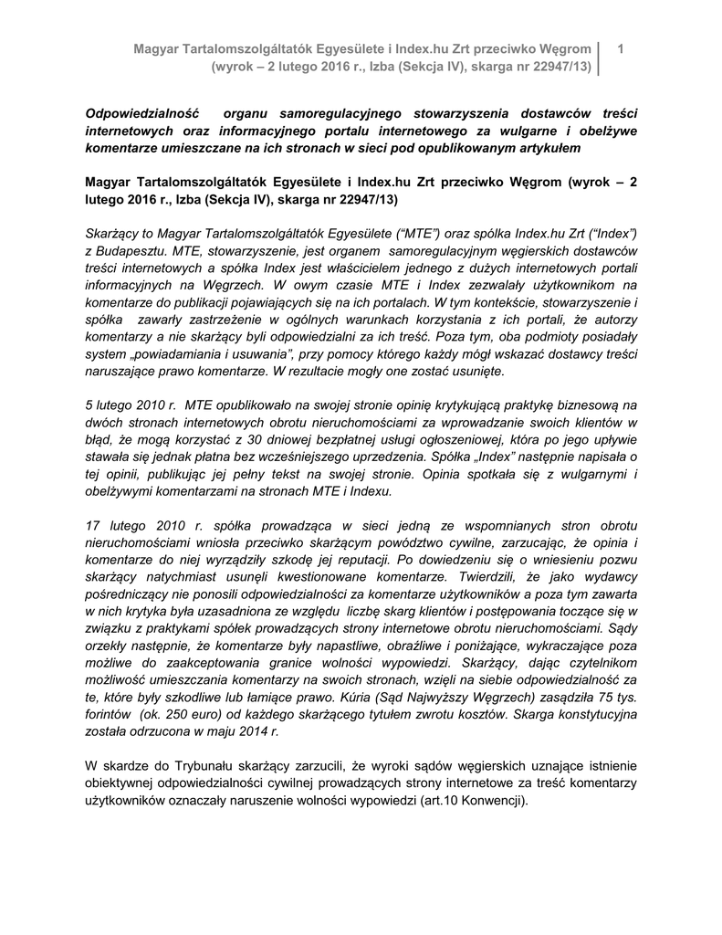 Magyar Tartalomszolgáltatók Egyesülete i Index.hu Zrt przeciwko Węgrom (wyrok – 2 lutego 2016 r., Izba (Sekcja IV), skarga nr 22947/13) 1 Odpowiedzialność organu samoregulacyjnego stowarzyszenia dostawców treści internetowych oraz informacyjnego portalu internetowego za wulgarne i obelżywe komentarze umieszczane na ich stronach w sieci pod opublikowanym artykułem Magyar Tartalomszolgáltatók Egyesülete i Index.hu Zrt przeciwko Węgrom (wyrok – 2 lutego 2016 r., Izba (Sekcja IV), skarga nr 22947/13) Skarżący to Magyar Tartalomszolgáltatók Egyesülete (“MTE”) oraz spólka Index.hu Zrt (“Index”) z Budapesztu. MTE, stowarzyszenie, jest organem samoregulacyjnym węgierskich dostawców treści internetowych a spółka Index jest właścicielem jednego z dużych internetowych portali informacyjnych na Węgrzech. W owym czasie MTE i Index zezwalały użytkownikom na komentarze do publikacji pojawiających się na ich portalach. W tym kontekście, stowarzyszenie i spółka zawarły zastrzeżenie w ogólnych warunkach korzystania z ich portali, że autorzy komentarzy a nie skarżący byli odpowiedzialni za ich treść. Poza tym, oba podmioty posiadały system „powiadamiania i usuwania”, przy pomocy którego każdy mógł wskazać dostawcy treści naruszające prawo komentarze. W rezultacie mogły one zostać usunięte. 5 lutego 2010 r. MTE opublikowało na swojej stronie opinię krytykującą praktykę biznesową na dwóch stronach internetowych obrotu nieruchomościami za wprowadzanie swoich klientów w błąd, że mogą korzystać z 30 dniowej bezpłatnej usługi ogłoszeniowej, która po jego upływie stawała się jednak płatna bez wcześniejszego uprzedzenia. Spółka „Index” następnie napisała o tej opinii, publikując jej pełny tekst na swojej stronie. Opinia spotkała się z wulgarnymi i obelżywymi komentarzami na stronach MTE i Indexu. 17 lutego 2010 r. spółka prowadząca w sieci jedną ze wspomnianych stron obrotu nieruchomościami wniosła przeciwko skarżącym powództwo cywilne, zarzucając, że opinia i komentarze do niej wyrządziły szkodę jej reputacji. Po dowiedzeniu się o wniesieniu pozwu skarżący natychmiast usunęli kwestionowane komentarze. Twierdzili, że jako wydawcy pośredniczący nie ponosili odpowiedzialności za komentarze użytkowników a poza tym zawarta w nich krytyka była uzasadniona ze względu liczbę skarg klientów i postępowania toczące się w związku z praktykami spółek prowadzących strony internetowe obrotu nieruchomościami. Sądy orzekły następnie, że komentarze były napastliwe, obraźliwe i poniżające, wykraczające poza możliwe do zaakceptowania granice wolności wypowiedzi. Skarżący, dając czytelnikom możliwość umieszczania komentarzy na swoich stronach, wzięli na siebie odpowiedzialność za te, które były szkodliwe lub łamiące prawo. Kúria (Sąd Najwyższy Węgrzech) zasądziła 75 tys. forintów (ok. 250 euro) od każdego skarżącego tytułem zwrotu kosztów. Skarga konstytucyjna została odrzucona w maju 2014 r. W skardze do Trybunału skarżący zarzucili, że wyroki sądów węgierskich uznające istnienie obiektywnej odpowiedzialności cywilnej prowadzących strony internetowe za treść komentarzy użytkowników oznaczały naruszenie wolności wypowiedzi (art.10 Konwencji). 2 Magyar Tartalomszolgáltatók Egyesülete i Index.hu Zrt przeciwko Węgrom (wyrok – 2 lutego 2016 r., Izba (Sekcja IV), skarga nr 22947/13) W tej sprawie doszło do ingerencji przewidzianej przez prawo i podjętej w uprawnionym celu ochrony praw innych osób. Przy ocenie jej konieczności w społeczeństwie demokratycznym Trybunał przypomniał obowiązujące zasady a ponadto podkreślił m.in., że ze względu na jego dostępność i zdolność gromadzenia i przekazywania ogromnej ilości informacji, Internet odgrywa ważną rolę we wzmacnianiu publicznego dostępu do wiadomości i generalnie w ułatwianiu rozpowszechniania informacji. Równocześnie, biorąc pod uwagę “obowiązki i odpowiedzialność” dziennikarza, za ważny należy uważać potencjalny wpływ danego medium. Trybunał potwierdził poza tym, że prawo do ochrony dobrego imienia jest chronione w art.8 jako część prawa do poszanowania życia prywatnego. Art. 8 wchodzi jednak w grę dopiero, gdy atak na dobre imię osoby jest odpowiednio poważny i dokonany w sposób utrudniający osobiste korzystanie z prawa do poszanowania życia prywatnego. Przy badaniu istnienia potrzeby ingerencji w wolność wypowiedzi w społeczeństwie demokratycznym w interesie “ochrony dobrego imienia lub praw innych osób” Trybunał może stanąć przed potrzebą oceny, czy przy ochronie dwóch wartości zagwarantowanych w Konwencji mogących wejść w pewnych sprawach ze sobą w konflikt, a więc wolności wypowiedzi chronionej w art. 10 i prawa do poszanowania życia prywatnego wynikającego z art.8.władze zachowały właściwą równowagę. Trybunał stwierdził, że co do zasady prawa zagwarantowane w art. 8 i 10 zasługują na równą ochronę, a rezultat skargi nie powinien różnić się zależnie od tego, czy skarga została wniesiona do Trybunału na podstawie art. 10 Konwencji przez wydawcę obelżywego artykułu czy na podstawie art. 8 Konwencji przez osobę, której on dotyczył. Swoboda powinna być co do zasady taka sama w obu przypadkach. Przy ważeniu obu praw przez władze zgodnie z kryteriami wynikającymi z orzecznictwa tylko poważne względy pozwalają Trybunałowi zastąpić własnymi poglądy sądów krajowych. Innymi słowy, jeśli państwo musi zachować równowagę konkurujących interesów prywatnych lub praw Konwencji, ma zwykle w tym zakresie szeroką swobodę. W celu ustalenia, jakie standardy powinny być zastosowane w tej sprawie, Trybunał rozważył naturę praw skarżących do wypowiedzi, biorąc pod uwagę ich rolę w procesie komunikacji i konkretny interes chroniony w drodze ingerencji, a konkretnie prawa 