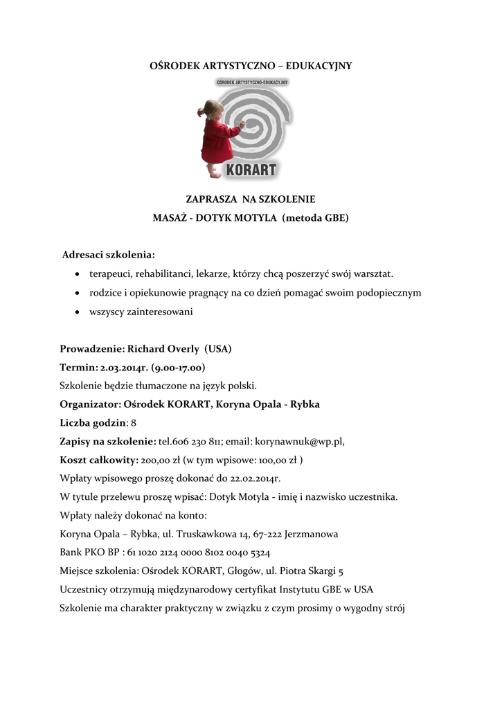 OŚRODEK ARTYSTYCZNO – EDUKACYJNY ZAPRASZA NA SZKOLENIE MASAŻ - DOTYK MOTYLA (metoda GBE) Adresaci szkolenia: terapeuci, rehabilitanci, lekarze, którzy chcą poszerzyć swój warsztat. rodzice i opiekunowie pragnący na co dzień pomagać swoim podopiecznym wszyscy zainteresowani Prowadzenie: Richard Overly (USA) Termin: 2.03.2014r. (9.00-17.00) Szkolenie będzie tłumaczone na język polski. Organizator: Ośrodek KORART, Koryna Opala - Rybka Liczba godzin: 8 Zapisy na szkolenie: tel.606 230 811; email: [email protected], Koszt całkowity: 200,00 zł (w tym wpisowe: 100,00 zł ) Wpłaty wpisowego proszę dokonać do 22.02.2014r. W tytule przelewu proszę wpisać: Dotyk Motyla - imię i nazwisko uczestnika. Wpłaty należy dokonać na konto: Koryna Opala – Rybka, ul. Truskawkowa 14, 67-222 Jerzmanowa Bank PKO BP : 61 1020 2124 0000 8102 0040 5324 Miejsce szkolenia: Ośrodek KORART, Głogów, ul. Piotra Skargi 5 Uczestnicy otrzymują międzynarodowy certyfikat Instytutu GBE w USA Szkolenie ma charakter praktyczny w związku z czym prosimy o wygodny strój Masaż Dotyk Motyla Autorką masażu jest lekarka, pediatra Ewa Reich, córka znanego psychologa, psychoanalityka, Wilhelma Reicha, uznanego za twórcę bioenergetyki. Nazwa masażu nawiązuje do subtelnego , płynnego dotyku - muśnięcia skrzydła motyla. Masaż jest relaksujący, uruchamia właściwy przepływ płynów limfatycznych oraz płynów rdzeniowo-mózgowych, przywraca właściwy przepływ energii w ośrodkach energetycznych ciała. Działa na poziomie psychosomatycznym. Technika ta jest elementem metody Gentle Bio-Energetics. Masaż może być wykorzystywany w pracy terapeutycznej z dziećmi i dorosłymi. Stosowany jest w przypadku; - przewlekłych chorób - nerwic i nadpobudliwości (ADHD) - nadmiernego napięcia mięśniowego (spastyka) - problemów ze snem - nadwrażliwości dotykowej (szczególnie zalecany u autystów) - kolkach jelitowych - braku więzi z rodzicem (adopcja) - zmęczenia - depresji - bólach Masaż może też być stosowany profilaktycznie w celu prawidłowego, energetycznego rozwoju noworodków i niemowląt. Zapraszam Koryna Opala- Rybka