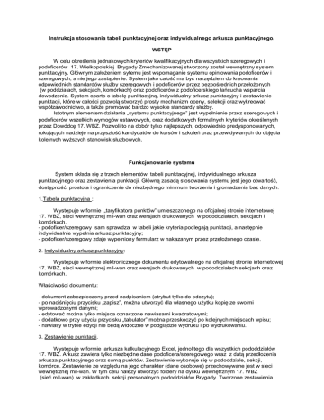 Instrukcja stosowania tabeli punktacyjnej oraz indywidualnego arkusza punktacyjnego. WSTĘP W celu określenia jednakowych kryteriów kwalifikacyjnych dla wszystkich szeregowych i podoficerów 17. Wielkopolskiej Brygady Zmechanizowanej stworzony został wewnętrzny system punktacyjny. Głównym założeniem sytemu jest wspomaganie systemu opiniowania podoficerów i szeregowych, a nie jego zastąpienie. System jako całość ma być narzędziem do kreowania odpowiednich standardów służby szeregowych i podoficerów przez bezpośrednich przełożonych (w poddziałach, sekcjach, komórkach) oraz podoficerów z podoficerskiego łańcucha wsparcia dowodzenia. System oparto o tabelę punktacyjną, indywidualny arkusz punktacyjny i zestawienie punktacji, które w całości pozwolą stworzyć prosty mechanizm oceny, selekcji oraz wykreować współzawodnictwo, a także promować bardzo wysokie standardy służby. Istotnym elementem działania „systemu punktacyjnego” jest wypełnienie przez szeregowych i podoficerów wszelkich wymogów ustawowych, oraz dodatkowych formalnych kryteriów określonych przez Dowódcę 17. WBZ. Pozwoli to na dobór tylko najlepszych, odpowiednio predysponowanych, rokujących nadzieje na przyszłość kandydatów do kursów i szkoleń oraz przewidywanych do objęcia kolejnych wyższych stanowisk służbowych. Funkcjonowanie systemu System składa się z trzech elementów: tabeli punktacyjnej, indywidualnego arkusza punktacyjnego oraz zestawienia punktacji. Główną zasadą stosowania systemu jest jego otwartość, dostępność, prostota i ograniczenie do niezbędnego minimum tworzenia i gromadzenia baz danych. 1.Tabela punktacyjna : Występuje w formie „taryfikatora punktów” umieszczonego na oficjalnej stronie internetowej 17. WBZ, sieci wewnętrznej mil-wan oraz wersjach drukowanych w pododdziałach, sekcjach i komórkach. - podoficer/szeregowy sam sprawdza w tabeli jakie kryteria podlegają punktacji, a następnie indywidualnie wypełnia arkusz punktacyjny; - podoficer/szeregowy zdaje wypełniony formularz w nakazanym przez przełożonego czasie. 2. Indywidualny arkusz punktacyjny: Występuje w formie elektronicznego dokumentu edytowalnego na oficjalnej stronie internetowej 17. WBZ, sieci wewnętrznej mil-wan oraz wersjach drukowanych w pododdziałach sekcjach oraz komórkach. Właściwości dokumentu: - dokument zabezpieczony przed nadpisaniem (atrybut tylko do odczytu); - po naciśnięciu przycisku „zapisz”, można utworzyć dla własnego użytku kopię ze swoimi wprowadzonymi danymi; - edytować można tylko miejsca oznaczone nawiasami kwadratowymi; - dodatkowo przy użyciu przycisku „tabulator” można przeskoczyć po kolejnych miejscach wpisu; - nawiasy w trybie edycji nie będą widoczne w podglądzie wydruku i po wydrukowaniu. 3. Zestawienie punktacji. Występuje w formie arkusza kalkulacyjnego Excel, jednolitego dla wszystkich pododdziałów 17. WBZ. Arkusz zawiera tylko niezbędne dane podoficera/szeregowego wraz z datą przedłożenia arkusza punktacyjnego oraz sumą punktów. Zestawienie wykonuje się w pododdziale, sekcji, komórce. Zestawienie ze względu na jego charakter (dane osobowe) przechowywane jest w sieci wewnętrznej mil-wan. W tym celu należy utworzyć foldery na dysku wewnętrznym 17. WBZ (sieć mil-wan) w zakładkach sekcji personalnych pododdziałów Brygady. Tworzone zestawienia należy przesłać do komórki personalnej batalionu/dywizjonu. Uprawnienia do modyfikacji ma tylko wyznaczony personel. Przełożeni oraz wyznaczone osoby funkcyjne mają jedynie prawo do odczytu danych bez ich modyfikacji. Algorytm stosowania systemu punktacyjnego - Przykład: szef kompanii/baterii itd. po otrzymaniu formularza z punktacją indywidualną umieszcza dane żołnierza (stopień, nazwisko, imię, pododdział, data wypełnienia oraz liczbę punktów) w folderze batalionowym. Dostęp do folderu mają wszyscy użytkownicy sieci mil-wan, ale zmiany mogą dokonywać tylko wyznaczone osoby funkcyjne. Wykorzystanie i stosowanie systemu punktacyjnego. System należy wykorzystywać w celach promowania, dokonywania oceny i weryfikacji podwładnych. Ma jedynie wspomagać wybór i ocenę indywidualną szeregowego/podoficera. Należy kierować się zasadą, że wytypowany do kursu, awansu lub dalszego rozwoju żołnierz przedstawia przełożonemu, komisji weryfikacyjnej lub innemu organowi powołanemu przez Dowódcę Brygady, stosowne dokumenty potwierdzające prawdziwość zawartych w indywidualnym arkuszu punktacyjnym danych. Weryfikacja danych powinna następować w obecności żołnierza podczas rozmowy służbowej. Dostarczanie oraz weryfikacja danych następuje bezpośrednio po zakończeniu opiniowania rocznego, nie później jednak niż do siedmiu dniu od zakończenia opiniowania. Dopuszcza się przedstawianie wspomnianych danych na żądanie przełożonego w innym terminie. W powyższym przypadku zawarte w formularzu dane muszą obejmować okres 12 miesięcy od daty wypełnienia. Podczas wypełniania danych formularza oraz weryfikacji należy przyjąć 12 miesięczny okres punktacyjny. System punktacyjny zawiera dane określające, które kryteria podlegają 12 miesięcznemu okresowi weryfikacji i punktacji. SYSTEM PUNKTACYJNY DLA PODOFICERÓW I SZEREGOWYCH Zasady Punktacyjne maksymalne punkty Marszobieg 3000/1000m lub Pływanie ciągłe ocena 3 = 5pkt. ocena 4 = 10 pkt. ocena 5 = 20 pkt. 20 Bieg wahadłowy 10 x10 / Koperta ocena 3 = 5pkt. ocena 4 = 10 pkt. ocena 5 = 20 pkt. 20 Ugięcia ramion /Podciąganie na drążku ocena 3 = 5pkt. ocena 4 = 10 pkt. ocena 5 = 20 pkt. 20 Skłony tułowia w przód w czasie 2 min. ocena 3 = 5pkt. ocena 4 = 10 pkt. ocena 5 = 20 pkt. 20 Sprawność fizyczna i wyszkolenie (*) Punktowane kryterium Uzyskanie WOSF Wyniki z ostatniego obowiązującego strzelania Wojskowa Odznaka Strzelecka Odznaczenia wojskowe 20 20 brązowa = 5pkt. srebrna = 10 pkt. złota = 15 pkt. 15 Krzyż Komandorski = 60 pkt. Krzyż Kaw