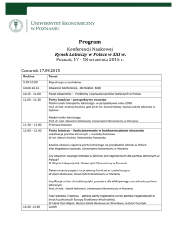Program Konferencji Naukowej Rynek Lotniczy w Polsce w XXI w. Poznań, 17 - 18 września 2015 r. Czwartek 17.09.2015 Godzina Temat 9.30-10.00 Rejestracja uczestników 10.00-10.15 Otwarcie Konferencji. JM Rektor, MIiR 10.15 - 11.00 Panel ekspertów – Problemy i wyzwania portów lotniczych w Polsce 11.00 - 11.30 Porty lotnicze – perspektywy rozwoju Polski rynek transportu lotniczego w perspektywie roku 2030. Prof. dr hab. Andrzej Ruciński, ppłk pil dr inż. Konrad Madej, Wyższa Szkoła Oficerska w Dęblinie Model rynku lotniczego. Prof. dr. hab. Sławomir Kalinowski, Uniwersytet Ekonomiczny w Poznaniu 11.30 – 12.00 Przerwa kawowa 12.00 – 13.30 Porty lotnicze – funkcjonowanie w konkurencyjnym otoczeniu Lokalizacja portów lotniczych – metody ilościowe. Dr inż. Marcin Kiciński, Politechnika Poznańska Analiza obszaru ciążenia portu lotniczego na przykładzie lotnisk w Polsce. Mgr Magdalena Kujawiak, Uniwersytet Ekonomiczny w Poznaniu Czy otwarcie nowego lotniska w Berlinie jest zagrożeniem dla portów lotniczych w Polsce? Dr Wojciech Augustyniak, Uniwersytet Ekonomiczny w Poznaniu Determinanty popytu na przewozy lotnicze w czasie kryzysu. Dr Jacek Jankiewicz, Uniwersytet Ekonomiczny w Poznaniu Implikacje zmian charakterystyki pasażera dla efektywnego zarzadzania portem lotniczym. Prof. dr hab. Marek Rekowski, Uniwersytet Ekonomiczny w Poznaniu Fazy wzrostu i regresu – polskie porty regionalne na tle portów regionalnych w innych państwach Europy Środkowo-Wschodniej. Dr Edyta Pijet-Migoń, Wyższa Szkoła Bankowa we Wrocławiu, Instytut Turystyki 13.30- 14.30 Lunch 14.30 – 16.00 Bieżące aspekty zarządzania portem lotniczym Analiza efektywności ekonomicznej i technicznej polskich regionalnych portów lotniczych. Dr Wojciech Augustyniak, Uniwersytet Ekonomiczny w Poznaniu Determinanty wykorzystania polskich lotnisk wojskowych przez lotnictwo cywilne. Płk dr hab. Bogdan Grenda, Akademia Obrony Narodowej Koncepcja budowy i wykorzystania infrastruktury transportowej zwłaszcza kolejowej dla lotnisk regionalnych na przykładzie polskich portów lotniczych. Mgr Magdalena Lubiecka-Budzanowska, Politechnika Warszawska Zintegrowany audyt bezpieczeństwa w porcie lotniczym Dr inż. Michał Kozłowski, Politechnika Warszawska Paweł Rotmański Port Lotniczy w Bydgoszczy Wymogi portu lotniczego wobec agenta handlingowego. Mgr Maciej Klóskowski, Uniwersytet Ekonomiczny w Poznaniu 16.00- 16.15 Przerwa kawowa 16.15 - 17.30 Port lotniczy a rozwój regionu Transport lotniczy w strategiach rozwoju województw i programach operacyjnych Prof. Ewa Pancer-Cybulska, Dr Łukasz Olipra, Uniwersytet Ekonomiczny we Wrocławiu Port lotniczy czynnikiem wzrostu regionu. Dr Jakub Gazda, Uniwersytet Ekonomiczny w Poznaniu Wpływ Portu Lotniczego we Wrocławia na gospodarkę miasta i regionu, analiza wydatków pasażerów. Dr Łukasz Olipra, Uniwersytet Ekonomiczny we Wrocławiu Konkurencja pomiędzy portami lotniczymi w Krakowie i Katowicach jako element rozwoju regionów. Dr Dariusz Tłoczyński, Uniwersytet Gdański Czy każdy region potrzebuje portu lotniczego? Kryteria decyzji inwestycyjnych w infrastrukturę lotniskową. Dr Sonia Huderek-Glapska, Uniwersytet Ekonomiczny w Poznaniu 17.30 Podsumowanie pierwszego dnia konferencji 19.00 Kolacja (MTP) Piątek 18.09.2015 9.30 Rejestracja uczestników 10.00 -10.15 Rozpoczęcie drugiego dnia Konferencji 10.15 - 11.00 Panel ekspertów – Linie lotnicze w Polsce dziś i jutro 11.00 - 12.15 Linie lotnicze dziś i jutro Linie lotnicze w Polsce w latach 1990-2015. Analiza upadłych i nadal funkcjonujących polskich przewoźników. Mgr Olesia Iefremova, Wyższa Szkoła Informatyki i Zarządzania w Rzeszowie Dostępność siatki połączeń transportu lotniczego w krajach centralnej, wschodniej i południowo- wschodniej Europy. Dr Paweł Zagrajek, Urząd Lotnictwa Cywilnego Flota przewoźników lotniczych operujących na rynku polskim – struktura, tendencje, wyzwania. Mgr Krzysztof Melski Uniwersytet Ekonomiczny w Poznaniu SESAR (Jednolita Europejska Przestrzeń Powietrzna) Polska Agencja Żeglugi Powietrznej Wybrane aspekty integracji lotów załogowych i bezzałogowych we wspólnej przestrzeni powietrznej. Prof. dr hab. Marek Orkisz, Dr inż. Andrzej Majka, Politechnika Rzeszowska 12.15 – 12.30 Przerwa kawowa 12.30 – 13.30 Linie lotnicze – problemy i wyzwania Motywy i cele zastosowania benchmarkingu w transporcie lotniczym na przykładzie PLL LOT. Dr Beata Gierczak, Uniwersytet Rzeszowski Niekonwencjonalne strategie biletowe- szanse i zagrożenia. Mgr inż. Magdalena Wierzbińska, Politechnika Warszawska Wpływ wybranych czynności eksploatacyjnych na koszt operacyjny linii lotniczej i bezpieczeństwo latania na przykładzie lotniczego silnika turbowentylatorowego. Dr inż. Paweł Głowacki, Instytut Lotnictwa Perspektywy rozwoju transportu małymi samolotami. Prof. dr hab. Marek Orkisz, Dr inż. Andrzej Majka, Politechnika Rzeszowska 13.30- 13.45 Podsumowanie Konferencji