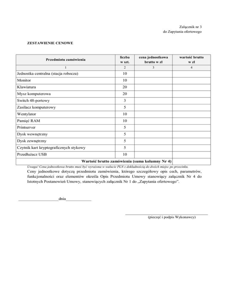 Załącznik nr 3 do Zapytania ofertowego ZESTAWIENIE CENOWE Przedmiotu zamówienia liczba w szt. cena jednostkowa brutto w zł wartość brutto w zł 1 2 3 4 Jednostka centralna (stacja robocza) 10 Monitor 10 Klawiatura 20 Mysz komputerowa 20 Switch 48-portowy 3 Zasilacz komputerowy 5 Wentylator 10 Pamięć RAM 10 Printserver 5 Dysk wewnętrzny 5 Dysk zewnętrzny 5 Czytnik kart kryptograficznych stykowy 5 Przedłużacz USB 10 Wartość brutto zamówienia (suma kolumny Nr 4) Uwaga! Cena jednostkowa brutto musi być wyrażona w walucie PLN z dokładnością do dwóch miejsc po przecinku. Ceny jednostkowe dotyczą przedmiotu zamówienia, którego szczegółowy opis cech, parametrów, funkcjonalności oraz elementów określa Opis Przedmiotu Umowy stanowiący załącznik Nr 4 do Istotnych Postanowień Umowy, stanowiących załącznik Nr 1 do „Zapytania ofertowego”. ___________________dnia____________ _______________________________________ (pieczęć i podpis Wykonawcy)