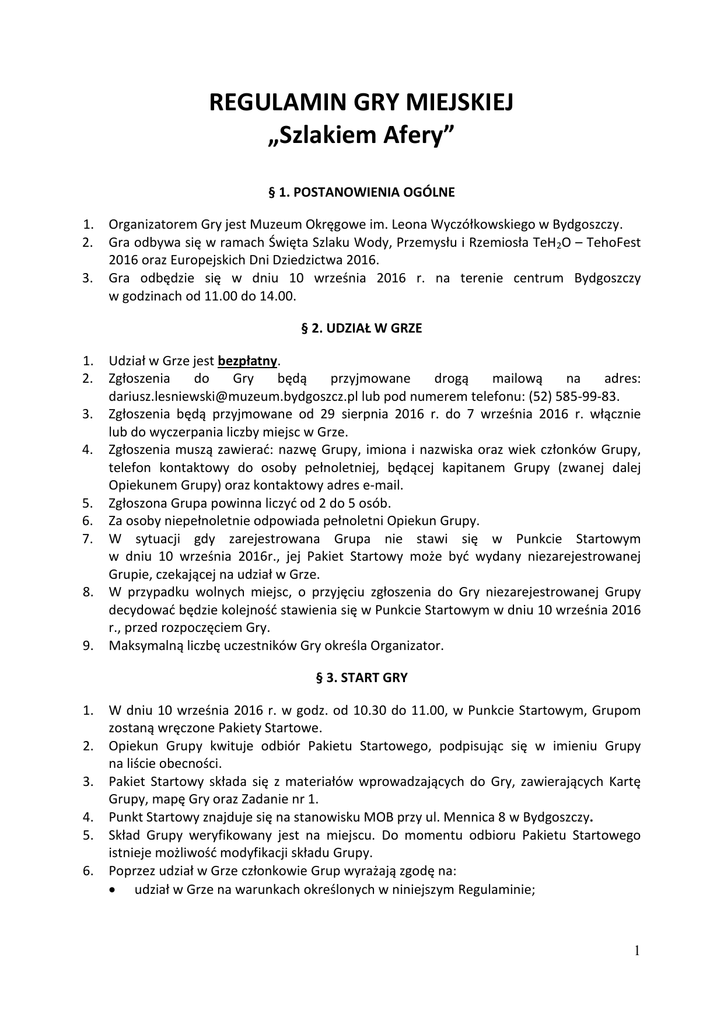 REGULAMIN GRY MIEJSKIEJ „Szlakiem Afery” § 1. POSTANOWIENIA OGÓLNE 1. Organizatorem Gry jest Muzeum Okręgowe im. Leona Wyczółkowskiego w Bydgoszczy. 2. Gra odbywa się w ramach Święta Szlaku Wody, Przemysłu i Rzemiosła TeH2O – TehoFest 2016 oraz Europejskich Dni Dziedzictwa 2016. 3. Gra odbędzie się w dniu 10 września 2016 r. na terenie centrum Bydgoszczy w godzinach od 11.00 do 14.00. § 2. UDZIAŁ W GRZE 1. 2. 3. 4. 5. 6. 7. 8. 9. Udział w Grze jest bezpłatny. Zgłoszenia do Gry będą przyjmowane drogą mailową na adres: [email protected] lub pod numerem telefonu: (52) 585-99-83. Zgłoszenia będą przyjmowane od 29 sierpnia 2016 r. do 7 września 2016 r. włącznie lub do wyczerpania liczby miejsc w Grze. Zgłoszenia muszą zawierać: nazwę Grupy, imiona i nazwiska oraz wiek członków Grupy, telefon kontaktowy do osoby pełnoletniej, będącej kapitanem Grupy (zwanej dalej Opiekunem Grupy) oraz kontaktowy adres e-mail. Zgłoszona Grupa powinna liczyć od 2 do 5 osób. Za osoby niepełnoletnie odpowiada pełnoletni Opiekun Grupy. W sytuacji gdy zarejestrowana Grupa nie stawi się w Punkcie Startowym w dniu 10 września 2016r., jej Pakiet Startowy może być wydany niezarejestrowanej Grupie, czekającej na udział w Grze. W przypadku wolnych miejsc, o przyjęciu zgłoszenia do Gry niezarejestrowanej Grupy decydować będzie kolejność stawienia się w Punkcie Startowym w dniu 10 września 2016 r., przed rozpoczęciem Gry. Maksymalną liczbę uczestników Gry określa Organizator. § 3. START GRY 1. 2. 3. 4. 5. 6. W dniu 10 września 2016 r. w godz. od 10.30 do 11.00, w Punkcie Startowym, Grupom zostaną wręczone Pakiety Startowe. Opiekun Grupy kwituje odbiór Pakietu Startowego, podpisując się w imieniu Grupy na liście obecności. Pakiet Startowy składa się z materiałów wprowadzających do Gry, zawierających Kartę Grupy, mapę Gry oraz Zadanie nr 1. Punkt Startowy znajduje się na stanowisku MOB przy ul. Mennica 8 w Bydgoszczy. Skład Grupy weryfikowany jest na miejscu. Do momentu odbioru Pakietu Startowego istnieje możliwość modyfikacji składu Grupy. Poprzez udział w Grze członkowie Grup wyrażają zgodę na: udział w Grze na warunkach określonych w niniejszym Regulaminie; 1 7. przetwarzanie przez Organizatorów danych osobowych członków Grup w zakresie niezbędnym dla przeprowadzenia Gry (zgodnie z ustawą o ochronie danych osobowych z dnia 29.09.1997 (Dz.U. nr 133 poz. 883); opublikowanie na łamach prasy, w mediach (m. in. społecznościowych) oraz na stronie internetowej Organizatora materiałów z Gry. Start Gry przewidziany jest na dzień 10 września 2016 r. o godz. 11.00. Grupy ruszają na trasę Gry po sygnale Organizatora. § 4. PRZEBIEG GRY I ZADANIA 1. 2. 3. W trakcie Gry Grupy mogą korzystać z wszelkich pomocy (m. in. Internetu, książek, itp.). Po trasie Gry Grupy poruszają się wyłącznie pieszo. W imieniu Organizatora nad przebiegiem Gry czuwa Koordynator. Grupy w trakcie Gry mogą kontaktować się z Koordynatorem w sprawach dotyczących przebiegu Gry. 4. Zadaniem Grup jest wcielenie się w postać wskazaną przez Organizatora, zlokalizowanie Punktów Gry w oparciu o otrzymywane wskazówki oraz wykonanie wszystkich zadań przekazanych przez Animatorów na Punktach Gry. 5. Punkty Gry są obsługiwane przez Animatorów. Każdy Animator posiada dla każdej Grupy jedno zadanie do wykonania. Animatorzy są wolontariuszami wcielającymi się w postacie ze świata Gry. 6. Warunkiem przystąpienia Grupy do zadania jest weryfikacja przez Animatora, czy Grupa posiada Kartę Gry z naniesionym znakiem przez Animatora z wcześniejszego Punktu Gry. 7. Do zadań obsługiwanych przez Animatorów musi przystąpić Grupa w pełnym składzie. W przypadku, gdy Grupa (bez podania ważnej przyczyny) jest zdekompletowana Animator nie przekaże treści zadania. 8. O długości czasu na wykonanie Zadania decyduje Animator. Po zaliczeniu zadania należy uzyskać od Animatora znak naniesiony na Kartę Gry, świadczący o jego pozytywnym wykonaniu. 9. Wykonywanie zadań z Karty Gry będzie możliwe w dniu 10 września 2016 r. do godz. 13:45, tzn. do momentu opuszczenia Punktów Gry przez obsługujących je Animatorów. Czas pomiędzy zejściem animatorów ze stacji a końcem Gry uczestnicy muszą poświęcić na dotarcie do Punktu Finałowego. 10. Gra kończy się przekazaniem przez Grupy informacji zawartej w fabule Gry. Informację należy przekazać Koordynatorowi w Punkcie Finałowym Gry – na stanowisku MOB przy ul. Mennica 8 w Bydgoszczy. § 5. PUNKTACJA I DYSKWALIFIKACJA 1. 2. 3. 4. 5. 6. Za każde poprawnie wykonane zadanie Grupy otrzymują od Animatora znak na Karcie Gry. Liczba otrzymanych znaków jest tożsama z liczbą otrzymanych punktów. Karta Gry musi być podpisana imionami i nazwiskami wszystkich członków Grupy oraz–jeśli Grupa wyrazi taką chęć–wymyśloną na potrzeby Gry nazwą Grupy. Kolejność wykonywania zadań na trasie Gry jest ściśle określona. W przypadku, gdy na wykonanie zadania czeka inna Grupa, należy poczekać do momentu wykonania zadania przez wcześniejszą Grupę. W przypadku złamania Regulaminu Organizator może podjąć decyzję o dyskwalifikacji Grupy. Decyzja o dyskwalifikacji jest ostateczna. Dyskwalifikacja oznacza, że dana Grupa dostaje 0 punktów za całą Grę. 2 § 6. BEZPIECZEŃSTWO PODCZAS GRY 1. Gra toczy się w normalnym ruchu miejskim i zaleca się zachowanie szczególnej ostrożności podczas realizacji zadań. 2. Grupy biorą udział w Grze na własną odpowiedzialność. Organizator nie odpowiada za bezpieczeństwo uczestników. 3. Każdy z członków Gry powinien być w dobrym stanie zdrowia, umożliwiającym udział w zabawie oraz posiadać strój stosowny do aktualnej pogody. § 7. ZWYCIĘZCY GRY I NAGRODY 1. Trzem Grupom, które ukończą Grę jako pierwsze zostaną wręczone nagrody rzeczowe. Pozostałe Grupy otrzymają nagrody pocieszenia. Nagrody zostaną wręczone po zak