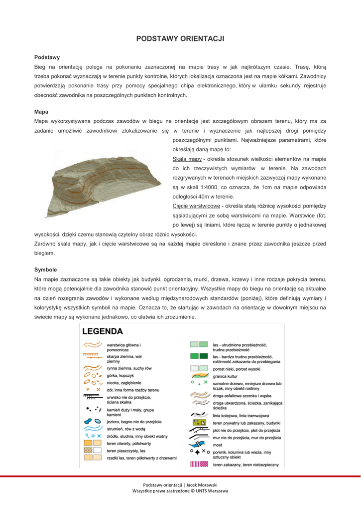 PODSTAWY ORIENTACJI Podstawy Bieg na orientację polega na pokonaniu zaznaczonej na mapie trasy w jak najkrótszym czasie. Trasę, którą trzeba pokonać wyznaczają w terenie punkty kontrolne, których lokalizacja oznaczona jest na mapie kółkami. Zawodnicy potwierdzają pokonanie trasy przy pomocy specjalnego chipa elektronicznego, który w ułamku sekundy rejestruje obecność zawodnika na poszczególnych punktach kontrolnych. Mapa Mapa wykorzystywana podczas zawodów w biegu na orientację jest szczegółowym obrazem terenu, który ma za zadanie umożliwić zawodnikowi zlokalizowanie się w terenie i wyznaczenie jak najlepszej drogi pomiędzy poszczególnymi punktami. Najważniejsze parametrami, które określają daną mapę to: Skala mapy - określa stosunek wielkości elementów na mapie do ich rzeczywistych wymiarów w terenie. Na zawodach rozgrywanych w terenach miejskich zazwyczaj mapy wykonane są w skali 1:4000, co oznacza, że 1cm na mapie odpowiada odległości 40m w terenie. Cięcie warstwicowe - określa stałą różnicę wysokości pomiędzy sąsiadującymi ze sobą warstwicami na mapie. Warstwice (fot. po lewej) są liniami, które łączą w terenie punkty o jednakowej wysokości, dzięki czemu stanowią czytelny obraz różnic wysokości. Zarówno skala mapy, jak i cięcie warstwicowe są na każdej mapie określone i znane przez zawodnika jeszcze przed biegiem. Symbole Na mapie zaznaczone są takie obiekty jak budynki, ogrodzenia, murki, drzewa, krzewy i inne rodzaje pokrycia terenu, które mogą potencjalnie dla zawodnika stanowić punkt orientacyjny. Wszystkie mapy do biegu na orientację są aktualne na dzień rozegrania zawodów i wykonane według międzynarodowych standardów (poniżej), które definiują wymiary i kolorystykę wszystkich symboli na mapie. Oznacza to, że startując w zawodach na orientację w dowolnym miejscu na świecie mapy są wykonane jednakowo, co ułatwia ich zrozumienie. Podstawy orientacji | Jacek Morawski Wszystkie prawa zastrzeżone © UNTS Warszawa Przekraczanie obiektów Pierwsza i najważniejsza zasada dla map do sprinterskiego (miejskiego) biegu na orientację to podział obiektów na takie, które możemy przekraczać i na takie, których przekraczać nie wolno. Oznacza to, że zawodnik nie może przekroczyć obiektu, który na mapie został oznaczony jako "nieprzekraczalny", bez względu na to, czy jest to fizycznie wykonalne, czy nie. Powyższa zasada została zaimplementowana z uwagi na trudność w określeniu kiedy dany obiekt staje się niemożliwy do przekroczenia (np. ogrodzenie, mur, strumień), a także wynika z faktu, że w terenach zurbanizowanych często występują fragmenty terenu, gdzie wstęp jest prawnie zabroniony. To umiejętność nawigacji w terenie powinna decydować o tym, kto jest lepszy, a nie umiejętność przeskakiwania przez płoty. Zgodnie z przepisami, każdy zawodnik, który złamie powyższą zasadę powinien zostać zdyskwalifikowany. Trasa Trasa, którą każdy zawodnik musi pokonać zaznaczona jest na mapie specjalnymi symbolami w kolorze purpurowym lub fioletowym. Miejsce, z którego zawodnik startuje, oznaczone jest na mapie równobocznym trójkątem. Punkty kontrolne są kółkami połączonymi ze sobą ciągłymi liniami, natomiast meta to kółko podwójne. Obowiązkiem zawodnika jest znalezienie wszystkich punktów Podstawy orientacji | Jacek Morawski Wszystkie prawa zastrzeżone © UNTS Warszawa kontrolnych zgodnie z kolejnością określoną na mapie, a na końcu dotarcie do mety. Oprócz numeru oznaczającego kolejność potwierdzania, każdy punkt ma swój kod, który umieszczony jest zarówno na mapie, jak i na punkcie kontrolnym. Pozwala to jednoznacznie stwierdzić, czy punkt, do którego dotarliśmy to ten, którego szukamy, czy inny. Opisy punktów kontrolnych Ważnym elementem na mapie są naniesione w formie tabeli z symbolami opisy punktów kontrolnych. Ich zadaniem jest przekazanie szczegółowej informacji dotyczącej usytuowania punktu kontrolnego. Jest to szczególnie przydatne na przykład, gdy punkt jest zlokalizowany w rogu wysokiego muru, co w przypadku dotarcia do niego od przeciwnej strony muru grozi koniecznością powrotu i jego obiegnięciem. W takiej sytuacji opis da nam cenną informacje, czy punkt "stoi" wewnątrz muru, czy po jego zewnętrznej stronie. Przykładowa mapa z zaznaczoną trasą Punkt kontrolny Punkt kontrolny zawsze zlokalizowany jest przy obiekcie, który znajduje się w centrum kółka narysowanego na mapie. Składa się ze stojaka, na którym zawieszony jest pomarańczowo-biały lampion o wymiarach boku 30x30cm, oraz ze stacji SPORTident, która służy do potwierdzenia obecności na punkcie. Każdy punkt oznaczony jest swoim kodem, który powinien widnieć zarówno na stojaku, jak i na stacji SPORTident tak, aby zawodnik mógł się upewnić, że dotarł do właściwego punktu. Podstawy orientacji | Jacek Morawski Wszystkie prawa zastrzeżone © UNTS Warszawa System SPORTident (SI) SPORTident to elektroniczny system potwierdzania punktów kontrolnych. Każdy zawodnik przed startem otrzymuje chip, który jest mu niezbędny do prawidłowego pokonania trasy. W momencie dobiegnięcia do punktu, zawodnik musi włożyć swoją kartę SPORTident do stacji, która w ułamku sekundy zapisze jego obecność na danym punkcie. Dowodem prawidłowego potwierdzenia punktu jest sygnał dźwiękowy w postaci "piknięcia" oraz sygnał wizualny, czyli migająca na czerwono dioda na stacji SI. Po zaliczeniu jednego punktu można biec dalej... Filozofia BnO Bieg na orientację stanowi doskonałą propozycję dla osób, które chcą połączyć aktywność fizyczną z czymś więcej. Tym, co stanowi największe wyzwanie jest wszystkich umiejętność punktów jednoczesnym znalezienia kontrolnych zachowaniu dużej przy prędkości biegu. Wiąże się to koniecznością szybkiej nawigacji właściwego w terenie wariantu połączoną dotarcia z wyborem do kolejnyc