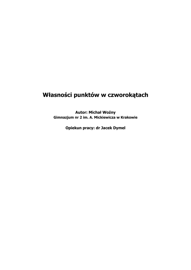 Własności punktów w czworokątach Autor: Michał Woźny Gimnazjum nr 2 im. A. Mickiewicza w Krakowie Opiekun pracy: dr Jacek Dymel Spis treści 1. Wstęp 2. Badanie punktów będących środkami boków w czworokącie o prostopadłych przekątnych 3. Badanie własności punktów będących rzutami prostokątnymi punktu przecięcia się przekątnych na boki w czworokącie o prostopadłych przekątnych 4. Badanie własności punktów będących przecięciami symedian z bokami czworokąta o prostopadłych przekątnych 5. Bibliografia str. 3 str. 4 str. 6 str. 8 str. 11 str. 2 1. Wstęp Niniejsza praca jest zbiorem moich badań nad własnościami punktów w czworokątach o prostopadłych przekątnych w oparciu o artykuł z pewnego angielskiego portalu geometrycznego. Przedstawione poniżej przykłady są tylko kilkoma najciekawszymi obserwacjami jakich dokonałem. Każda zaprezentowana własność jest poparty dowodem. Poza przedstawionymi w tej pracy własnościami badałem również zależności pomiędzy symetralnymi pewnych odcinków w czworokącie, okręgami opisanymi oraz dwusiecznymi. str. 3 2. Badanie własności punktów będących środkami boków w czworokącie o prostopadłych przekątnych Założenia: Przekątne czworokąta ABCD są prostopadłe. Punkty K, L, M i N leżą odpowiednio na środkach boków AB, BC, CD i DA. Twierdzenie: Punkty KLMN leżą na jednym okręgu. Dowód: Na początek weźmy pod uwagę trójkąt ABC i punkty K oraz L leżące odpowiednio na boku AB i BC. Poprowadźmy prostą równoległą do odcinka AC przechodzącą przez punkt K i przecinającą odcinek BP w punkcie X. Wtedy korzystając z twierdzenia Talesa otrzymujemy, że stosunek długości odcinków PX do XB wynosi 1 do 1, ponieważ stosunek odcinków AK do KB wynosi 1 do 1. Teraz analogiczne postępowanie stosujemy co do punktu L i odcinka BP na którym zaznaczamy punkt Y. Jak wcześniej z twierdzenia Talesa otrzymujemy, że PY do YB wynosi 1 do 1. Zatem punkty X i Y pokrywają się. Z tego wynika, że odcinek KL jest równoległy do odcinka AC. Analogiczne rozumowanie przeprowadzamy dla trójkątów CDA, BCD i DAB. Stąd i z faktu, że przekątne przecinają się pod kątem prostym otrzymujemy, że czworokąt KLMN jest prostokątem. Zatem na czworokącie KLMN można opisać okrąg, ponieważ suma kątów przy przeciwległych wierzchołkach wynosi 180°. Ponadto należy zauważyć, że w tym dowodzie wykazaliśmy również, że czworokąt ABCD jest prostokątem. █ Zauważmy, że dla czworokąta wklęsłego ABCD również da się opisać okrąg na punktach K, L, M, N, będących środkami boków czworokąta o prostopadłych przekątnych. str. 4 Dowód tej własności jest analogiczny do tego przedstawionego powyżej. Poniżej przedstawiam taką sytuację na rysunku. str. 5 3. Badanie własności punktów będących rzutami prostokątnymi punktu przecięcia się przekątnych na boki w czworokącie o prostopadłych przekątnych Założenia: Czworokąt ABCD jest wypukły, a jego przekątne są prostopadłe. Punkty K, L, M i N są rzutami punktu P, będącego punktem przecięcia się przekątnych, odpowiednio na boki AB, BC, CD i DA. Twierdzenie: Punkty KLMN leżą na jednym okręgu. Dowód: Na początku zauważmy, że na każdym z czterech czworokątów AKPN, BLPK, CMPL i DNPM możemy opisać okrąg, ponieważ suma kątów w przeciwległych wierzchołkach wynosi 180°. Teraz korzystając z twierdzenia o kącie wpisanym opartym na tym samym łuku otrzymujemy, że ∡NAP = ∡NKP, ∡LBP = ∡LKP, ∡LCP = ∡LMP, ∡NDP = ∡NMP. Teraz zauważmy, że 180° = 360° - ∡APD - ∡BPC = ∡NAP + ∡LBP + ∡LCP + ∡NDP = ∡NKP + ∡LKP + ∡LMP + ∡NMP = ∡LKN + ∡LMN. Kąty LKN i LMN są przeciwległymi kątami czworokąta KLMN i jak wykazaliśmy, sumują się do 180°. Zatem na czworokącie KLMN można opisać okrąg. █ Ponownie zauważmy, że dla czworokąta wklęsłego ABCD również da się opisać okrąg na punktach K, L, M, N, będących rzutami prostokątnymi punktu P na boki czworokąta. Aby to pokazać przeprowadźmy dowód. str. 6 Założenia: Czworokąt ABCD jest wklęsły, a jego przekątne są prostopadłe. Punkty K, L, M i N są rzutami punktu P, będącego punktem przecięcia się przekątnych, odpowiednio na boki AB, BC, CD i DA. Twierdzenie: Punkty KLMN leżą na jednym okręgu. Dowód: Na początek zauważmy, że na każdym z czterech czworokątów AKNP, BLPK, CPML i DNPM możemy opisać okrąg, ponieważ ∡AKP, ∡BKP, ∡BLP, ∡CLP, ∡CMP, ∡DMP, ∡DNP i ∡ANP mają miarę 90° i są oparte na odcinkach AP, BP, CP, DP będących średnicami. Teraz korzystając z twierdzenia o kącie wpisanym opartym na tym samym łuku otrzymujemy, że ∡MLK = ∡PLK – ∡PLM = ∡PBA – ∡PCM. Teraz policzmy miarę ∡MNK = 360° – ∡PNK – ∡PNM = 360° – ( 180° – ∡NPK – ∡PKN ) – ∡PDM = 360° – ( 180° – ∡PAK ) – ( 90° – ∡PCM ) = 360° – ( 180° – ( 90° – ∡PBA )) – ( 90° – ∡PCM ) = 360° – ( 90° + ∡PBA ) – 90° + ∡PCM = 180° + ∡PCM - ∡PBA. Zauważmy teraz, że ∡MLK + ∡MNK = ∡PBA – ∡PCM + 180° + ∡PCM - ∡PBA = 180°. Zatem na czworokącie KLMN można opisać okrąg. █ str. 7 4. Badanie własności punktów będących przecięciami symedian z bokami czworokąta o prostopadłych przekątnych Założenia: Przekątne czworokąta ABCD są prostopadłe. Punkty K, L, M i N są odpowiednio punktami przecięć symedian z bokami AB, BC, CD i DA. Twierdzenie: Punkty KLMN leżą na jednym okręgu. Dowód: Dowód przeprowadzimy przy pomocy geometrii analitycznej. Wstawmy nasz czworokąt w układ współrzędnych w taki sposób, aby punkt P znajdował się w punkcie ( 0, 0 ), zaś punkty A, B, C i D odpowiednio w ( 0, a ), ( b, o ), ( 0, c ), ( d, o ). Oznaczmy przez X i Y rzut prostokątny punktu N na odcinki DP i AP. Teraz korzystając z cechy symediany otrzymujemy, że: = = + = | | | | 1 1+ = 1 | | 1+ | | str. 8 =